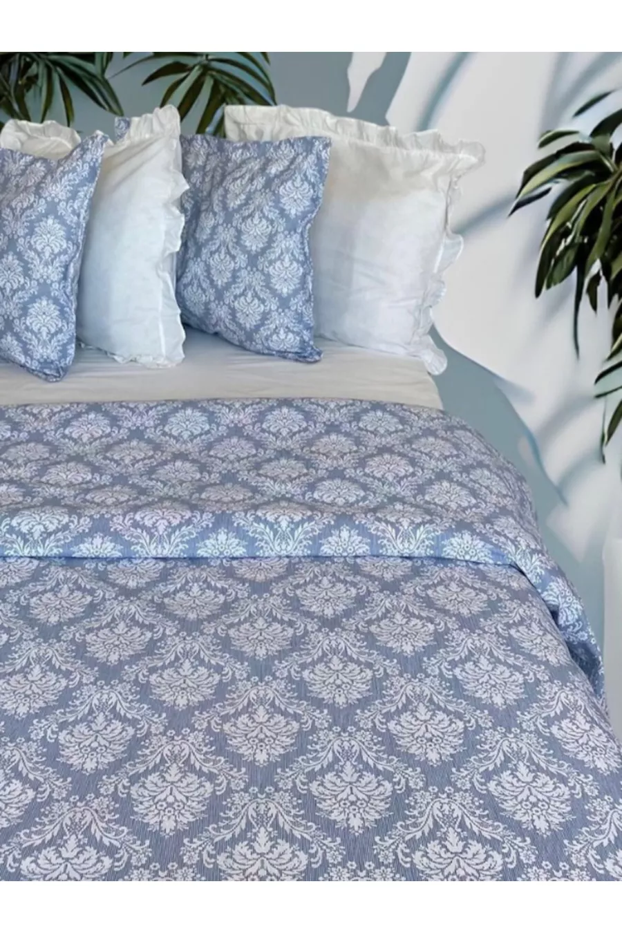 Луксозен спален комплект с дамаскиран десен в синьо - единичен комплект, първо качество