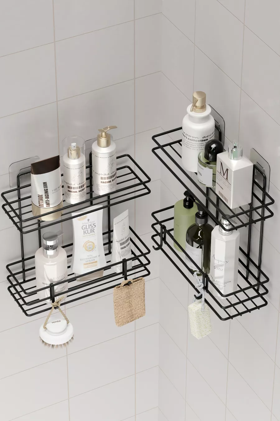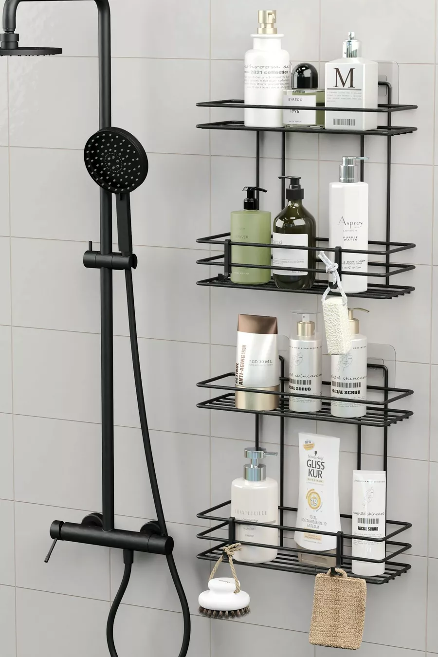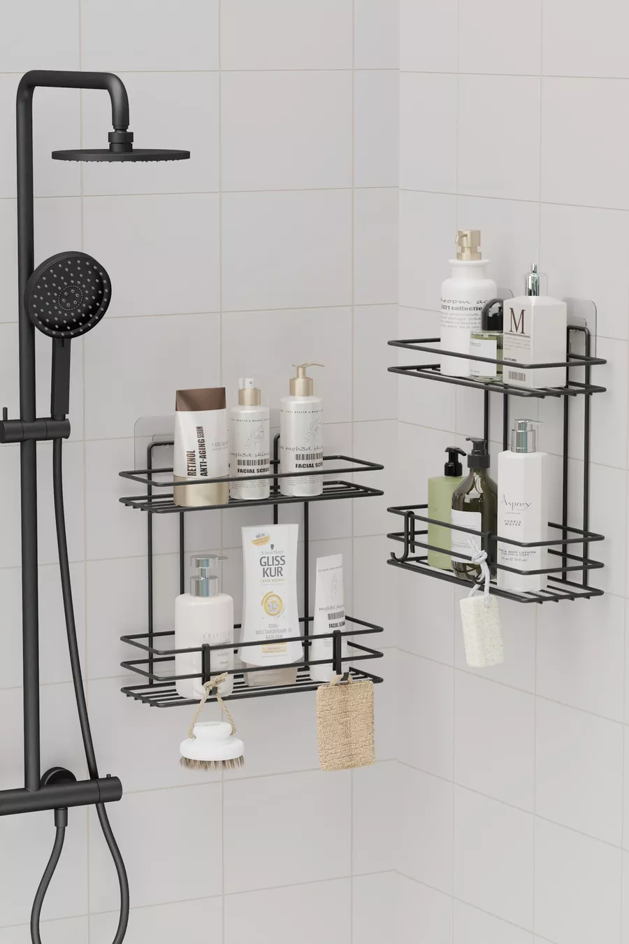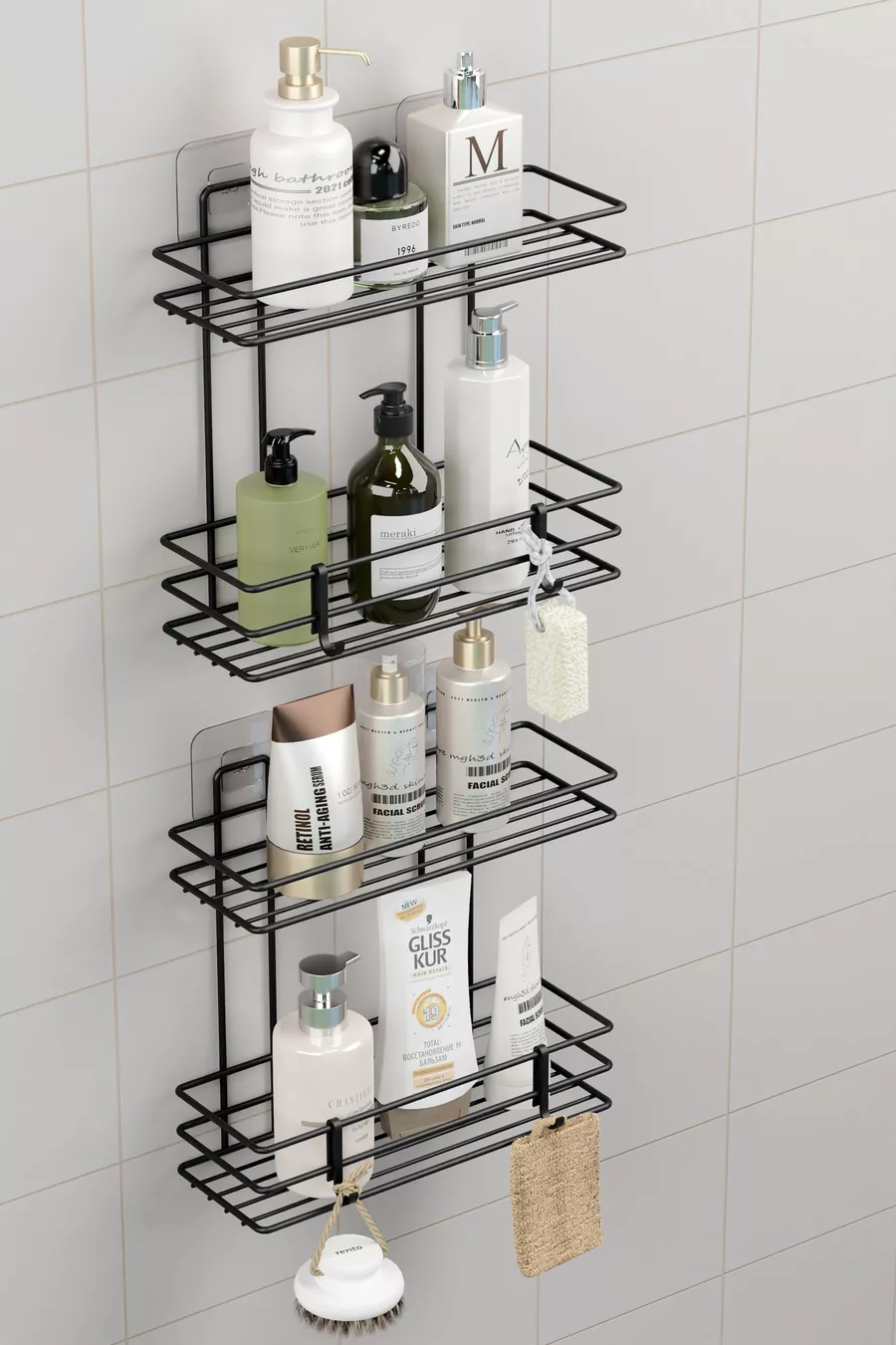 Многостепенна самозалепваща се баня рафт с 4 слоя, за душ шампоан, стенен организатор, черен