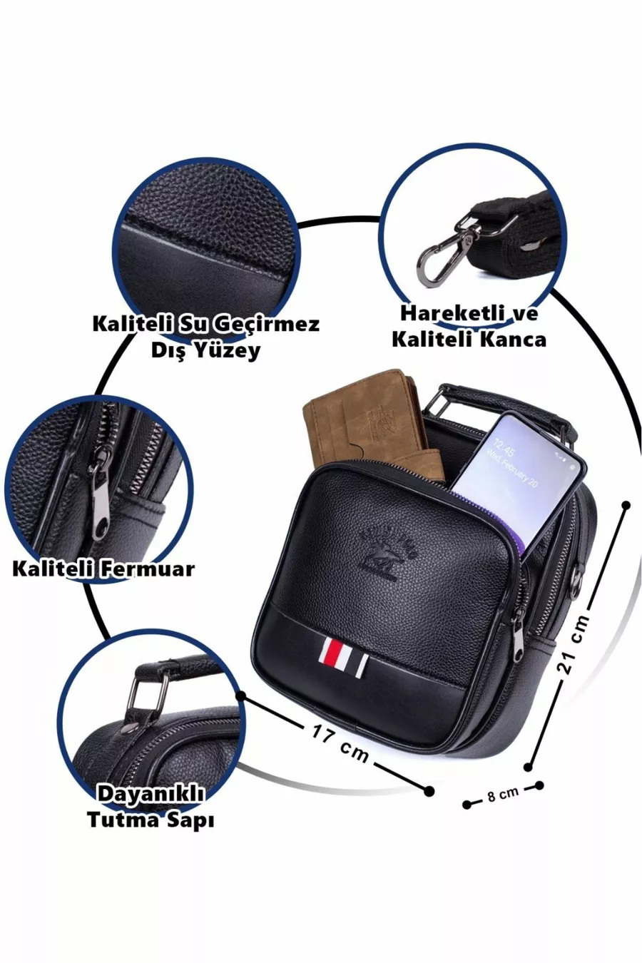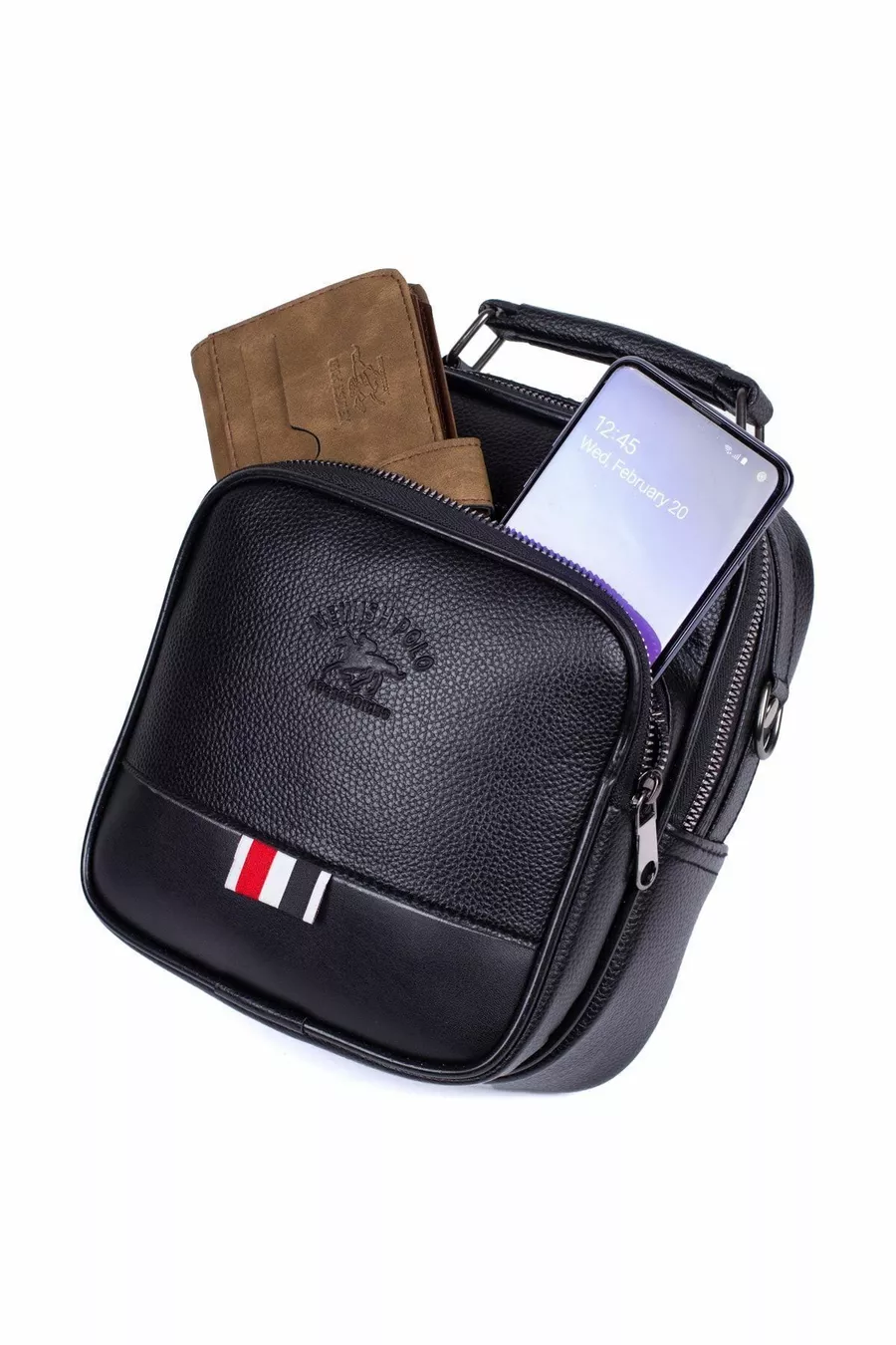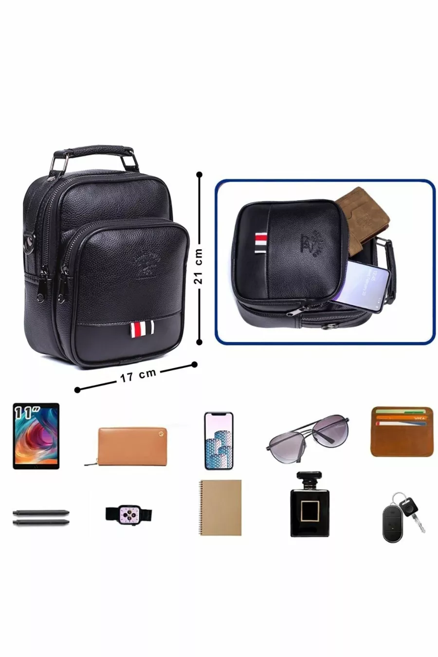 Мъжка веганска кожена чанта и чанта през рамо, мъжка чанта през рамо, черна с отделение за телефон (ГОЛЯМ РАЗМЕР)