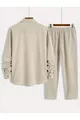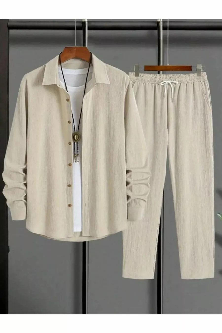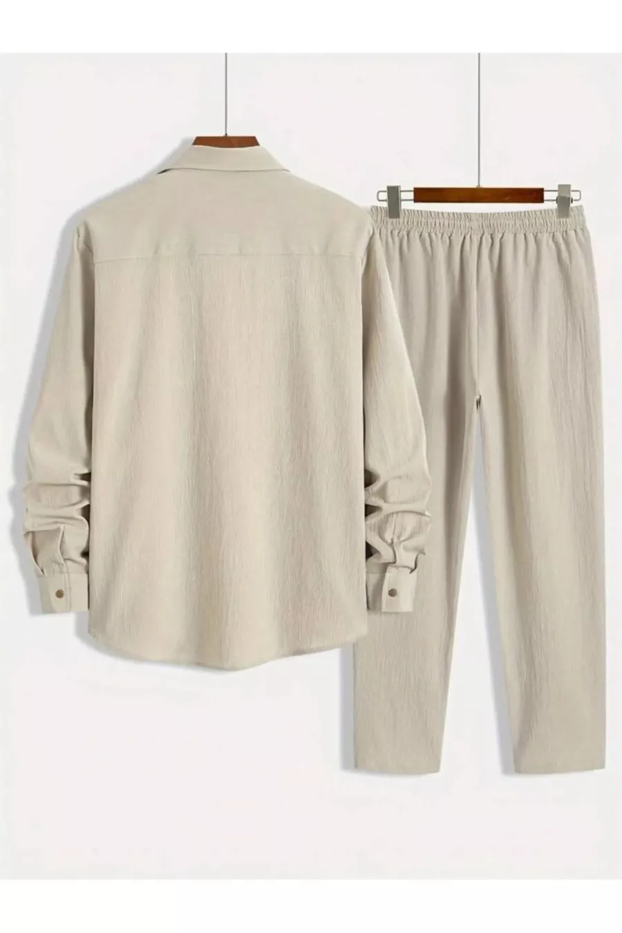 Мъжки бежов риза с дълъг ръкав и панталон от плюшено спортно облекло