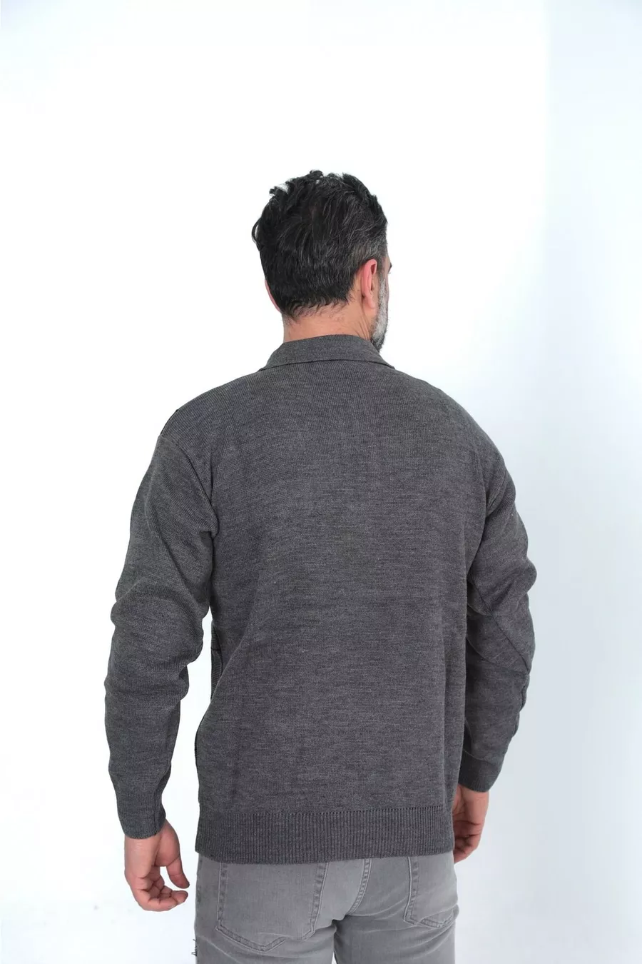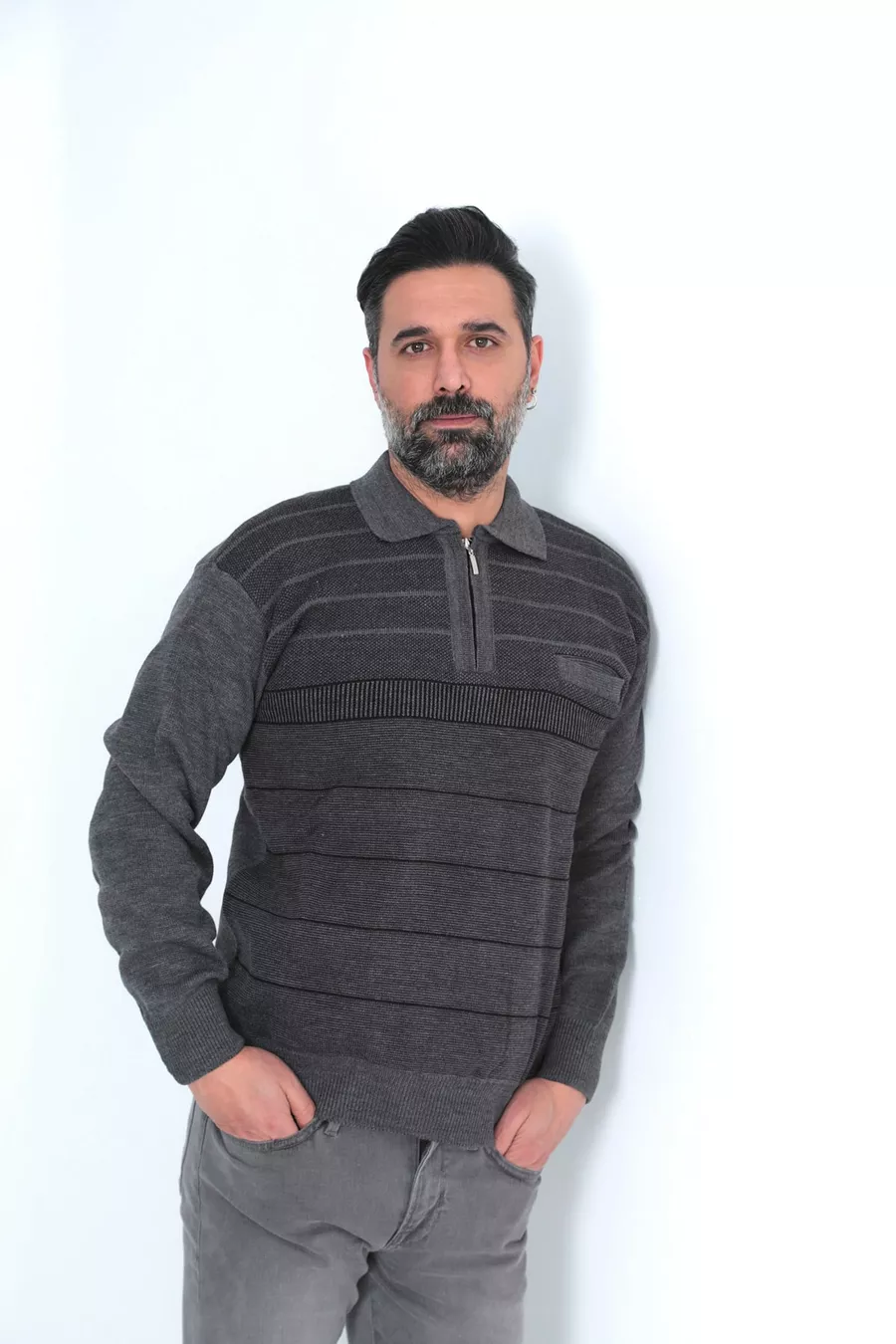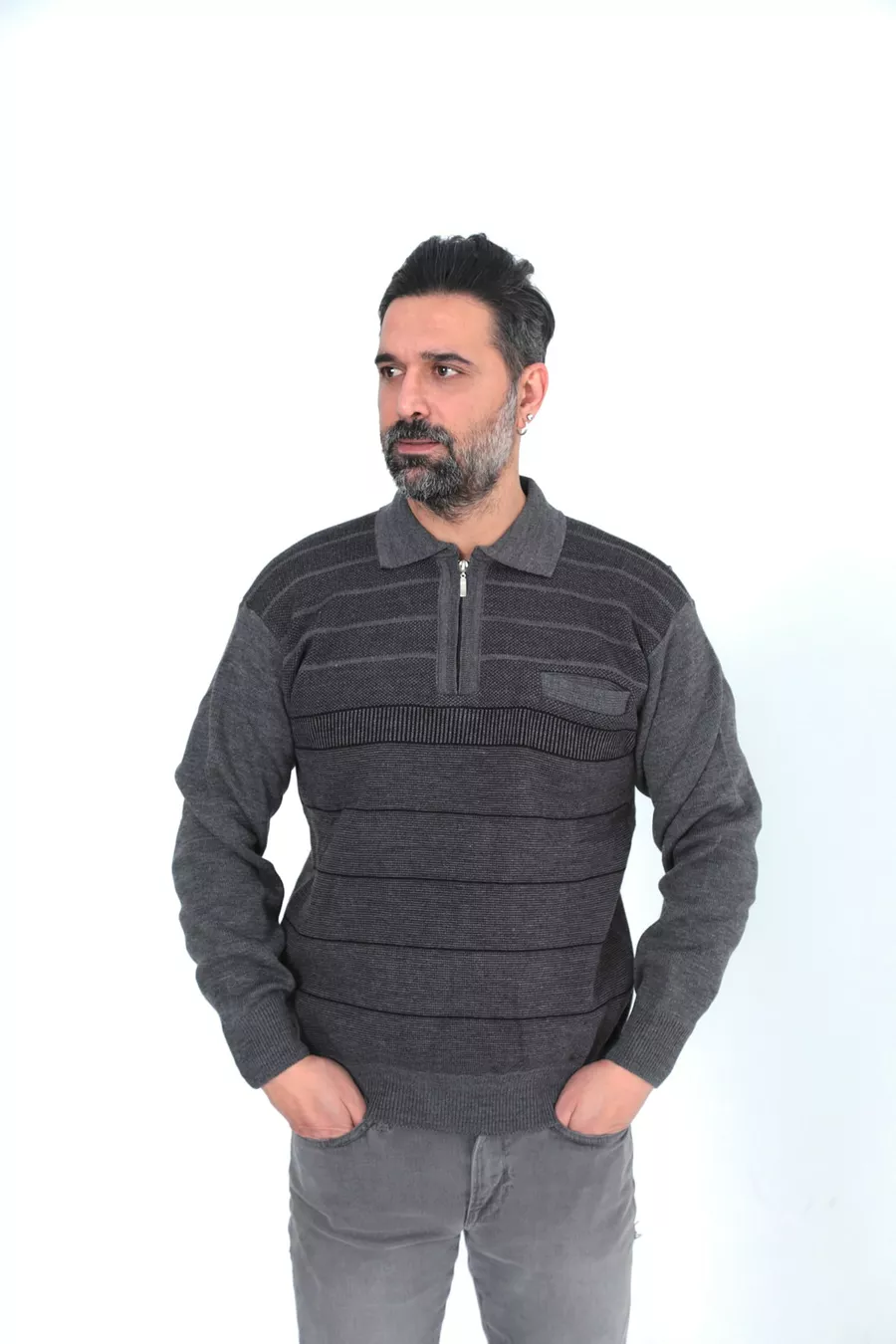 Мъжки зимен плетен пуловер с яка тип риза, акрилна прежда, райе и един джоб, дебел