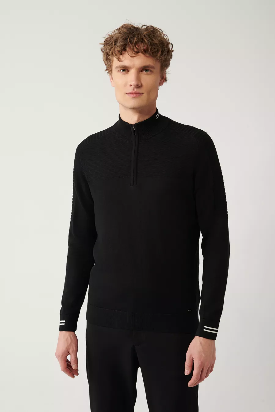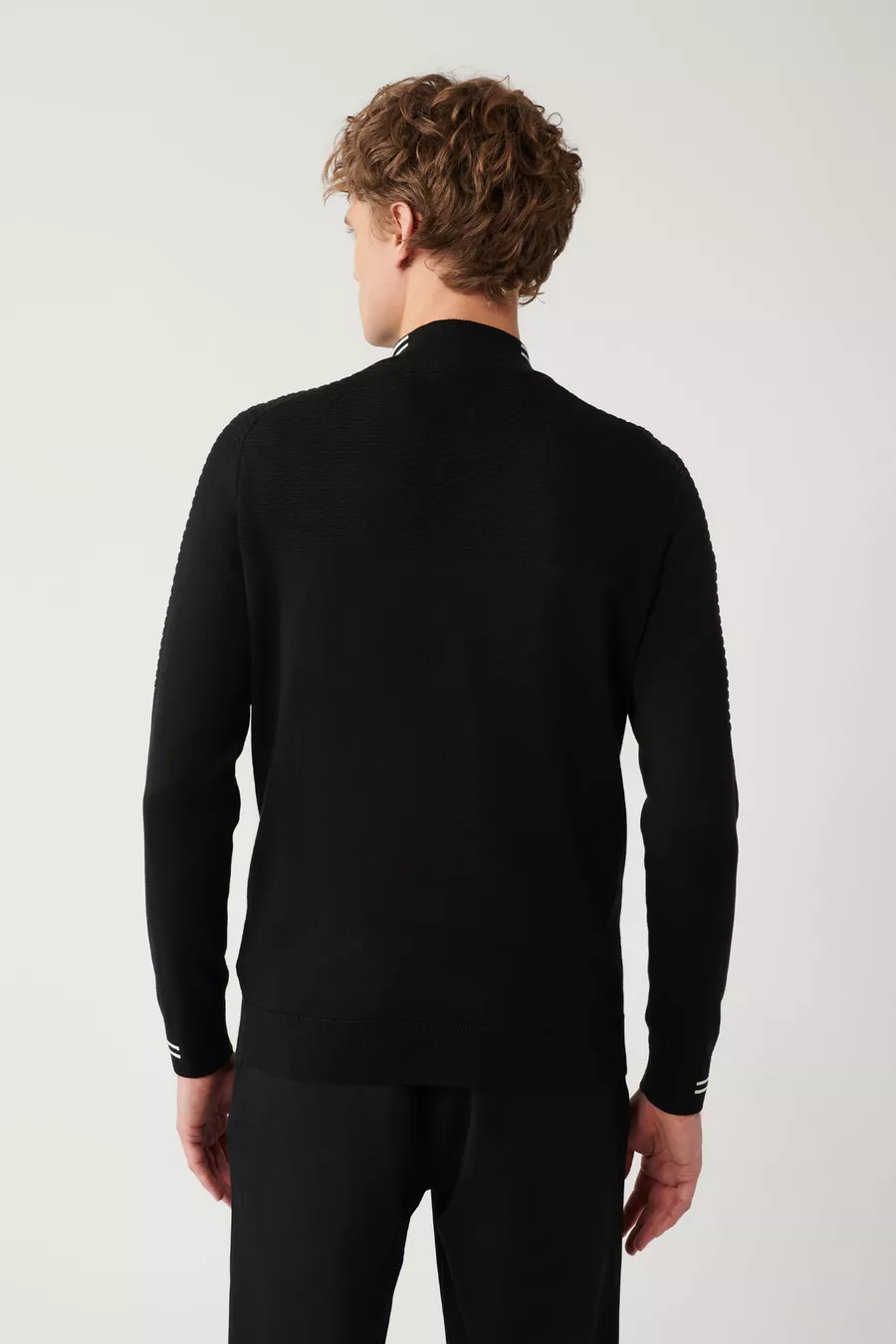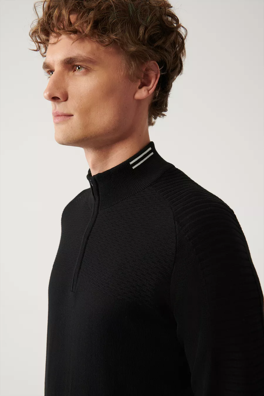 Мъжки черен пуловер с висока яка, текстуриран и с цип