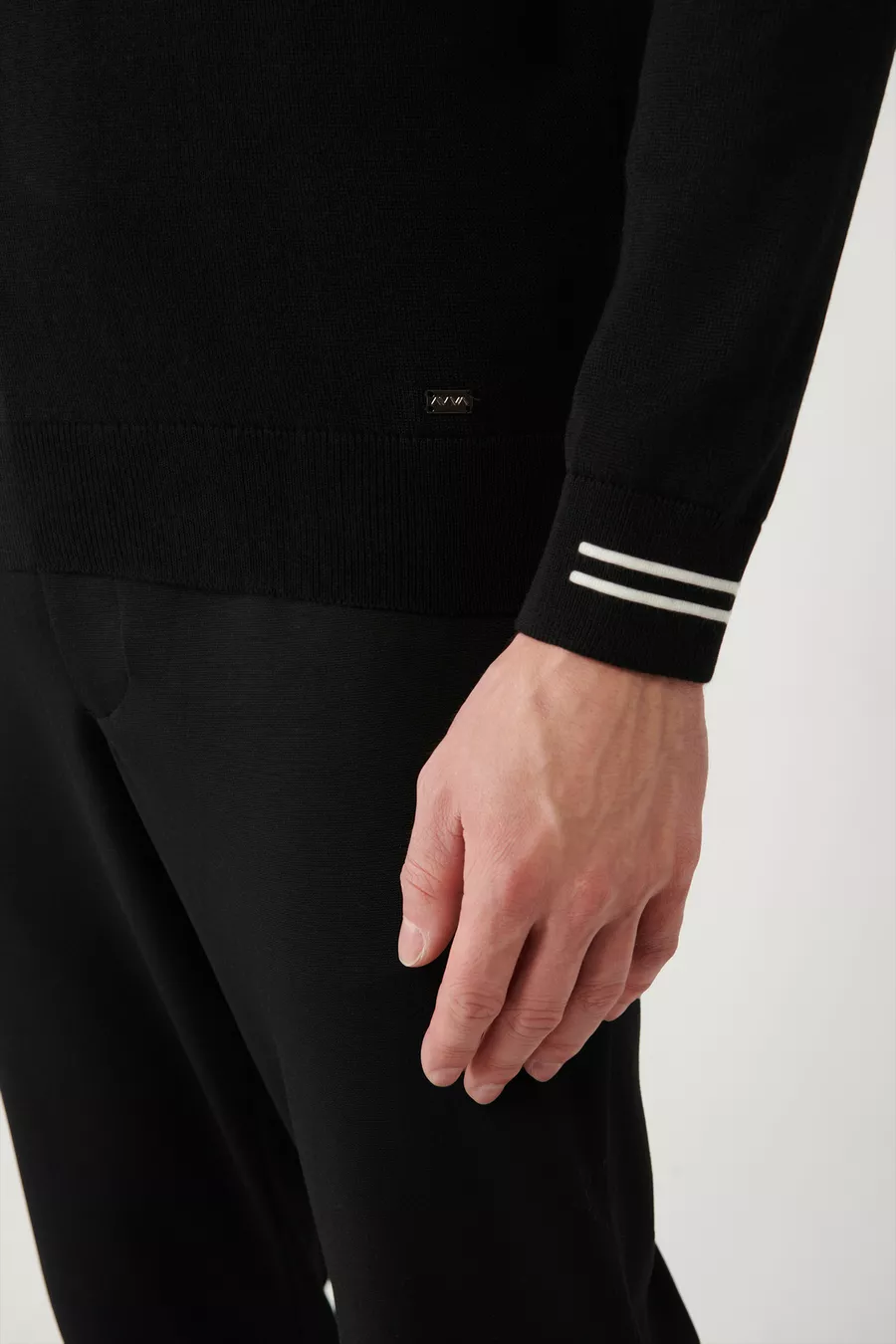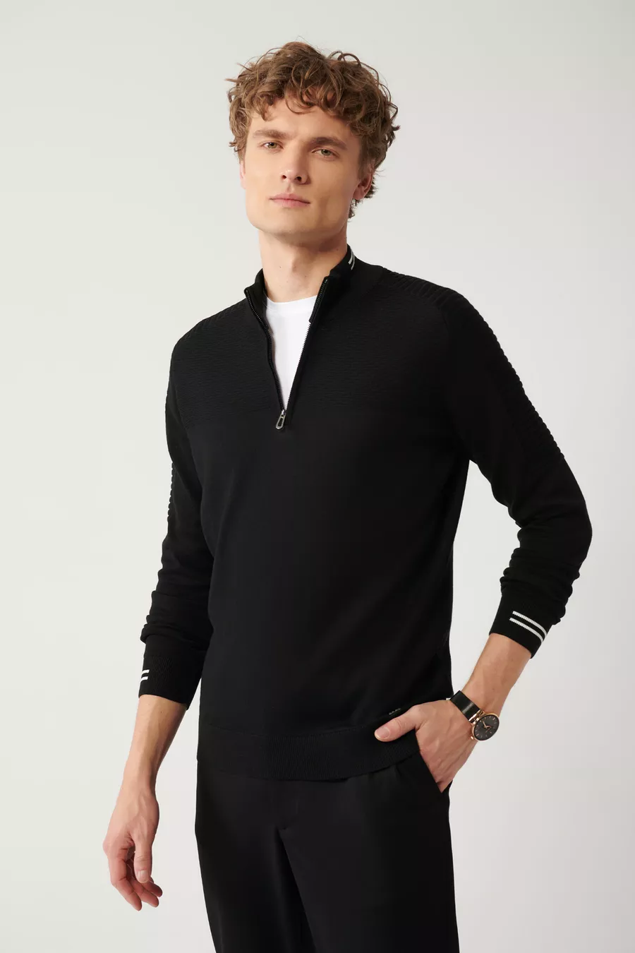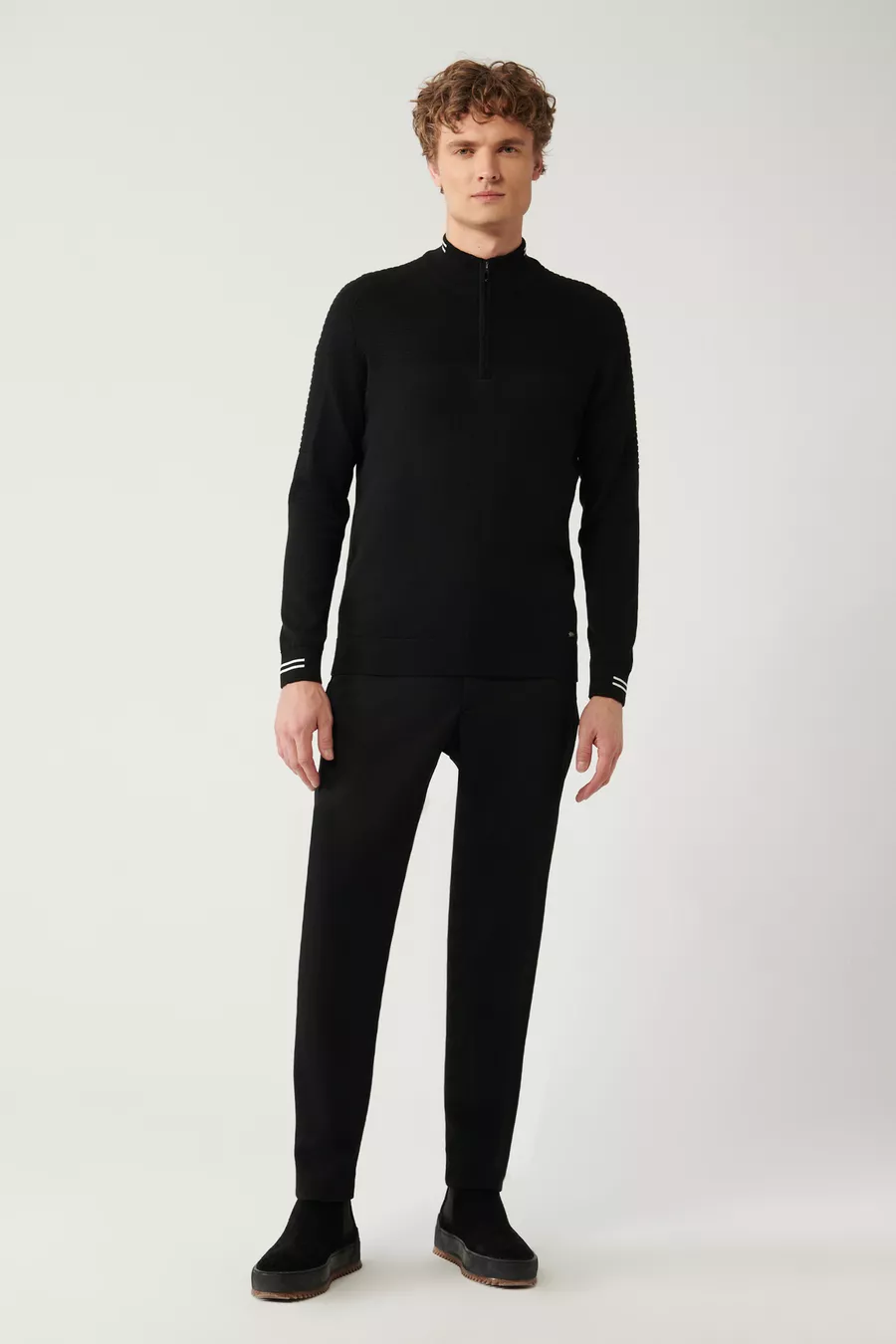 Мъжки черен пуловер с висока яка, текстуриран и с цип