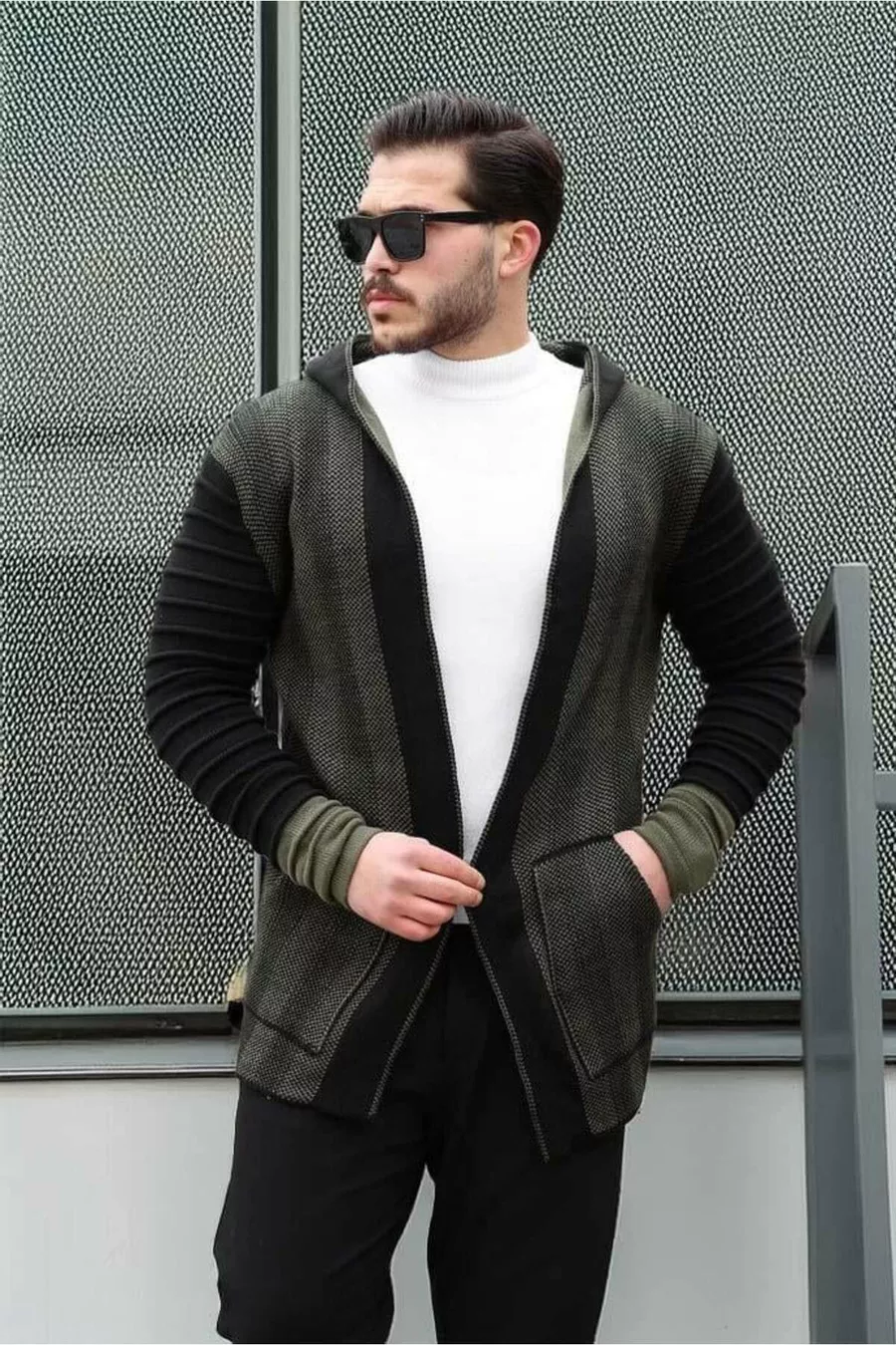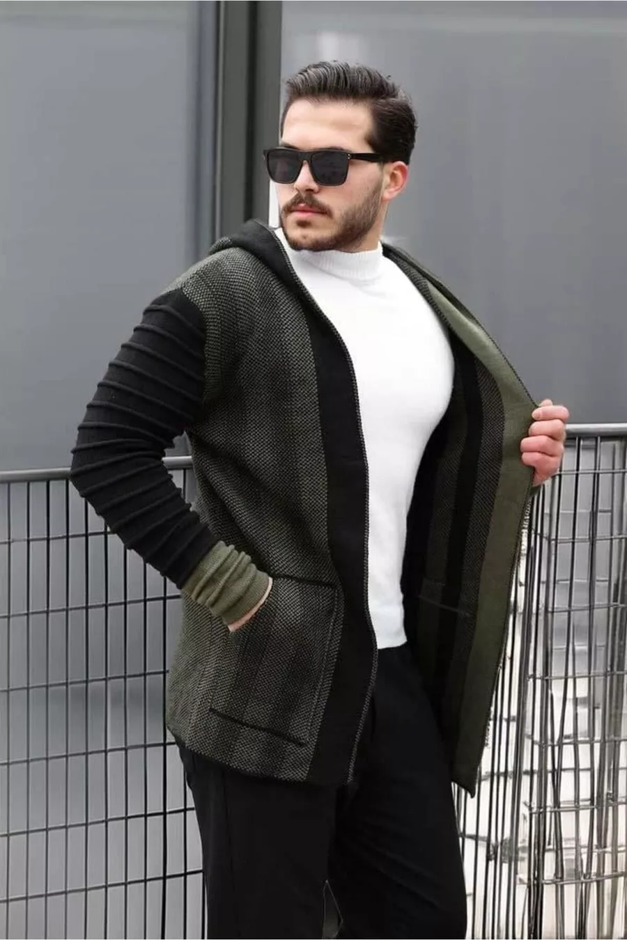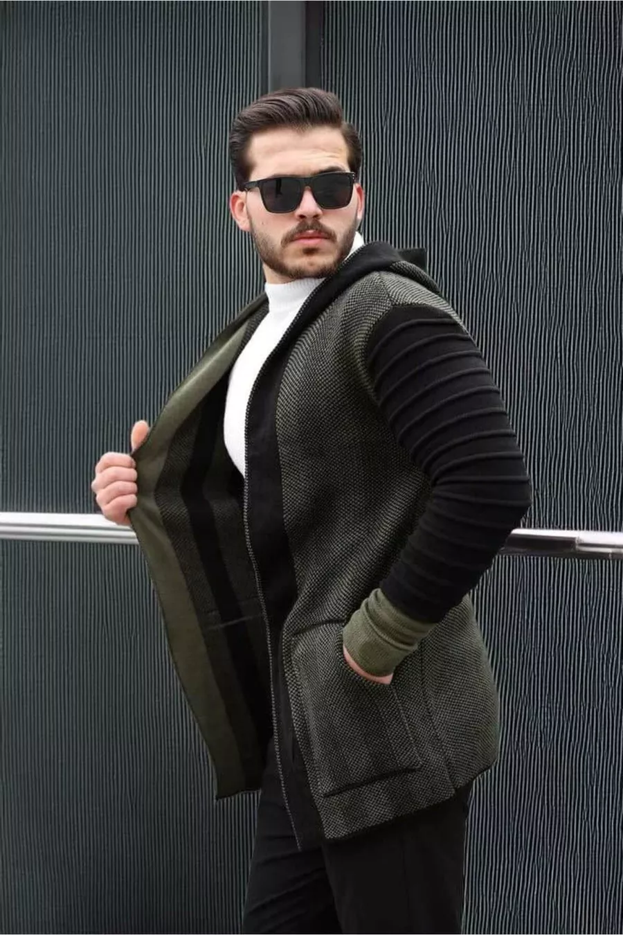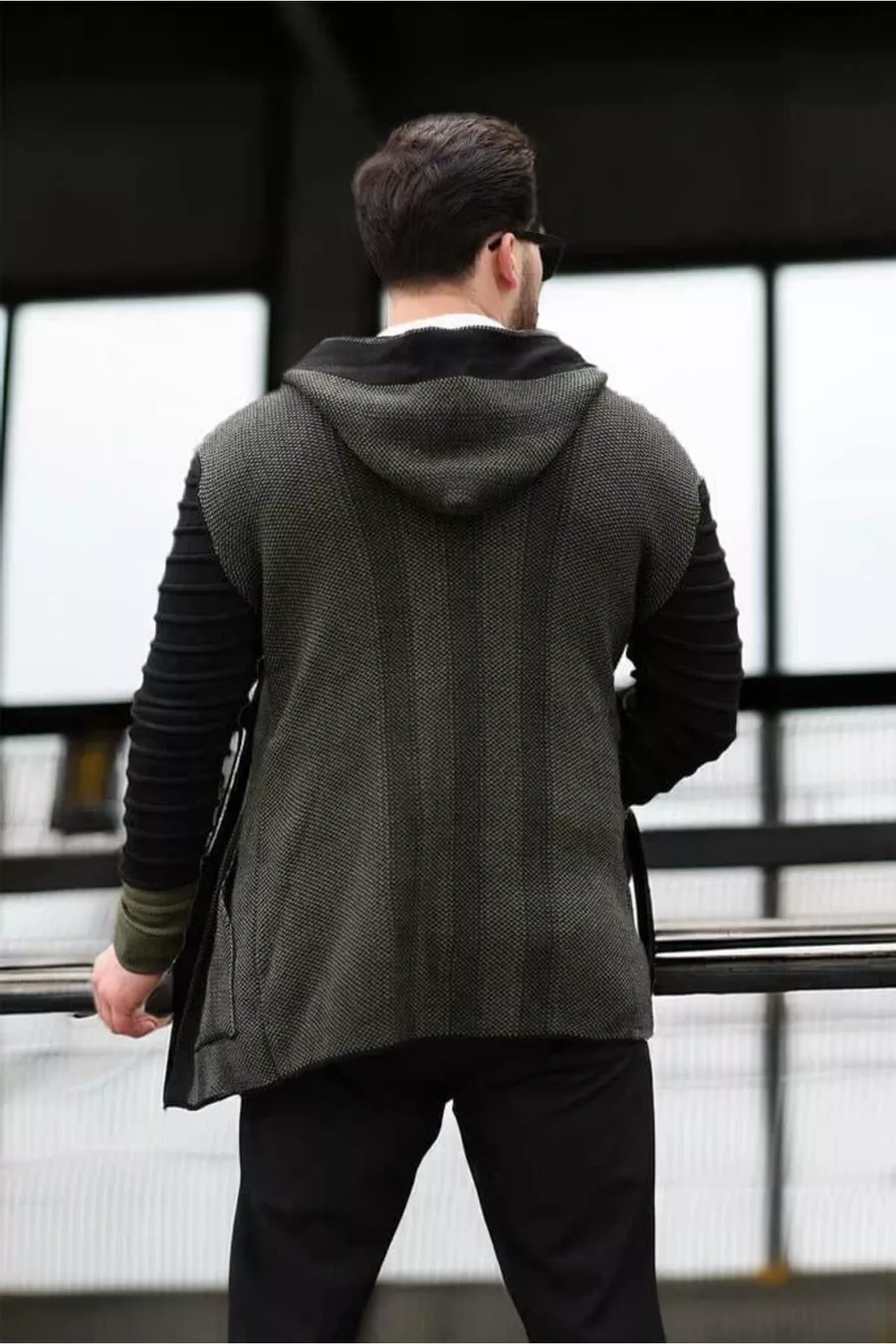 Мъжко хакитно пончо с качулка и шарени ръкави