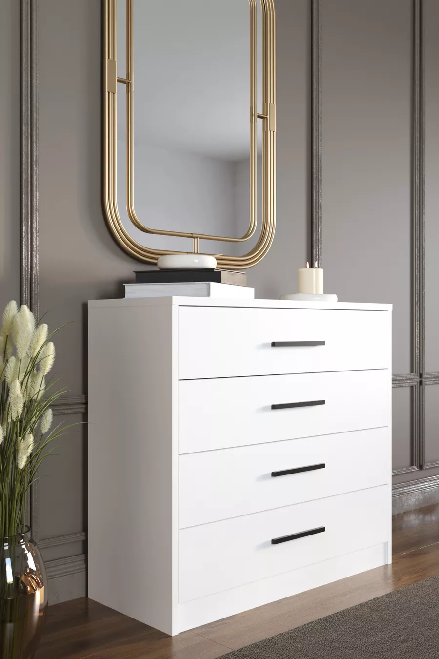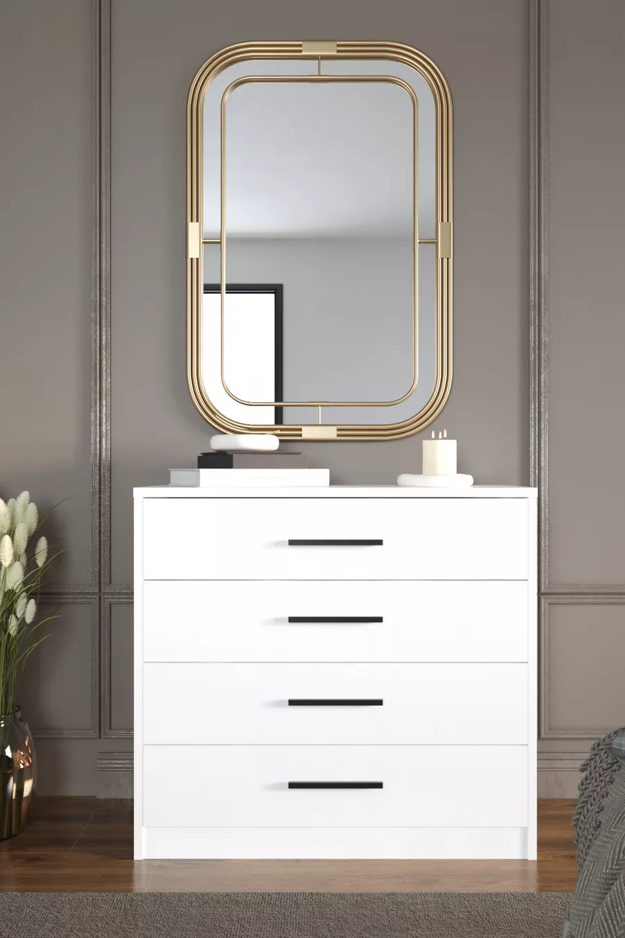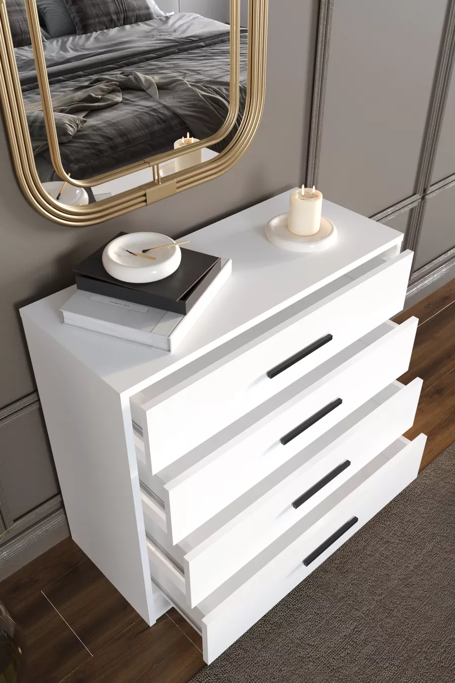 Цвят: Бял Гаранционен срок: 2 години Материал: ПДЧ Ширина: 86 см Дълбочина: 38 см Брой чекмеджета: 4 Характеристика на продукта: С чекмеджета Стил: Модерен Тема / Стил: Модерен Произход: Турция Особеност: С чекмеджета