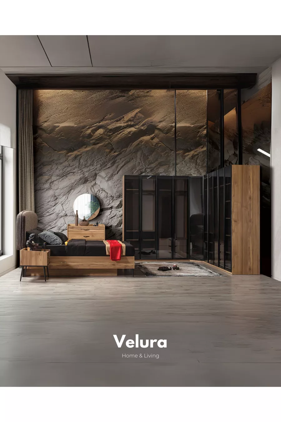 Съдържание на комплекта: Легло с основа + 2 нощни шкафчета + скрин + гардероб