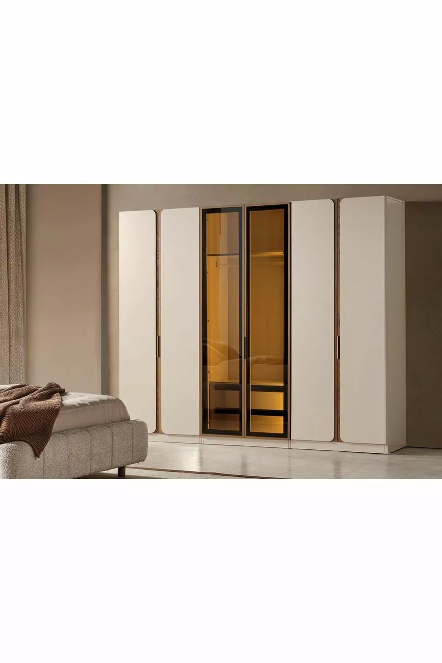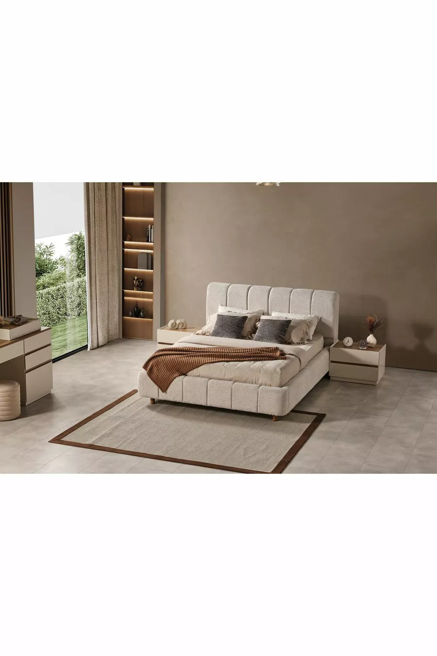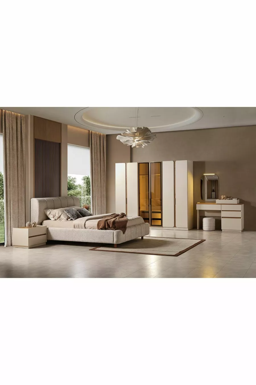 Цвят: Бежов Гаранционен срок: 2 години Размер на леглото/матрака: 160 x 200 Функция на леглото: С основа Функция на гардероба: С огледало Материал на корпуса на гардероба: ПДЧ Брой врати: 6 Съдържание на комплекта: Легло + 2 нощни шкафчета + скрин + гардероб + огледало Стил: Модерен Тема / Стил: Модерен Произход: Турция