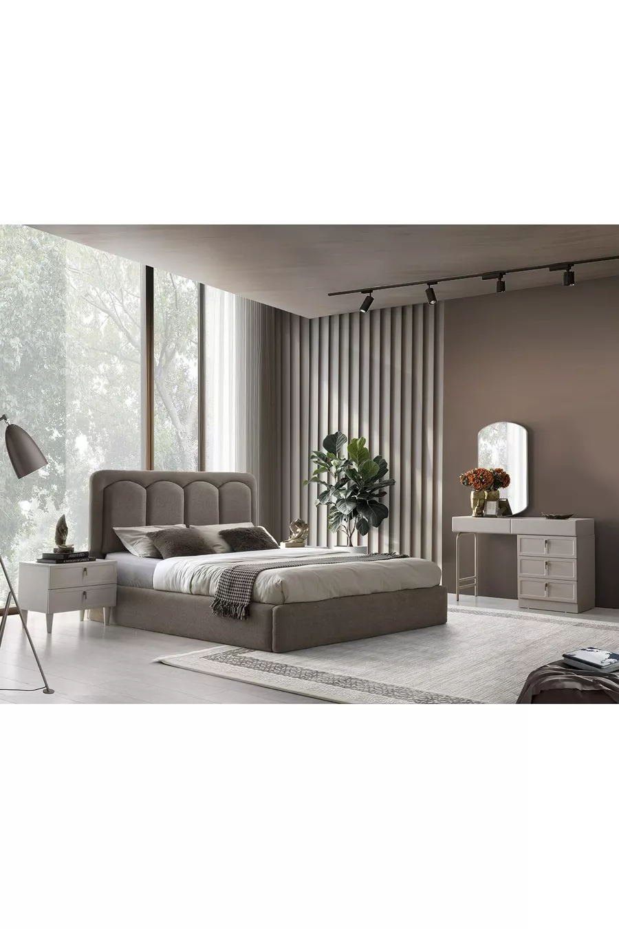 Съдържание на комплекта: Легло с основа + 2 нощни шкафчета + скрин + гардероб