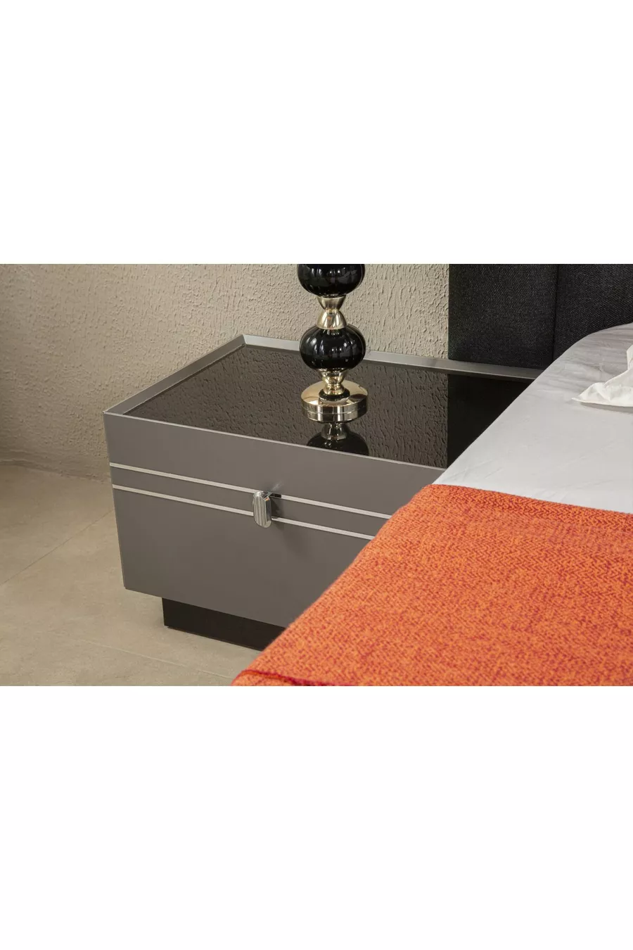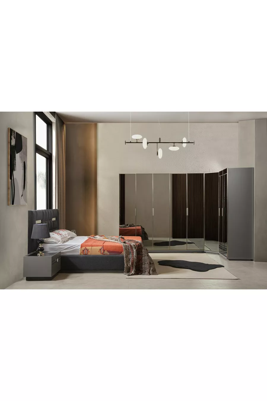 Съдържание на комплекта:Легло с основа + 2 нощни шкафчета + скрин + гардероб