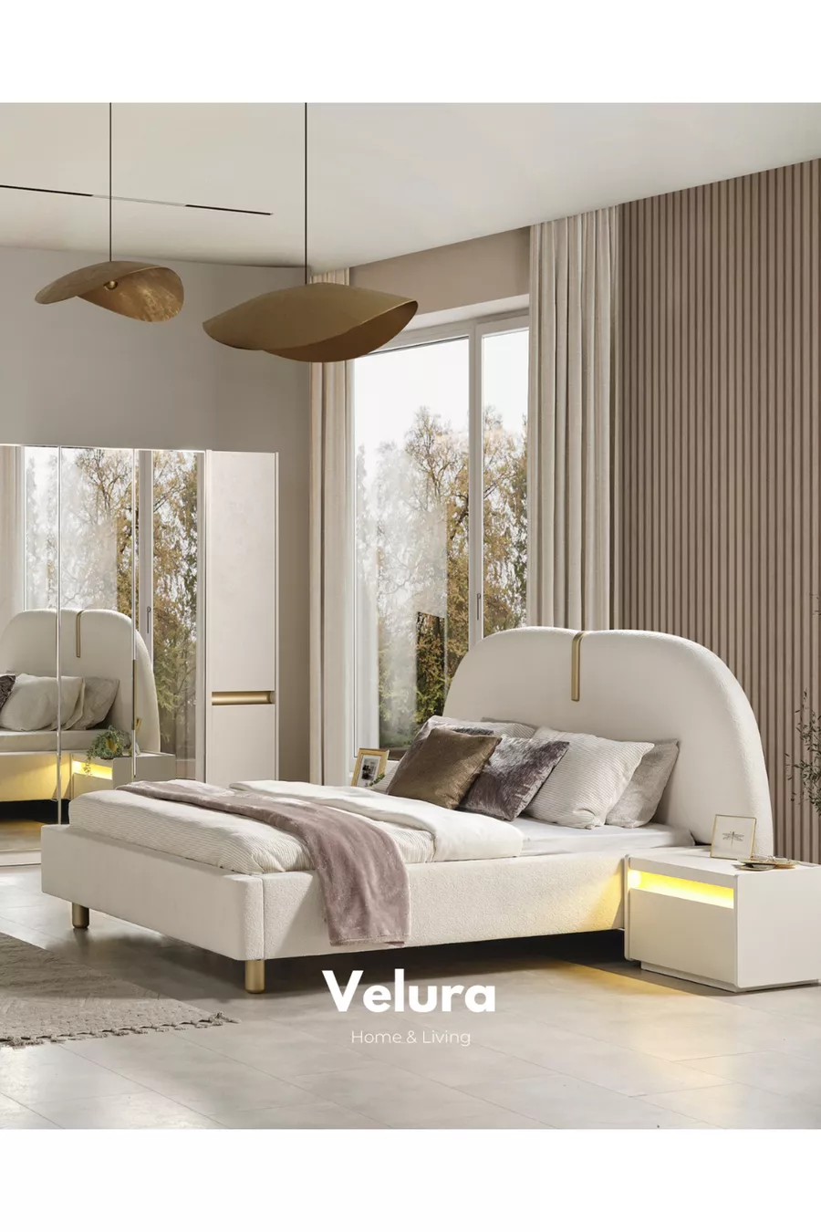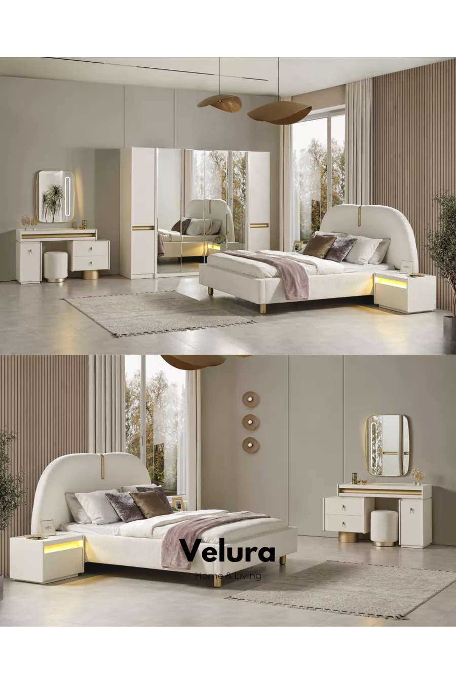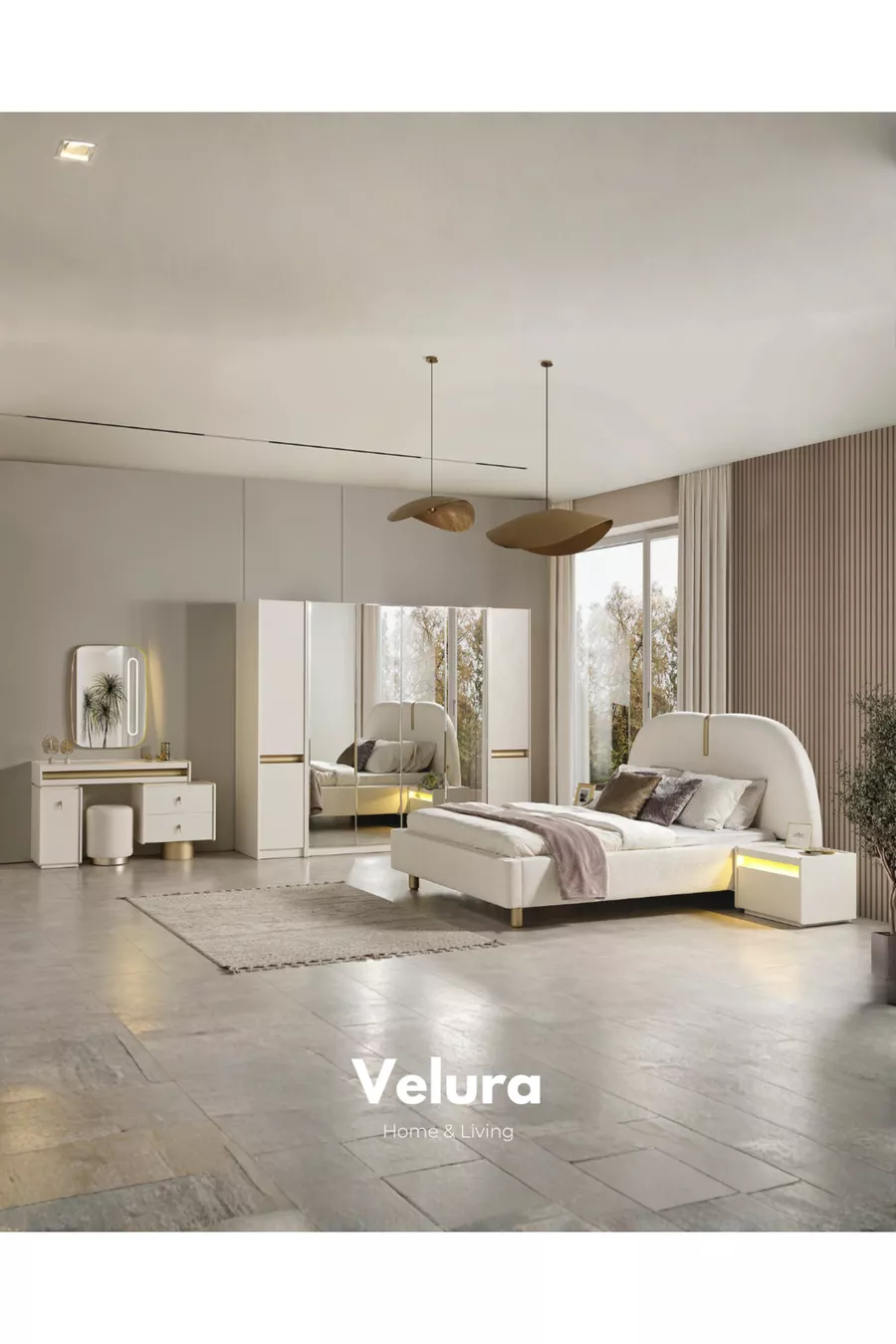 Съдържание на комплекта: Легло с основа + 2 нощни шкафчета + скрин + гардероб