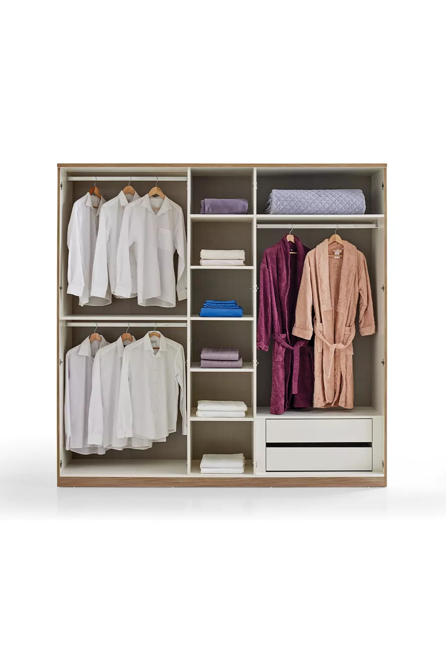 Съдържание на комплекта:Гардероб + 2 нощни шкафчета + скрин + табла за легло
