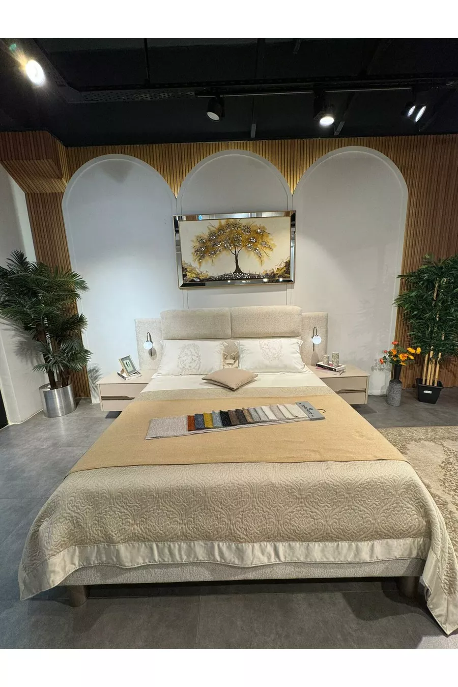 Съдържание на комплекта: Легло с подматрачна основа + 2 нощни шкафчета + скрин + гардероб