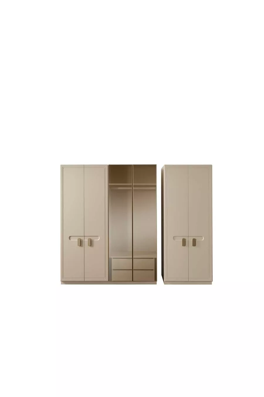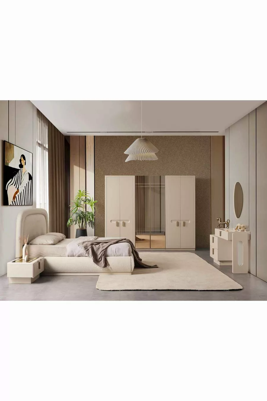 Съдържание на комплекта: Легло с подматрачна основа + 2 нощни шкафчета + скрин + гардероб