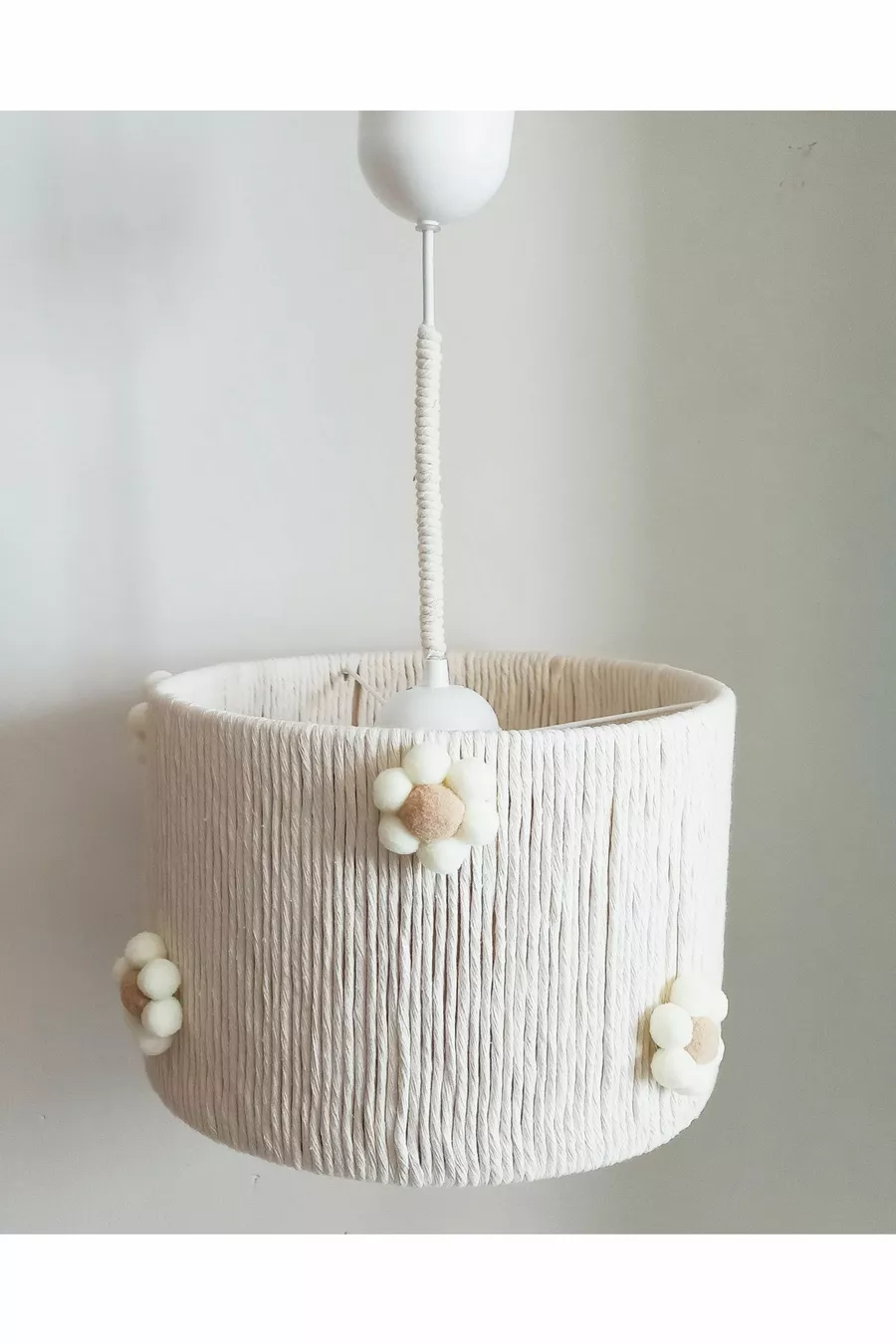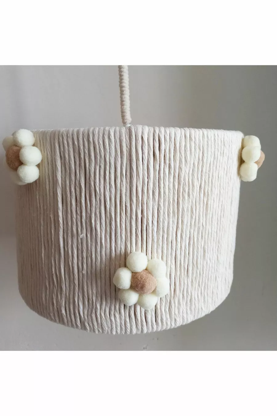 Цилиндрична макраме кремава лампа с помпони и цветя за стая за младежи или бебета, окачена полилей