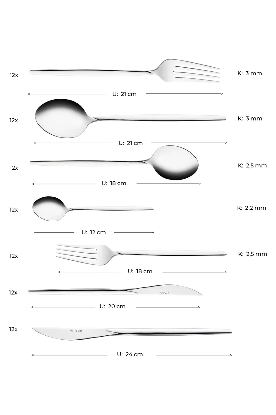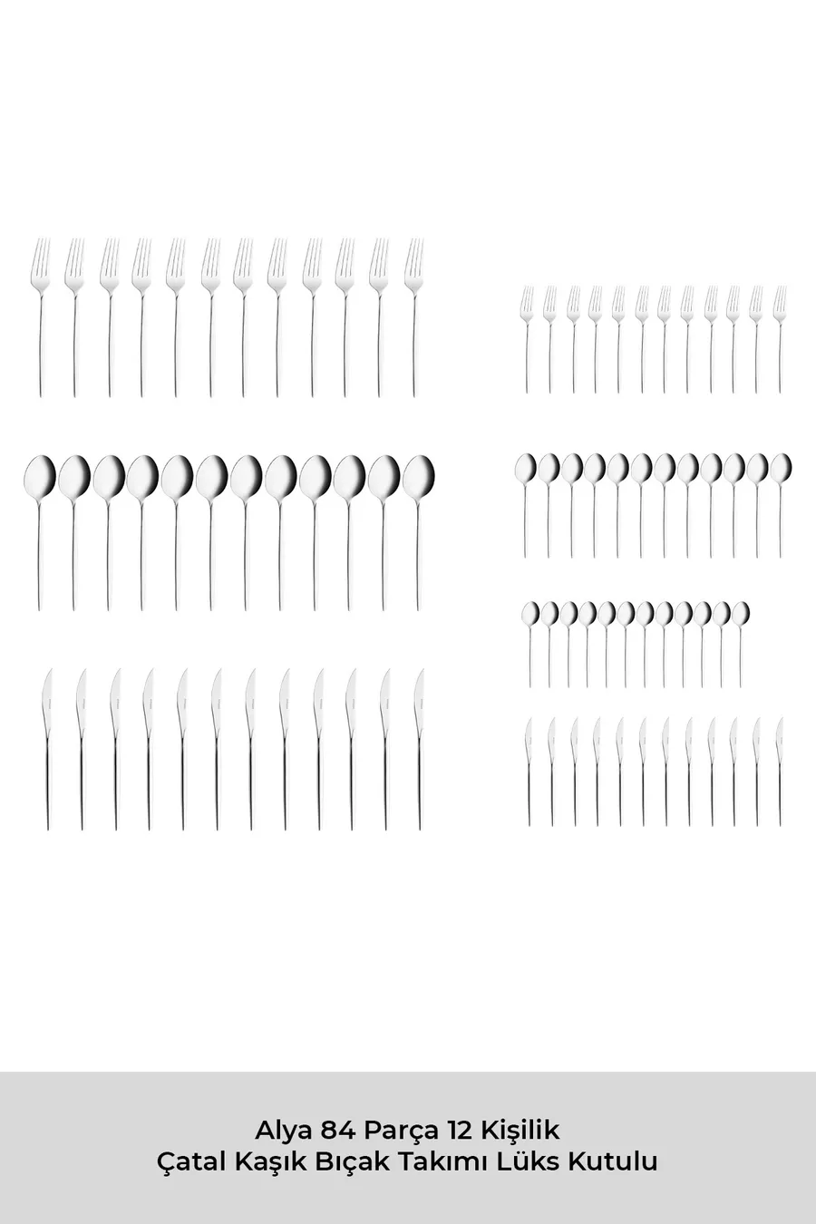 Материал: Неръждаема стомана Брой части: 84 Цвят: Сребърен Брой лица: За 12 души Тип продукт: Комплект ножове Произход: Турция Гаранционен срок: 2 години Инструкции за поддръжка (във връзка с храната): Може да се мие в съдомиялна машина.