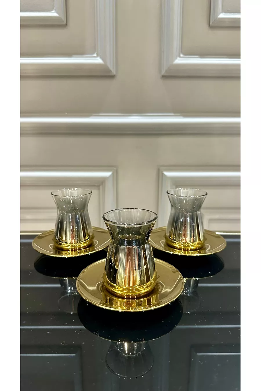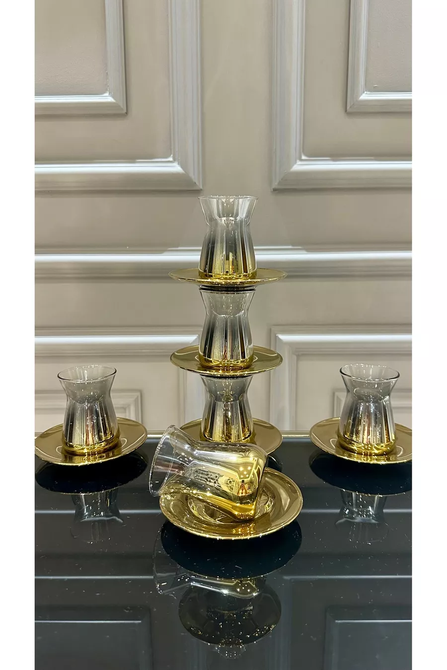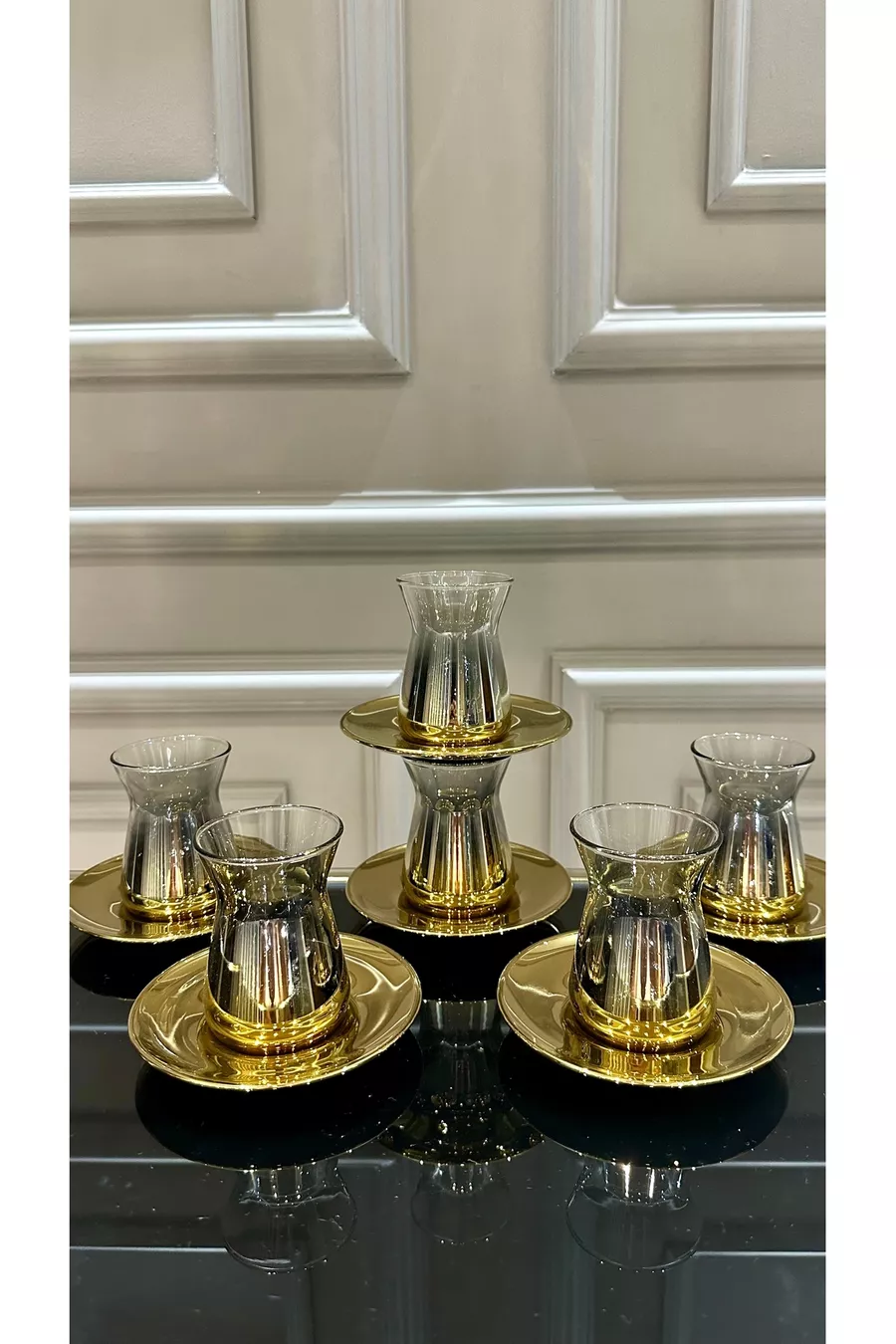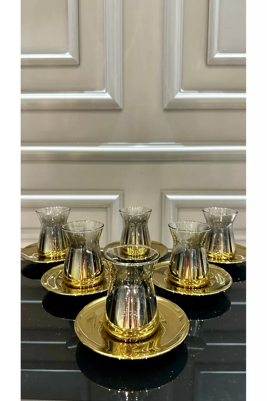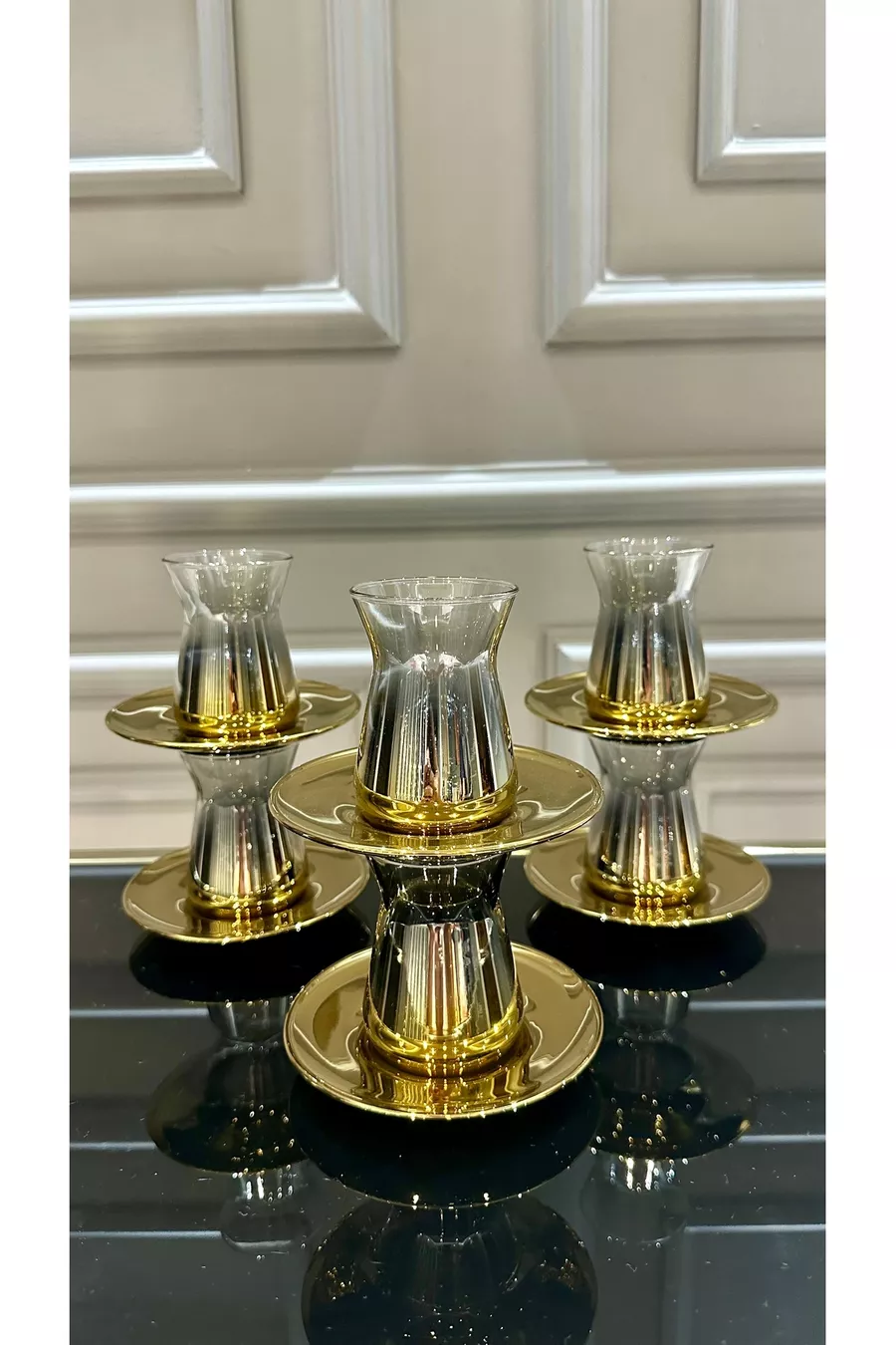 Материал: Стъкло Брой части: 6 Цвят: Златен Обем: 100-199 мл Характеристика: Може да се мие на ръка Тип продукт: Чаши за чай Произход: TR Символ за контакт с храни: Да Инструкции за поддръжка (контакт с храни): Може да се мие в съдомиялна машина.