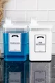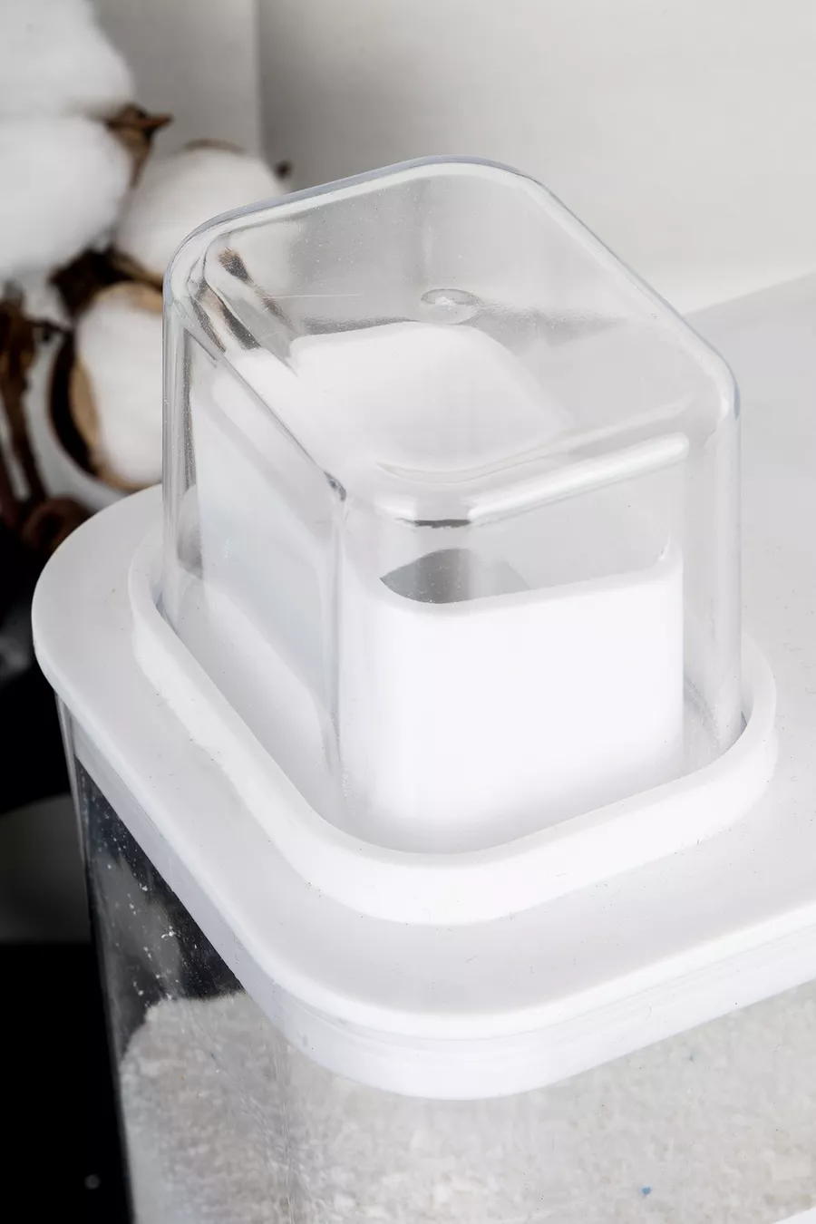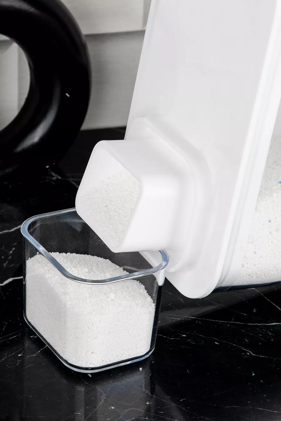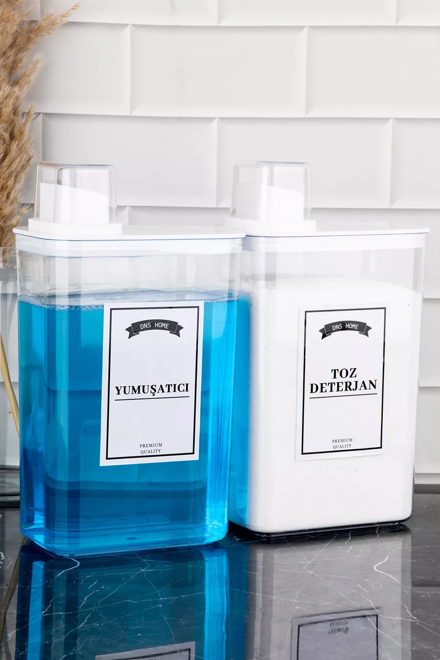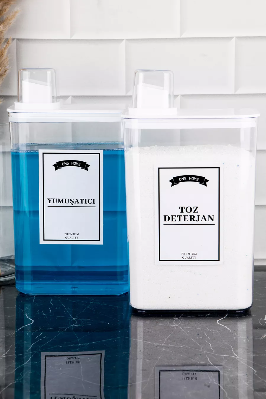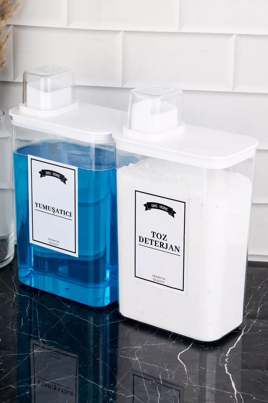 2er-Set Waschmittel-Aufbewahrungsbehälter mit integrierter Messskala, beschriftet für Pulver und Weichspüler, ml