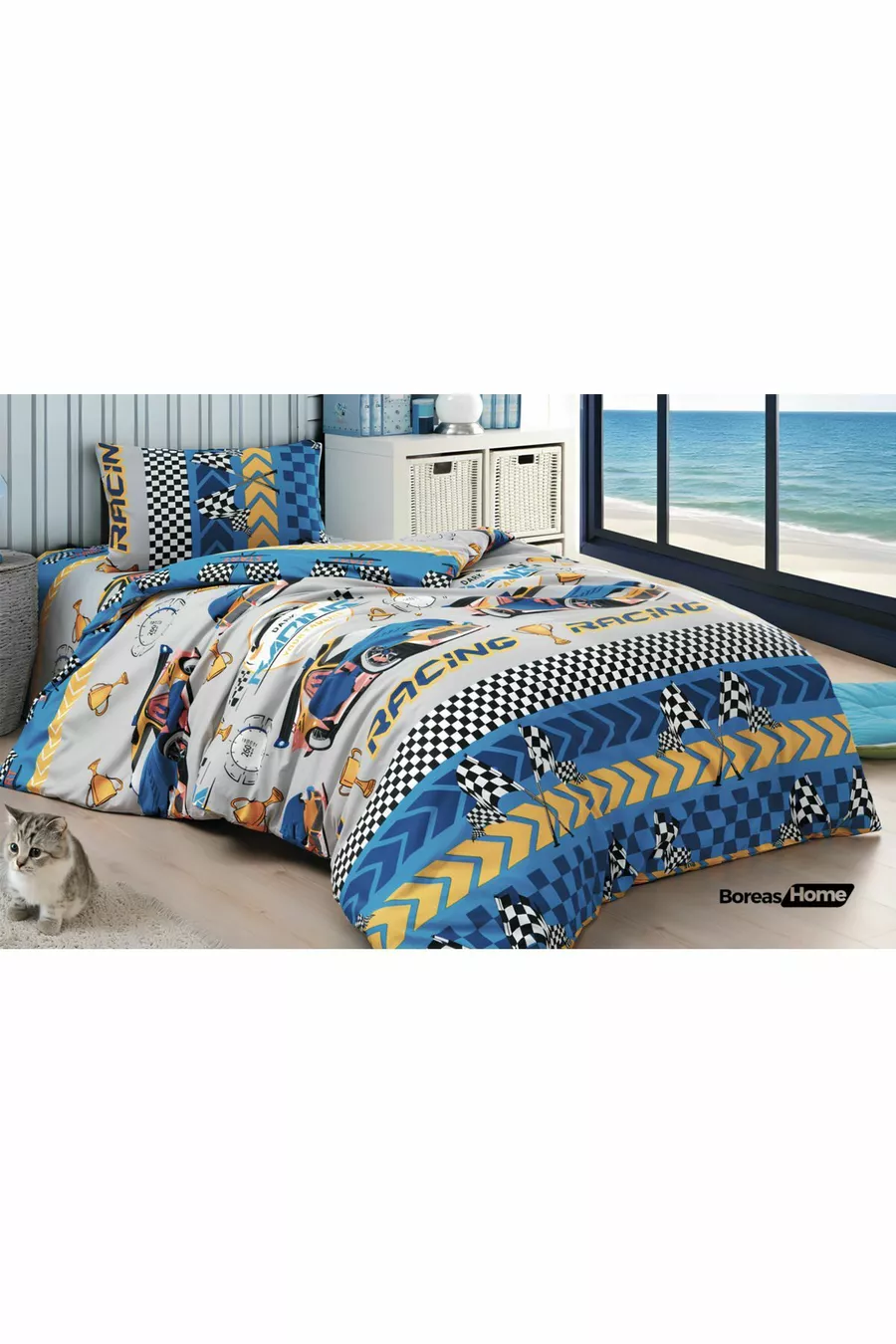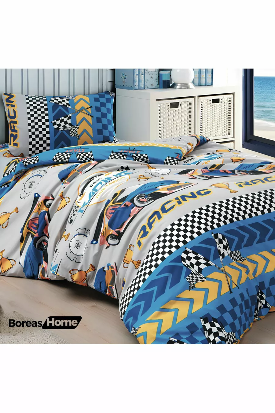 Abenteuerliches Bettwäsche-Set für Einzelbett mit blauem Auto-Motiv