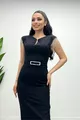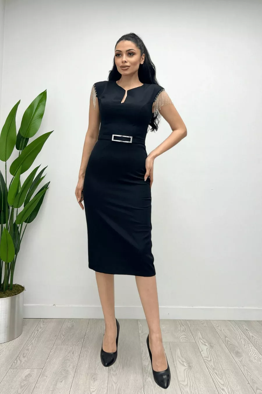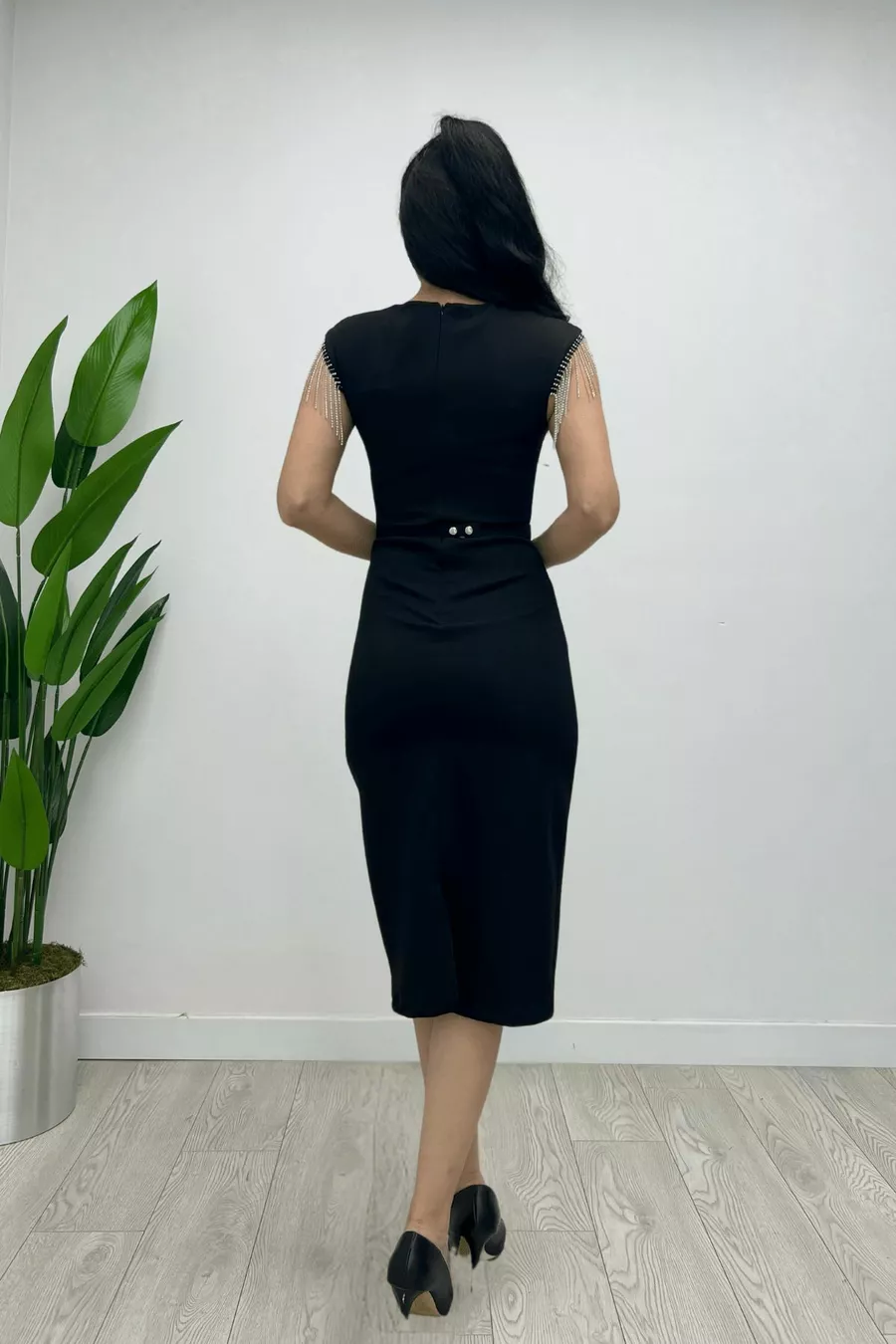 Atlas Stoff Schulter Stein Quaste Kleid - Schwarz