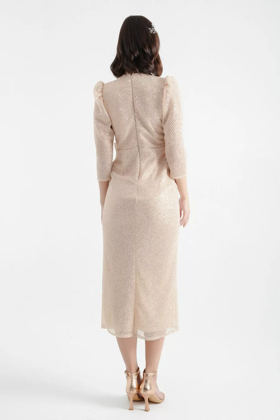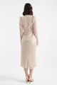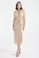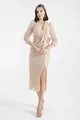 Beigefarbenes Midi-Abendkleid mit doppelreihigem Kragen und Schlitz für Damen