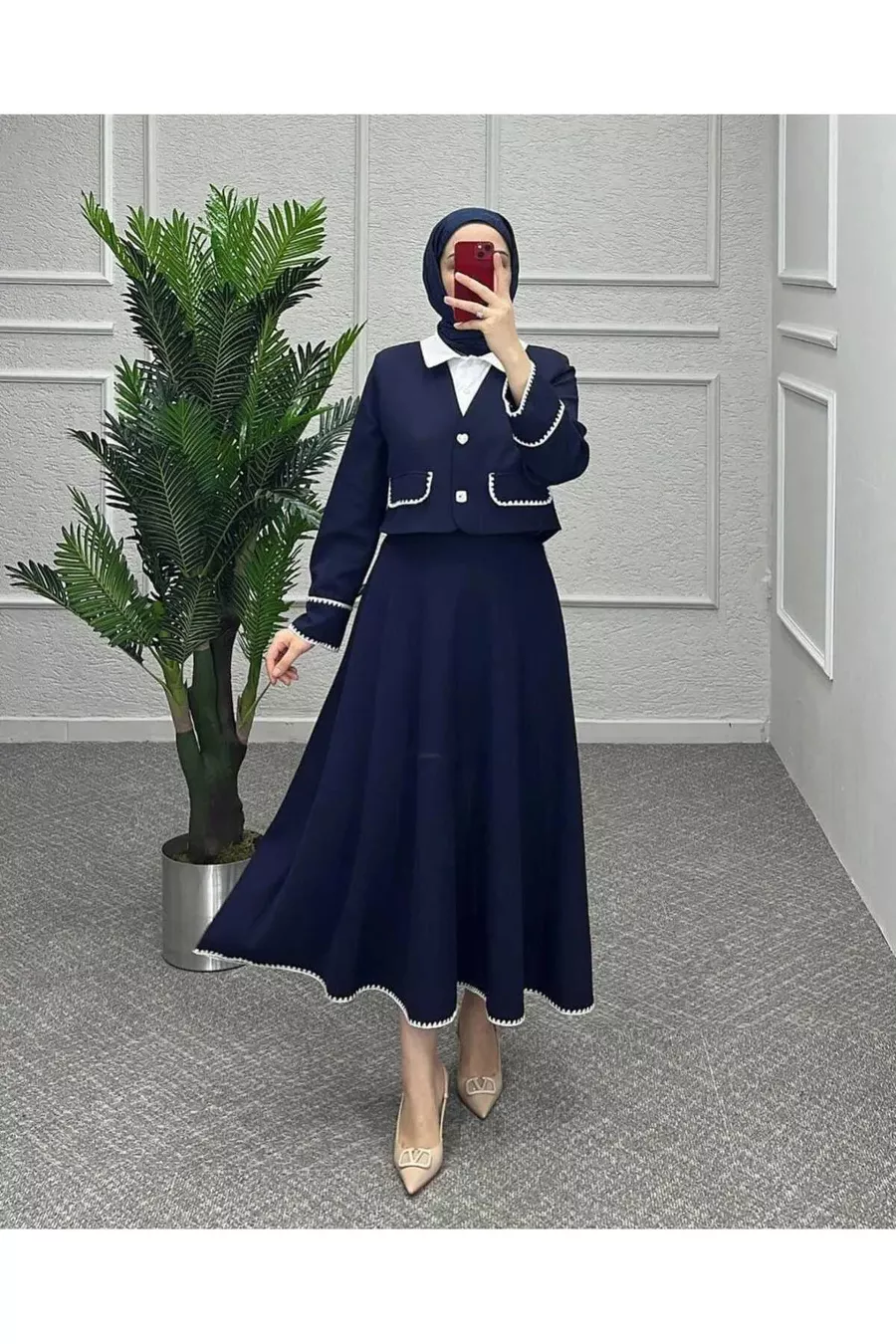 Webart: Krepp Silhouette: Glockenförmig Muster: Bestickt / Verziert Schnitt: Regular Kragenart: V-Ausschnitt Stoffart: Gewebt Material: Polyester-Mix Farbe: Marineblau Tasche: Taschenlos Produktdetails: Natürliche Knöpfe Ärmellänge: Lang Kollektion: Bedeckte Mode Set: Mit Rock und Cardigan Zusätzliches Merkmal: Mit Gummizug in der Taille Ärmelform: Standardarm Nachhaltigkeitsdetails: Nein Verschlussart: Mit Knöpfen Länge: Lang Gürtel / Taillierung: Ohne Gürtel Zielgruppe: Modebewusst Anlass: Elegant / Abend Taille: Normale Taille Futter: Ohne Futter Dicke: Dünn Pflegehinweis: T01 Saumart: Regular Packungsinhalt: 2-teilig Saison: Ganzjährig Herkunft: TR Verpackung: Keine Verpackung Anzahl der Teile: 2
