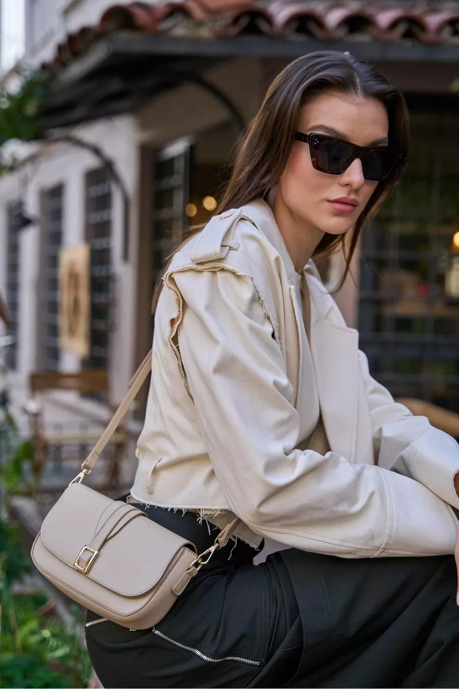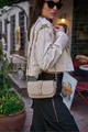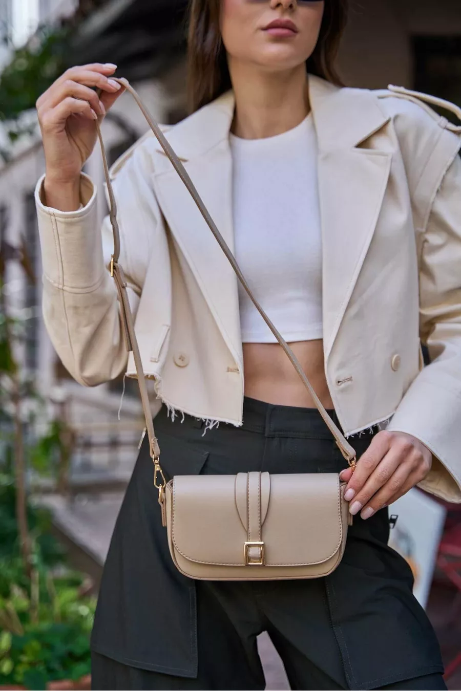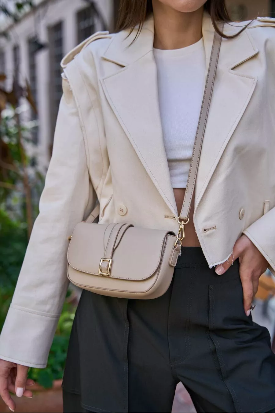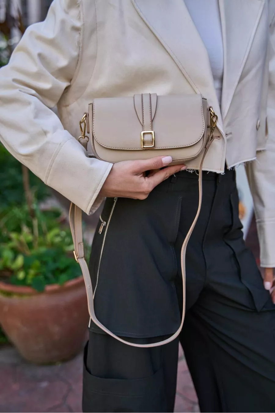 Blaugraue Damenhandtasche mit Schnalle und schrägem Schulterriemen