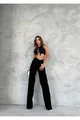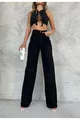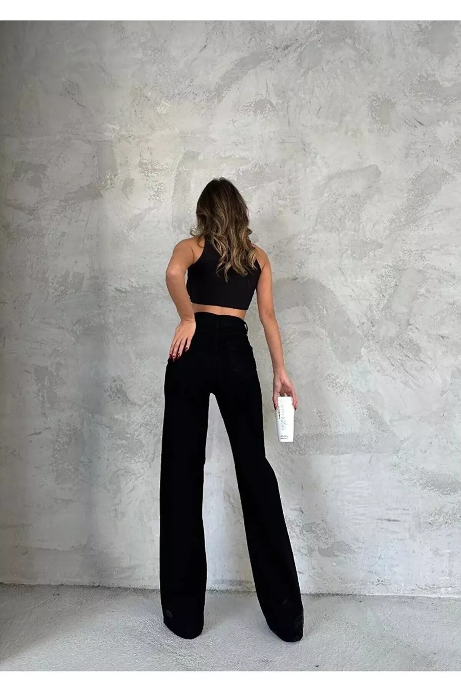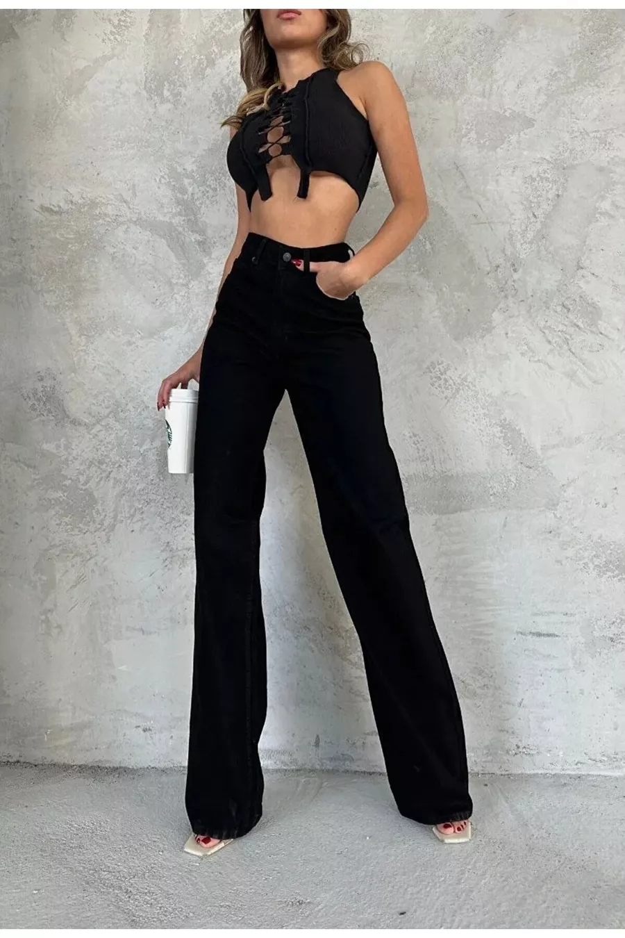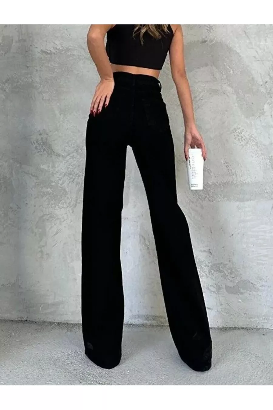 Cayla schwarze Jeans-Palazzo-Hose mit Lycra, super hoher Bund und lockerer Passform. (SUPER HOCH.) Weites Bein.