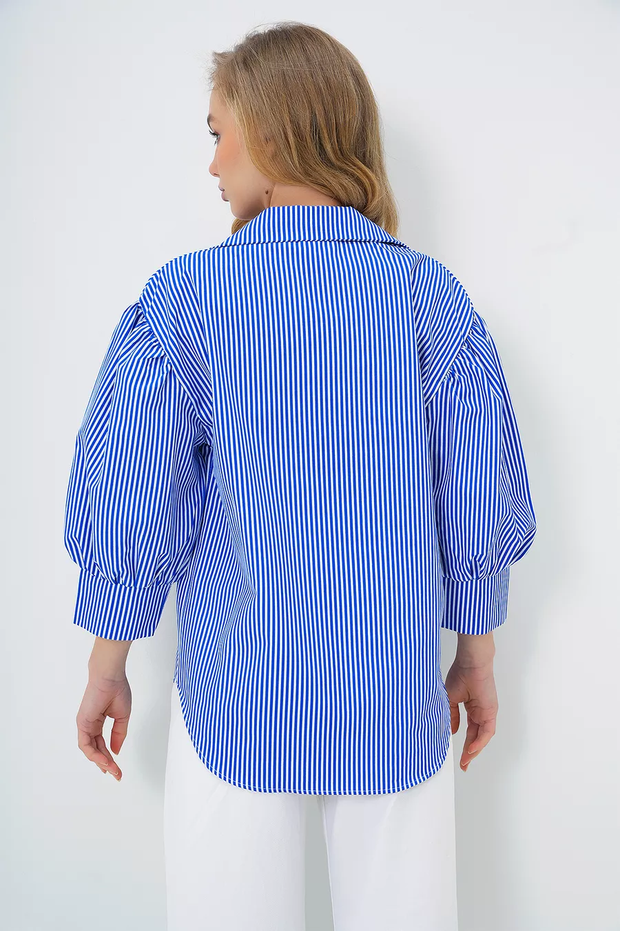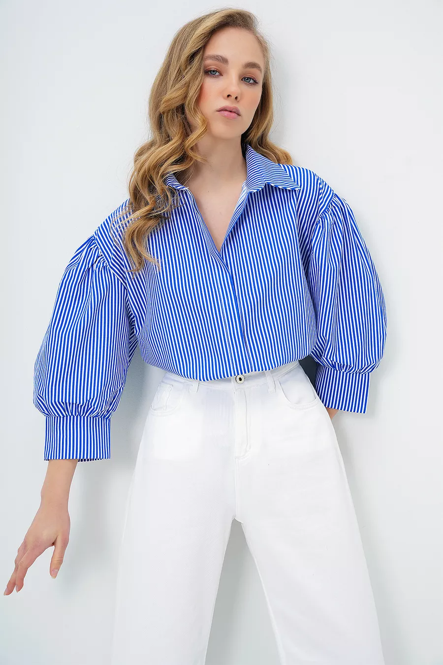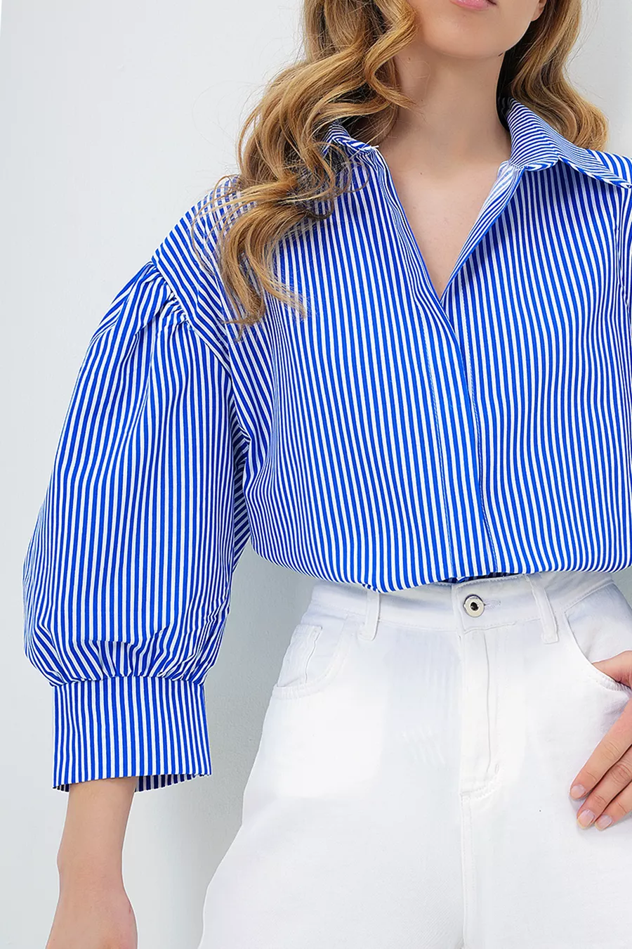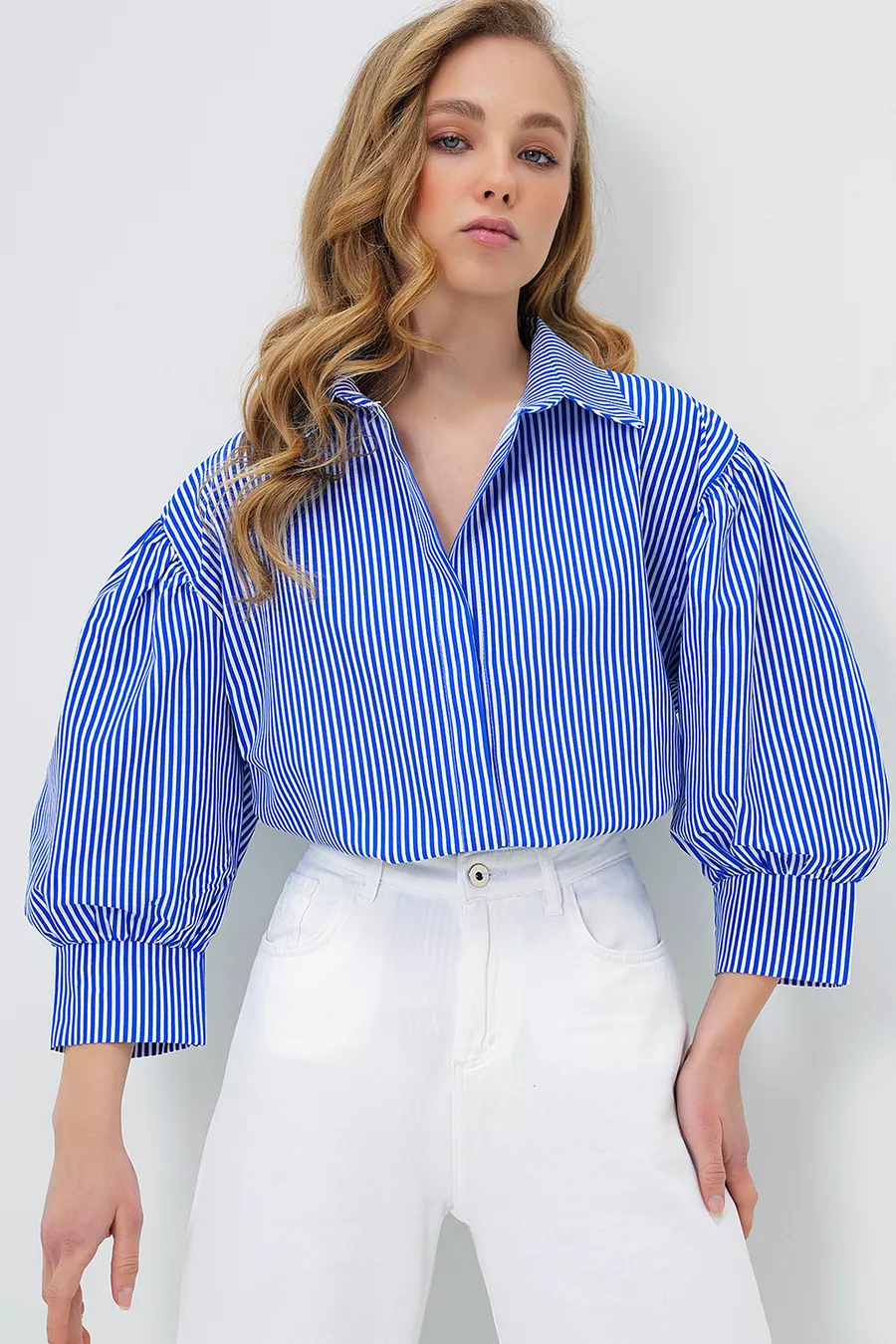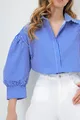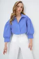 Damen Basic Popelinhemd mit versteckter Knopfleiste, Ballonärmeln, dunkelblau gestreift