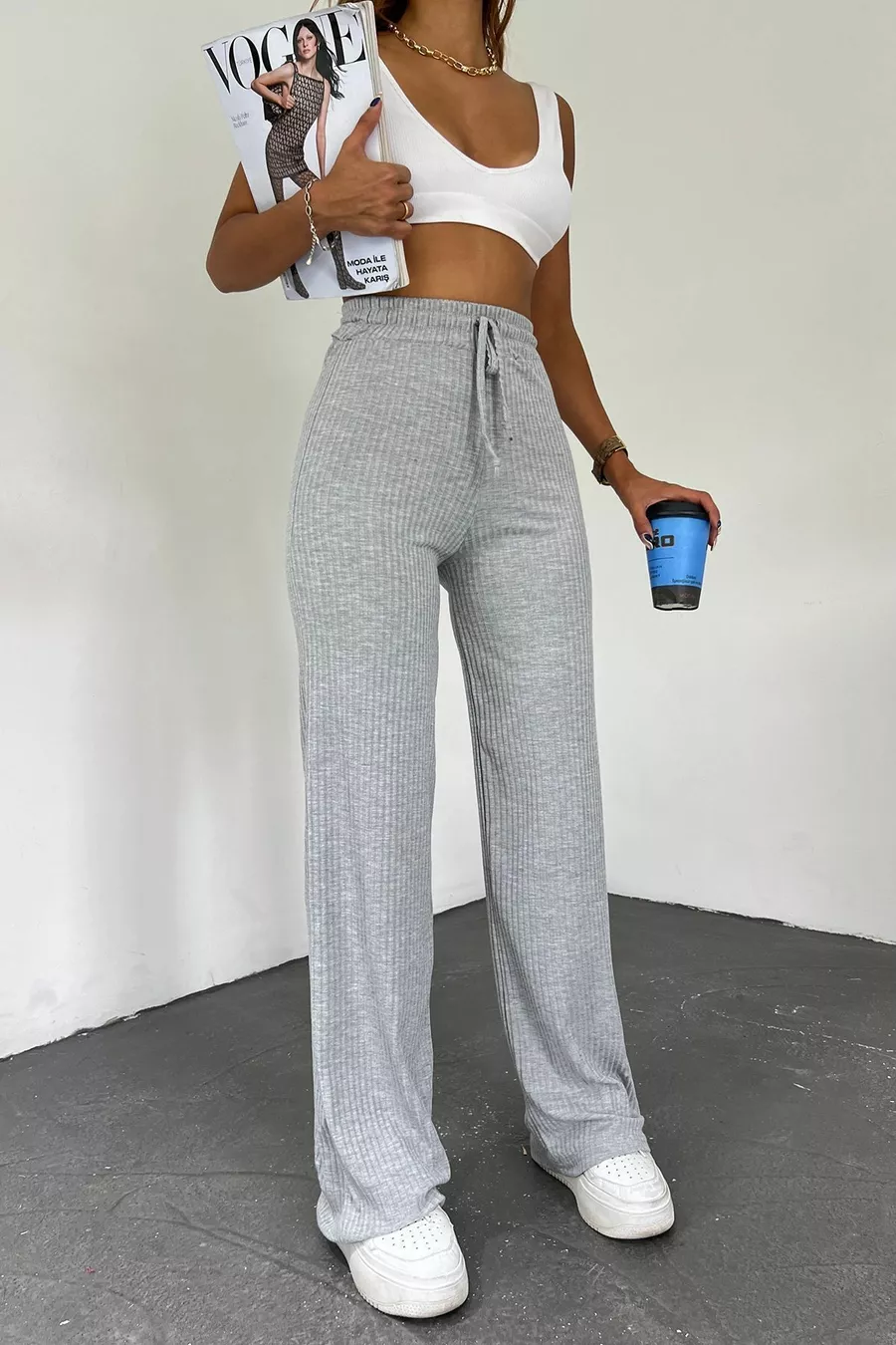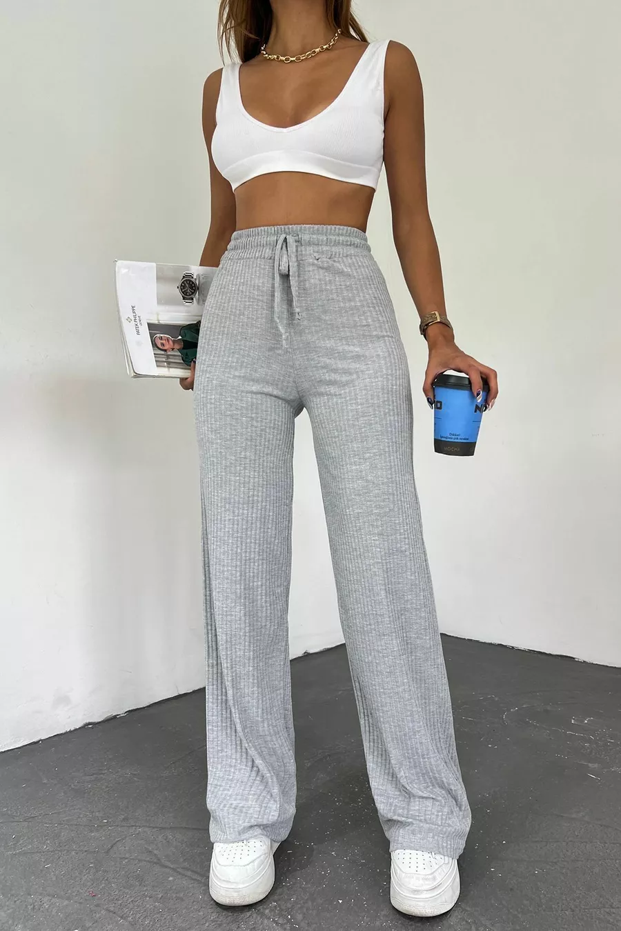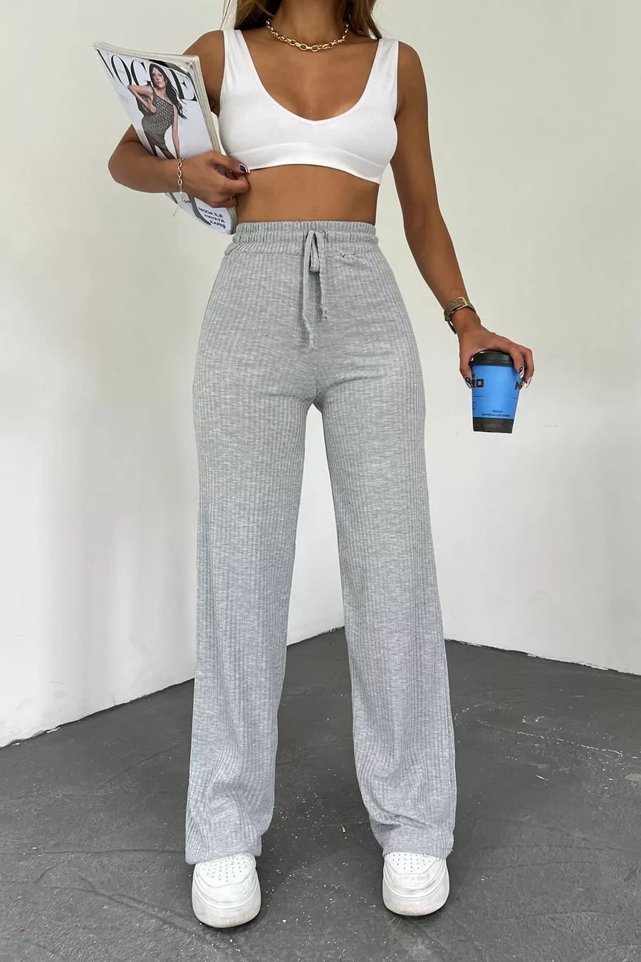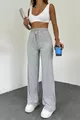 Damen Graue Palazzo-Rippstrick Jogginghose mit weitem Bein