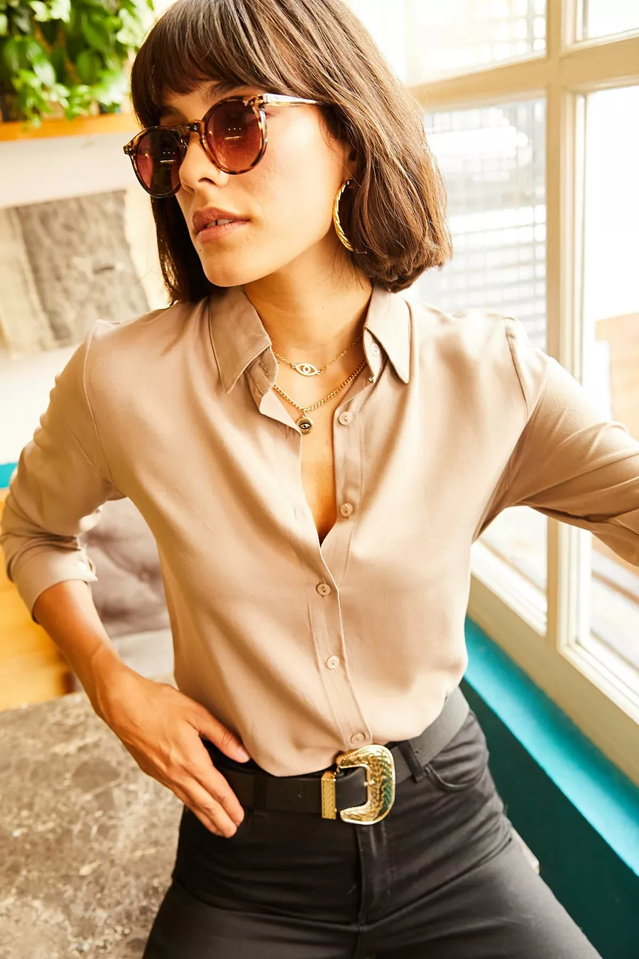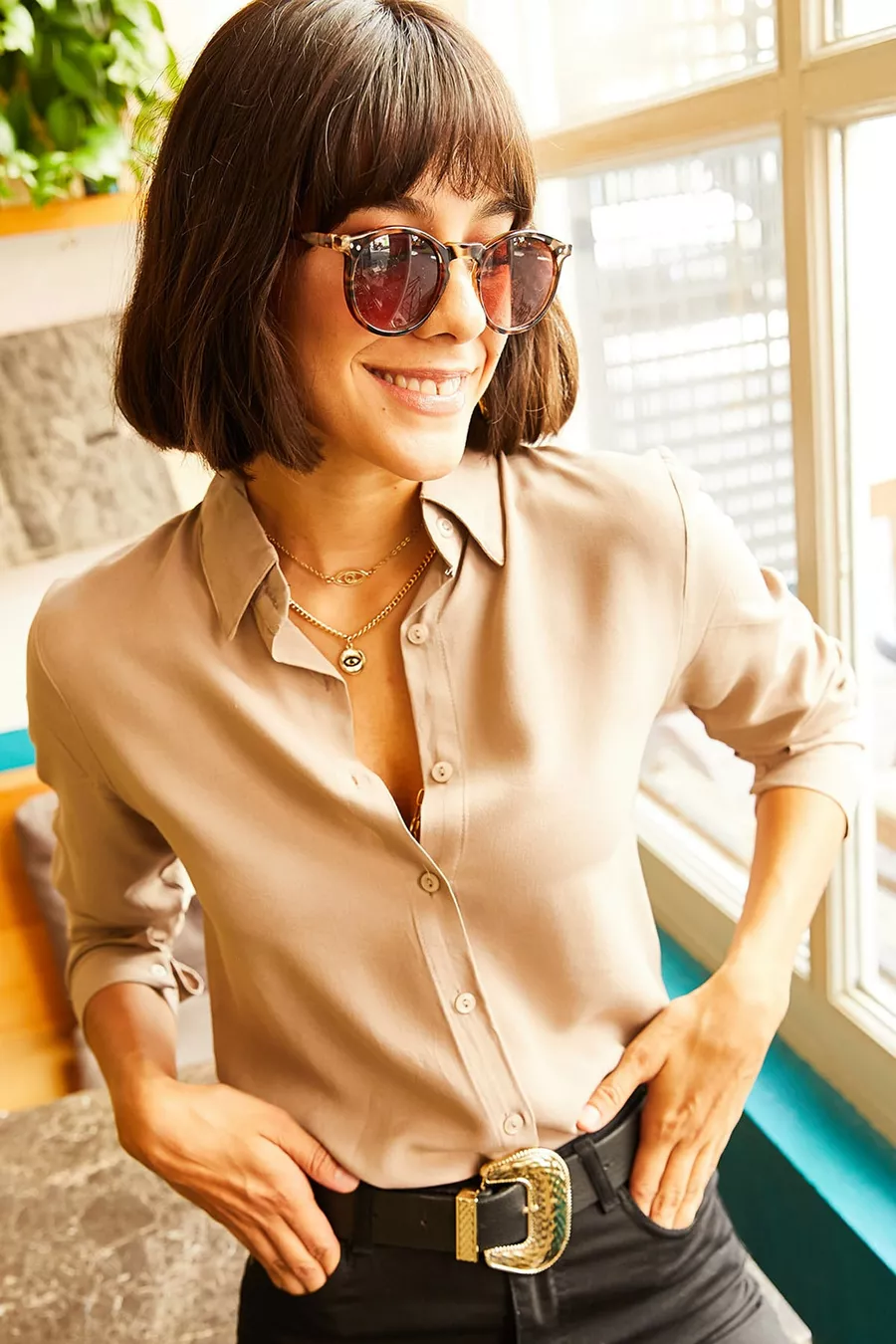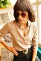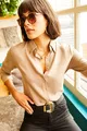 Damen Milchkaffee Web-Viskose Regular-Fit-Hemd