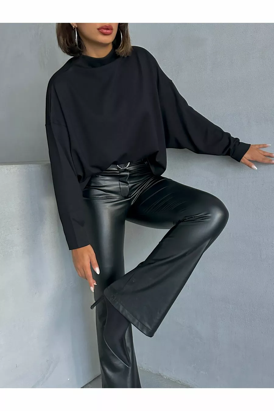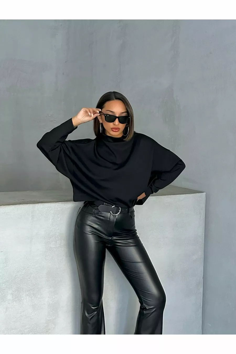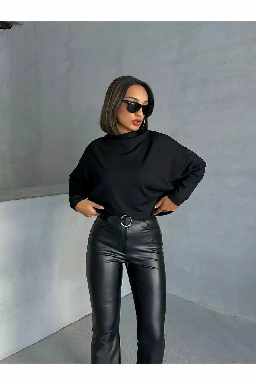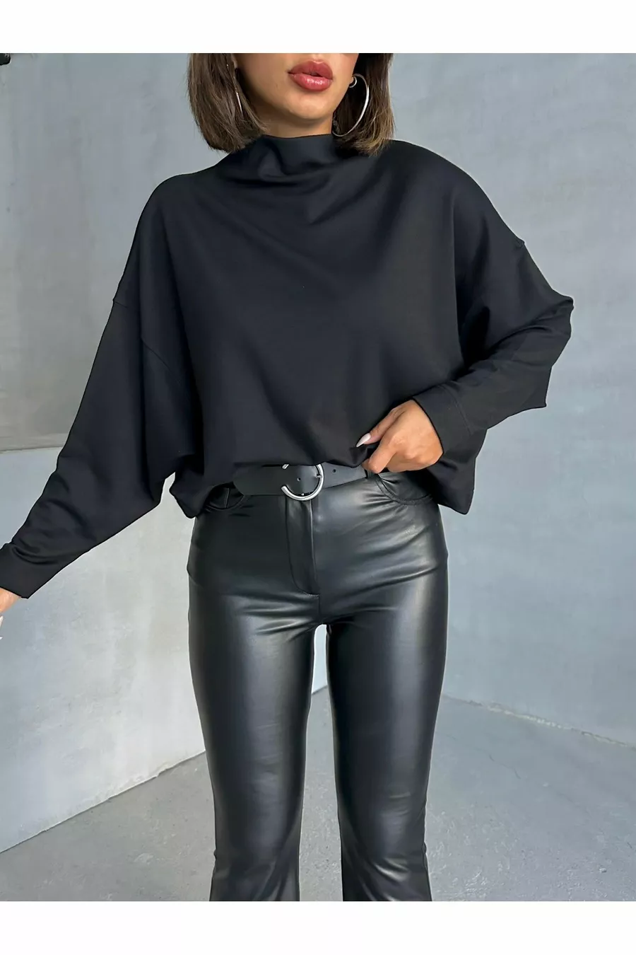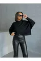 Damen Schwarze Interlock-Stoff Bluse mit Stehkragen und Fledermausärmeln