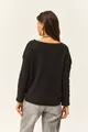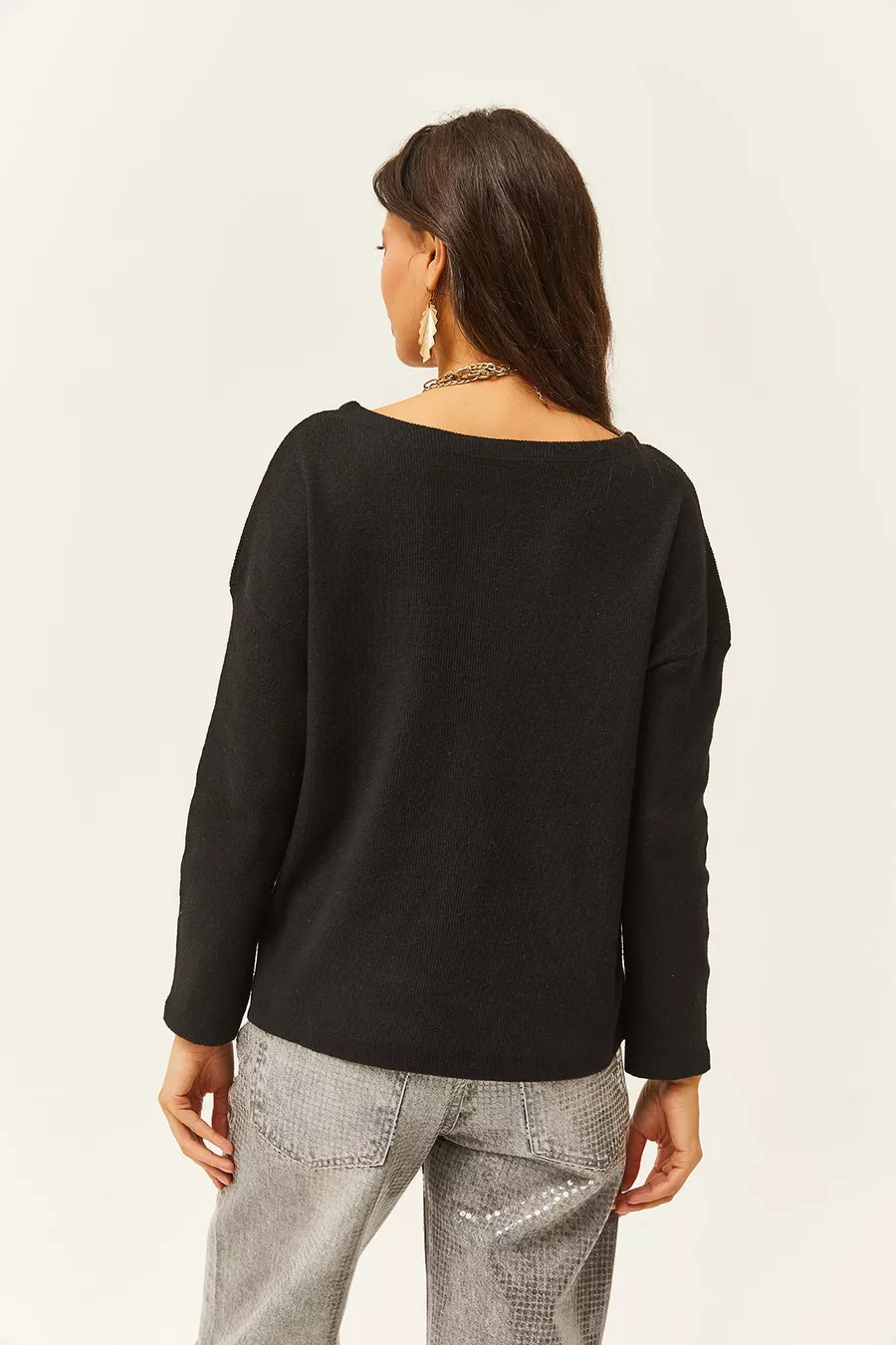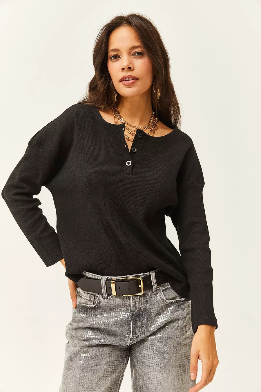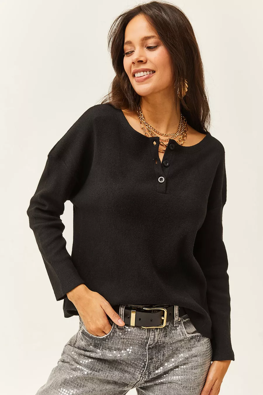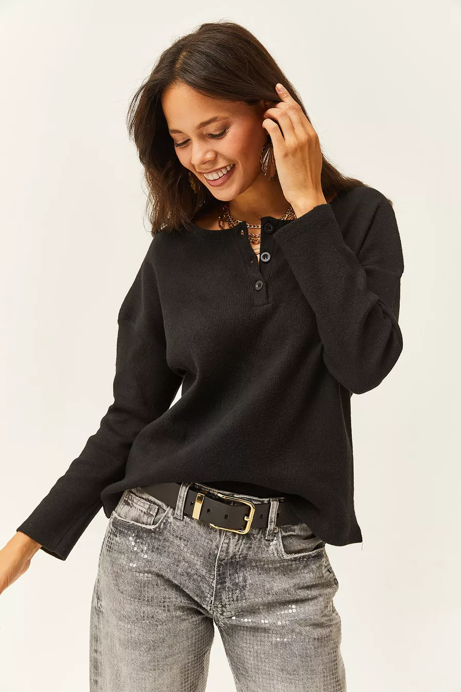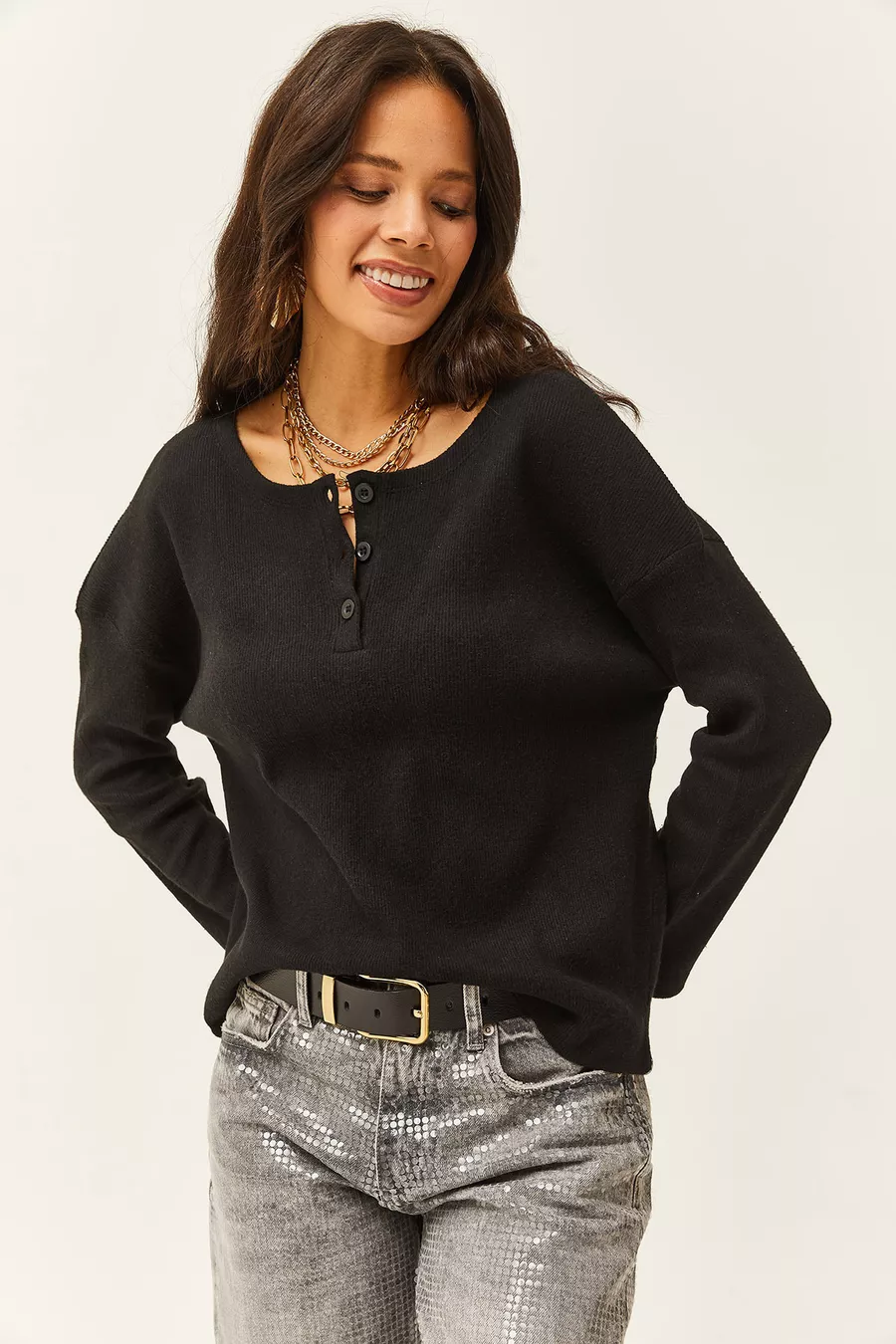 Damen Schwarzer Knopf-Strickpullover aus Fleece, locker sitzend