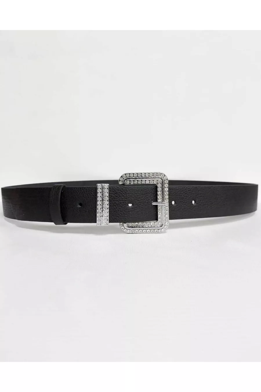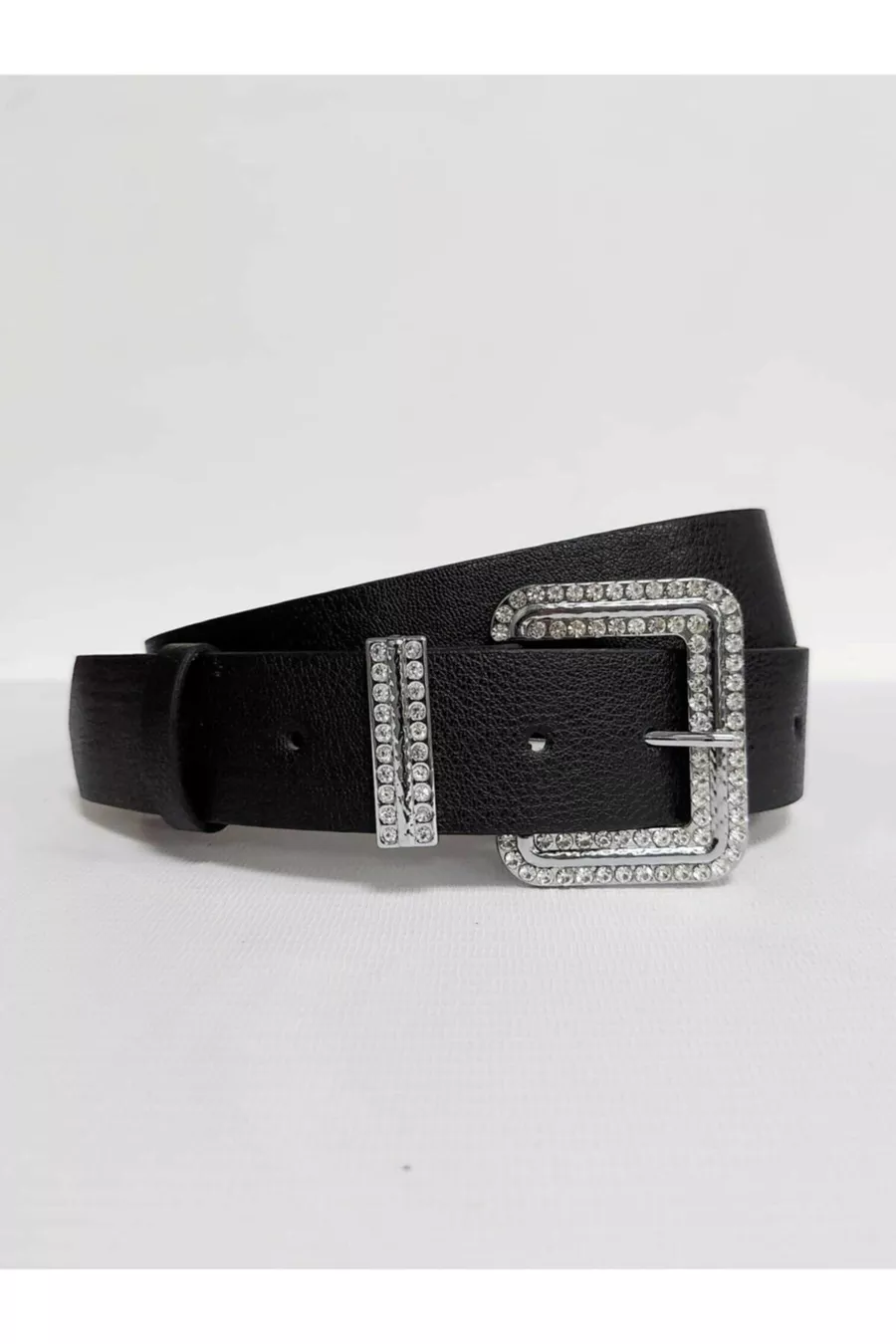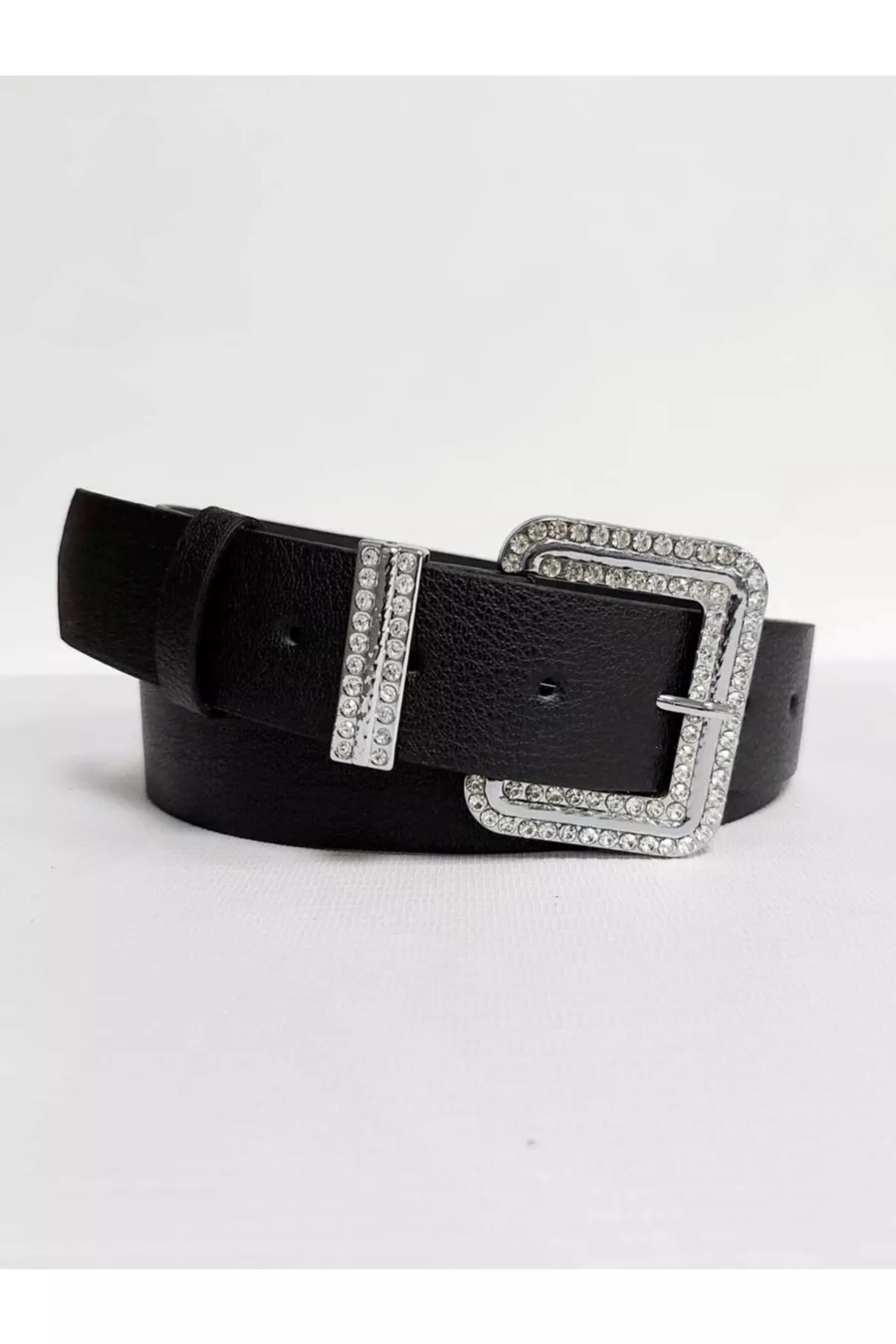 Damen Schwarzer Gürtel mit Silberner Schnalle und Steinen