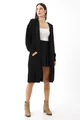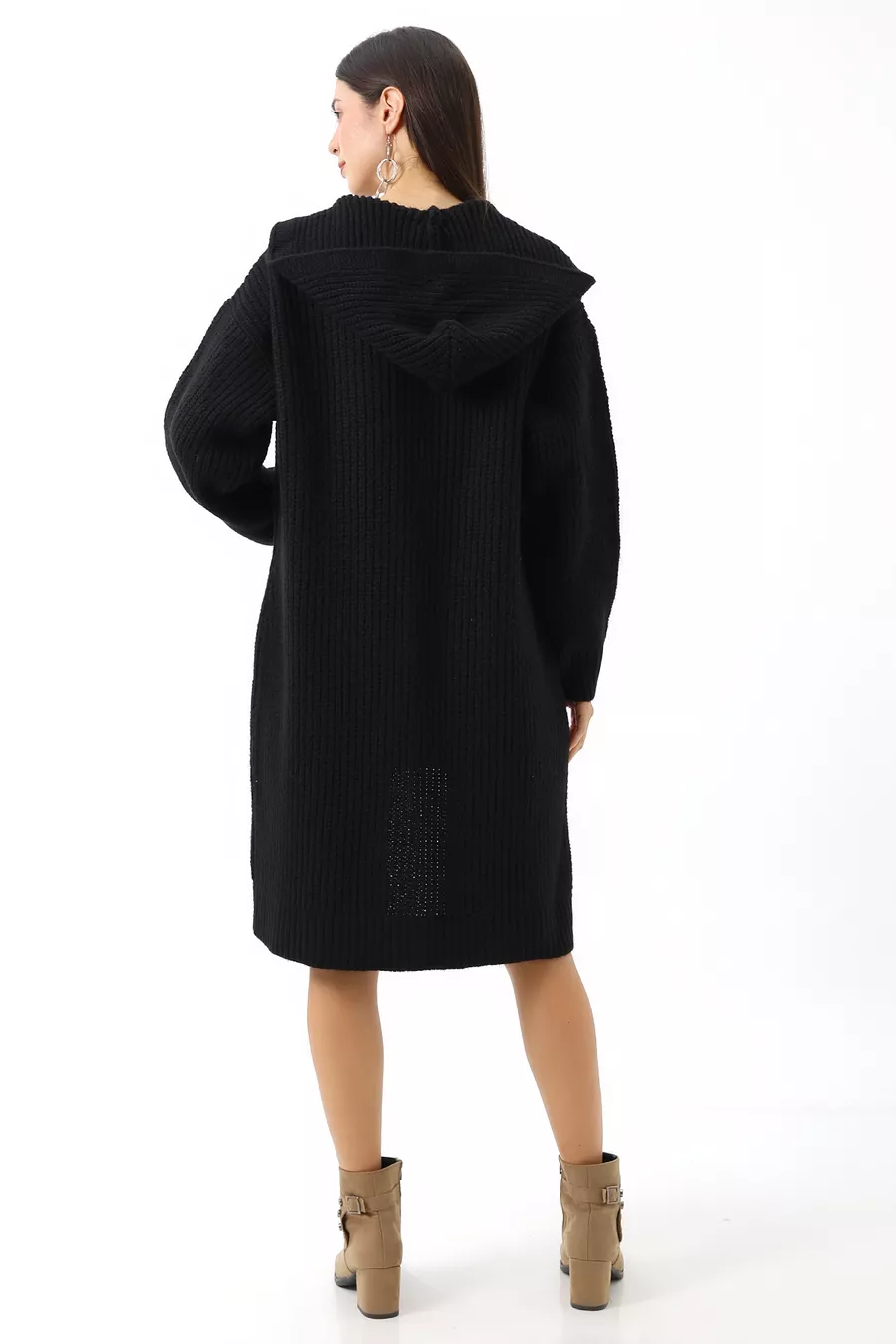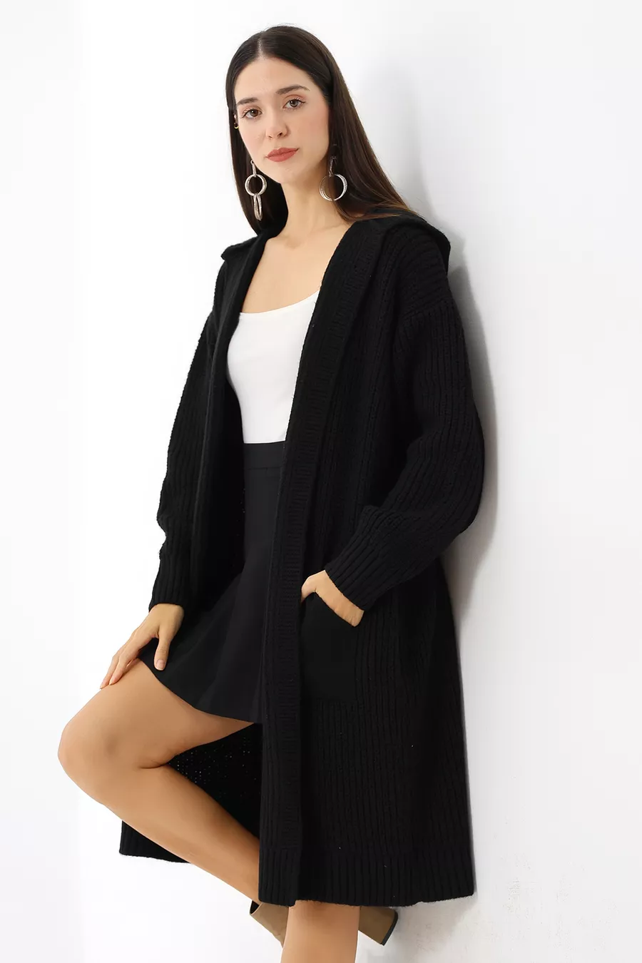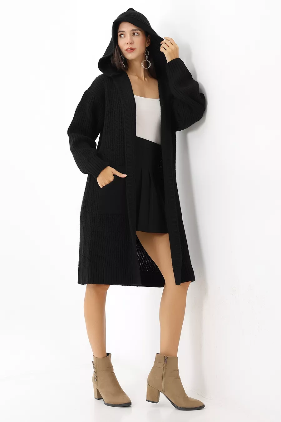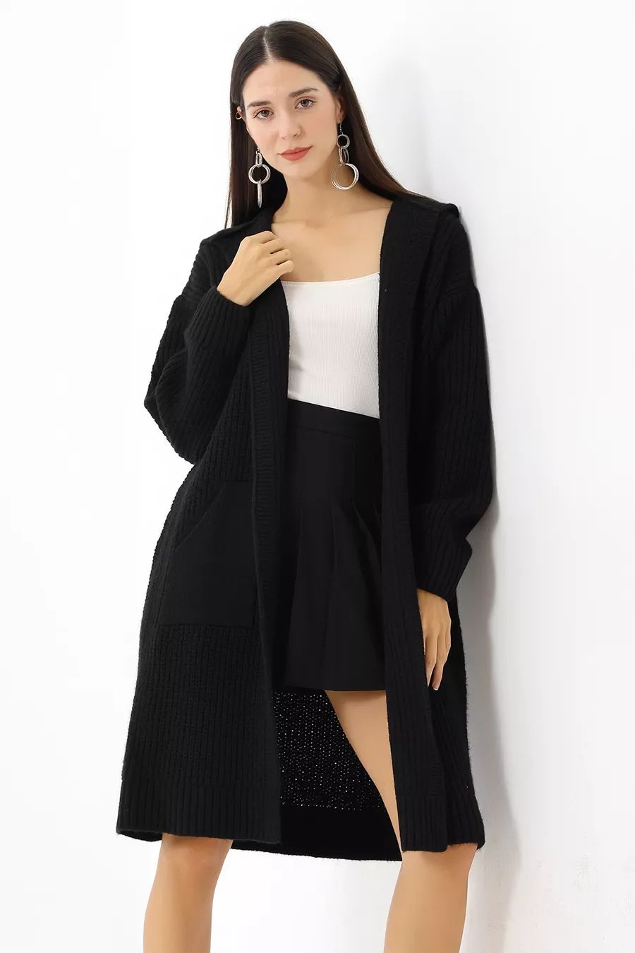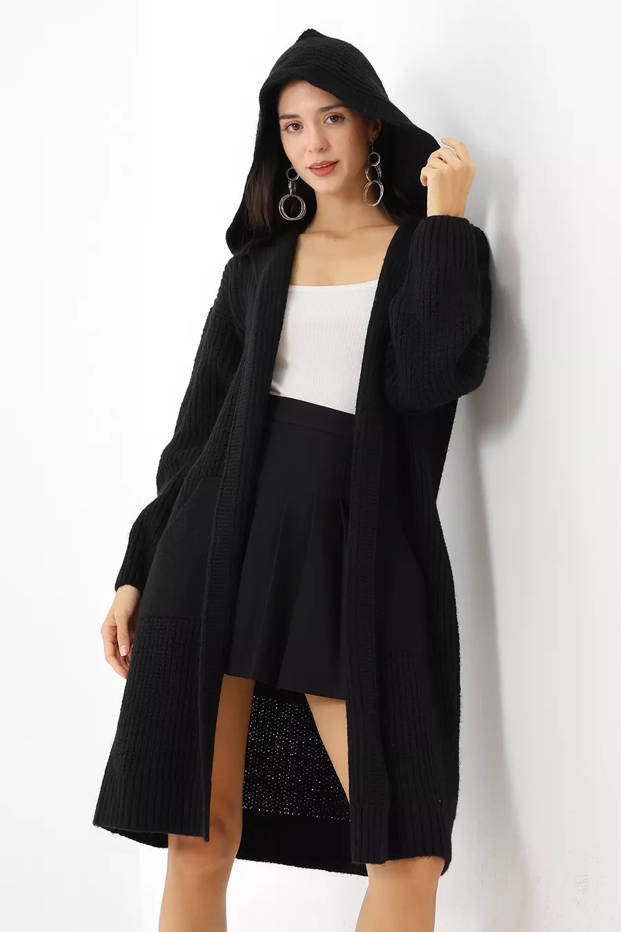 Damen Schwarzer Kapuzen-Oversize-Lässiger Langer Strickcardigan mit Taschen