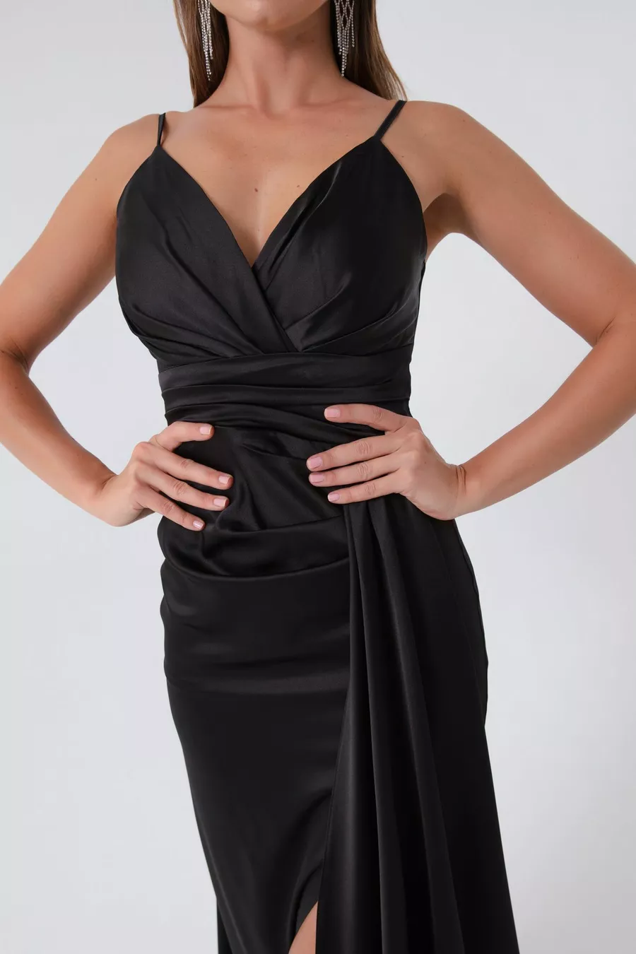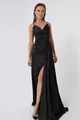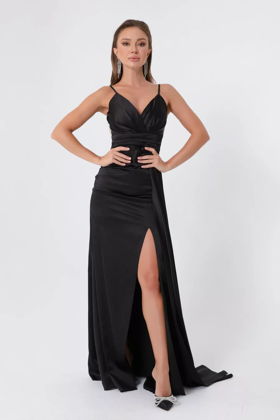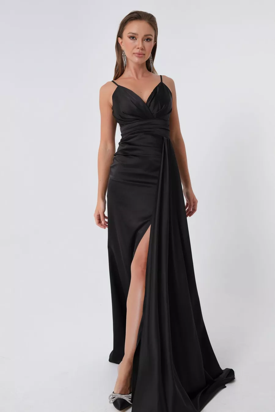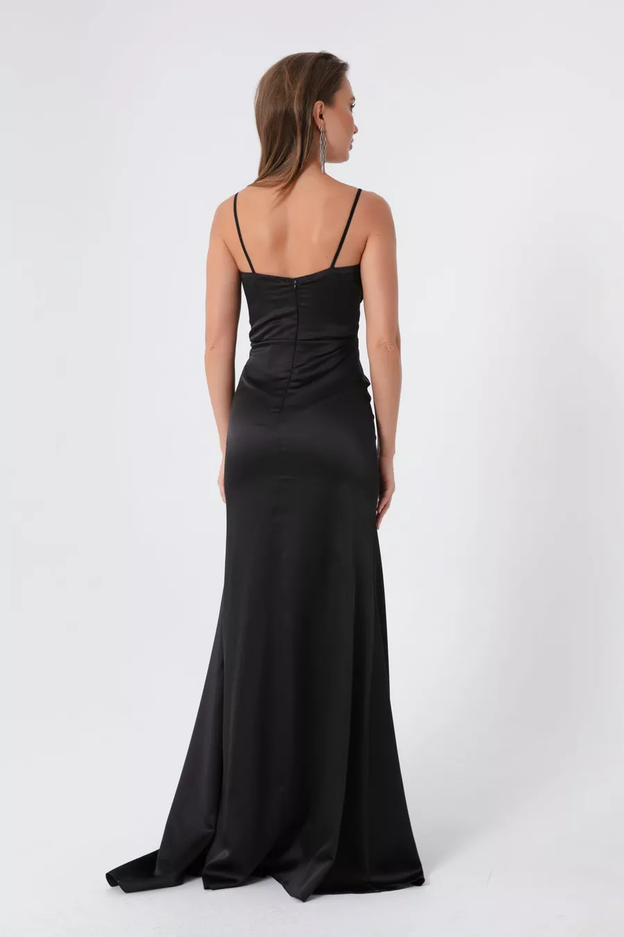 Damen Schwarzes Träger-Langes Satin-Abendkleid & Abschlusskleid