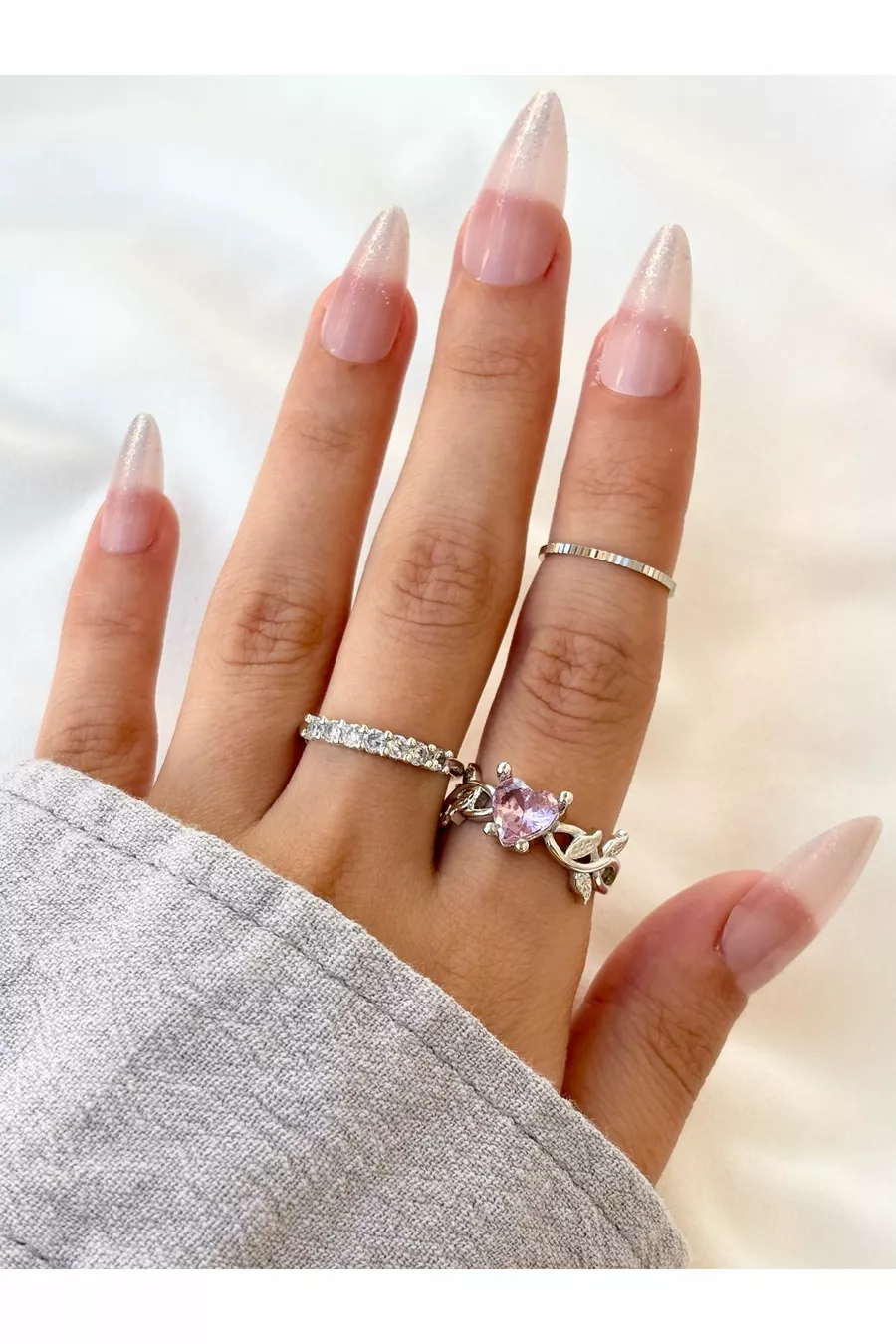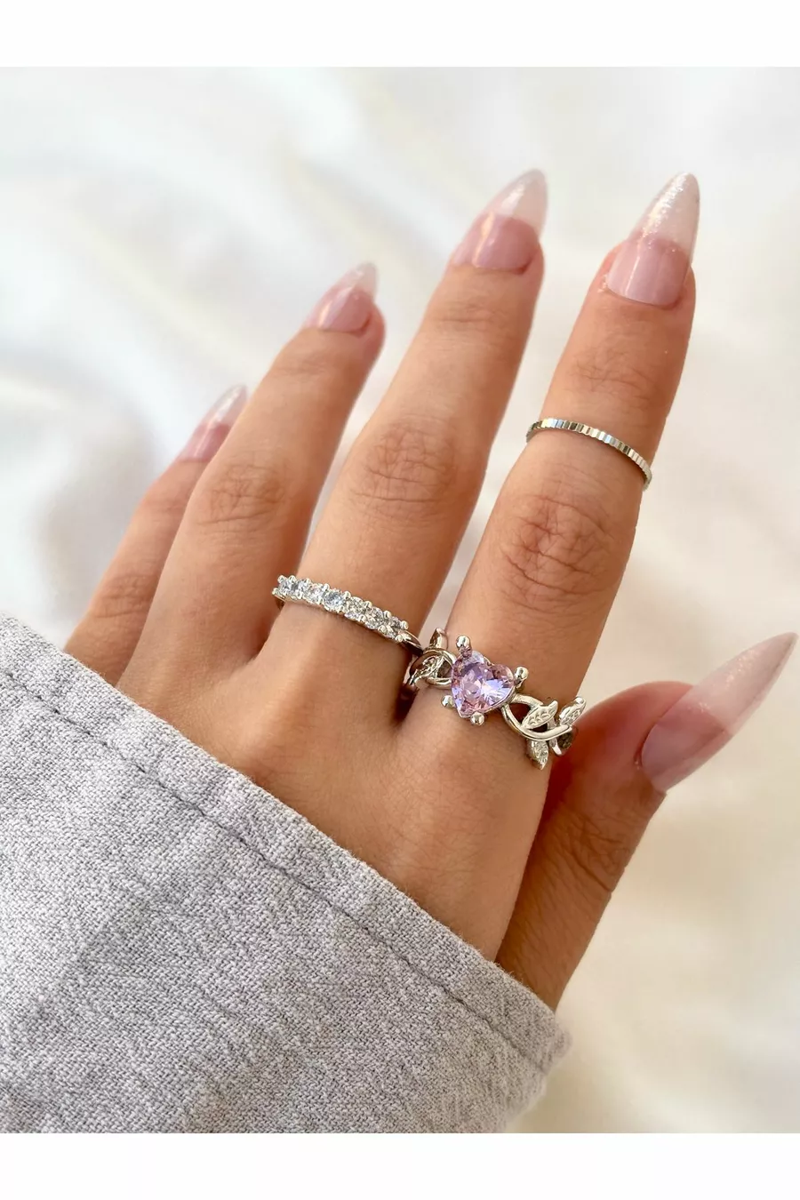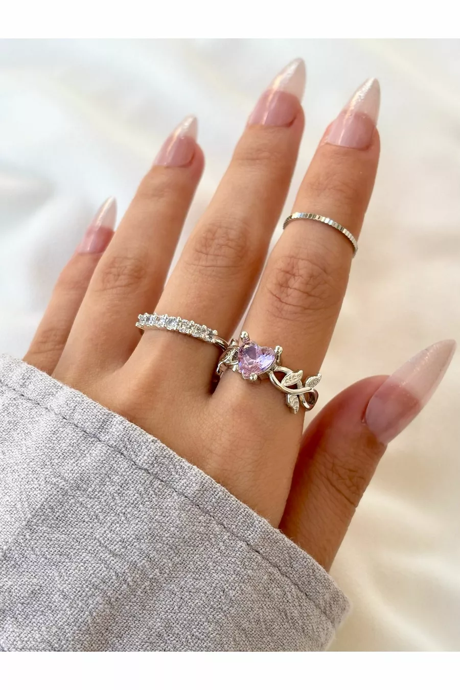 Damen Silberfarbe 3er-Set Rosa Stein Blatt- und Herz-Stein-Daumenring