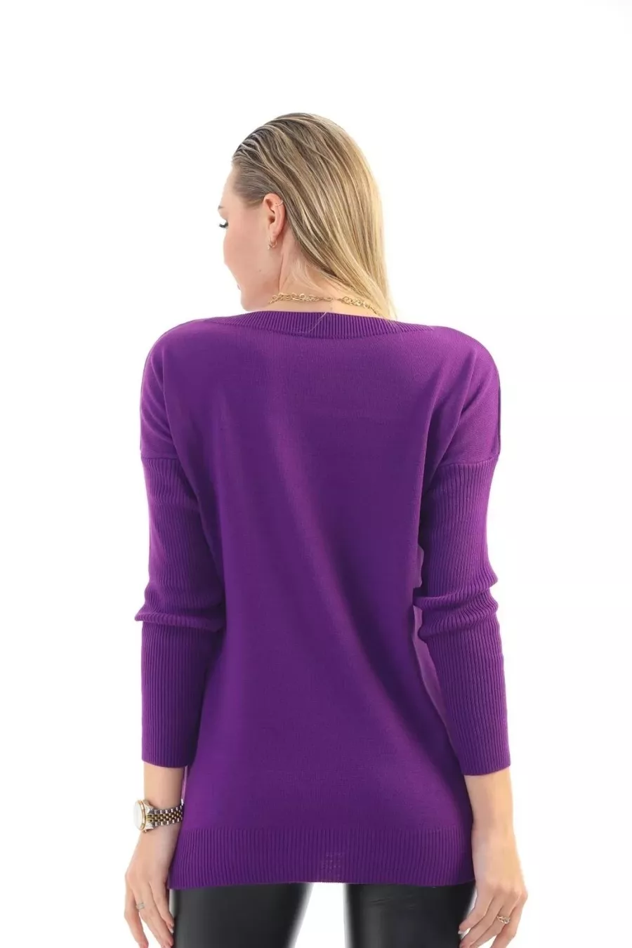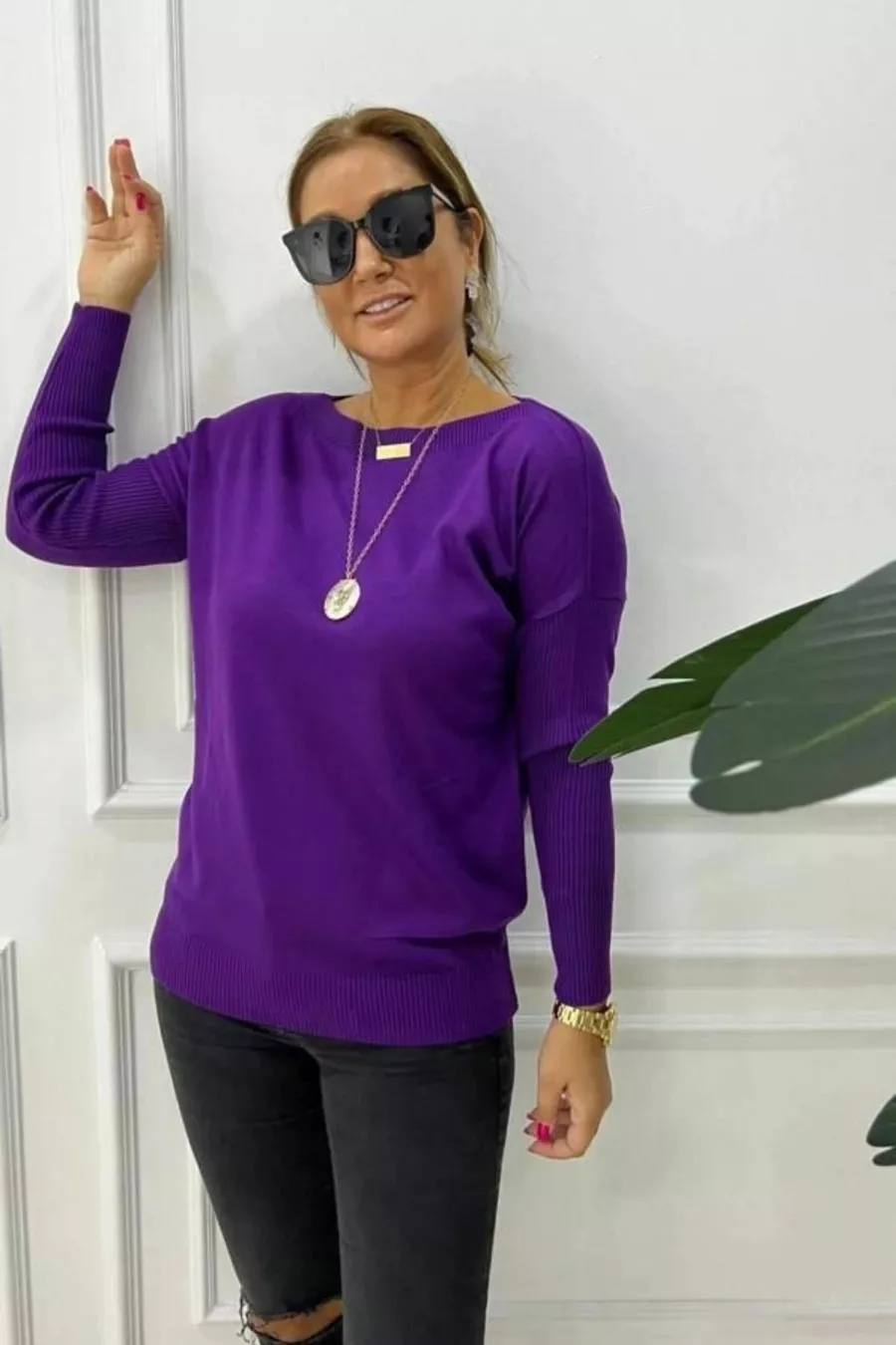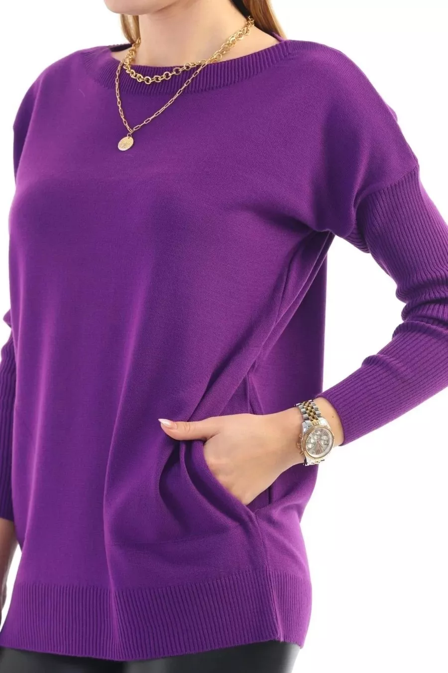 Damen-Strickbluse in Lila mit Rundhalsausschnitt, seitlichen Taschen, elastischem, weichem und dehnbarem Material