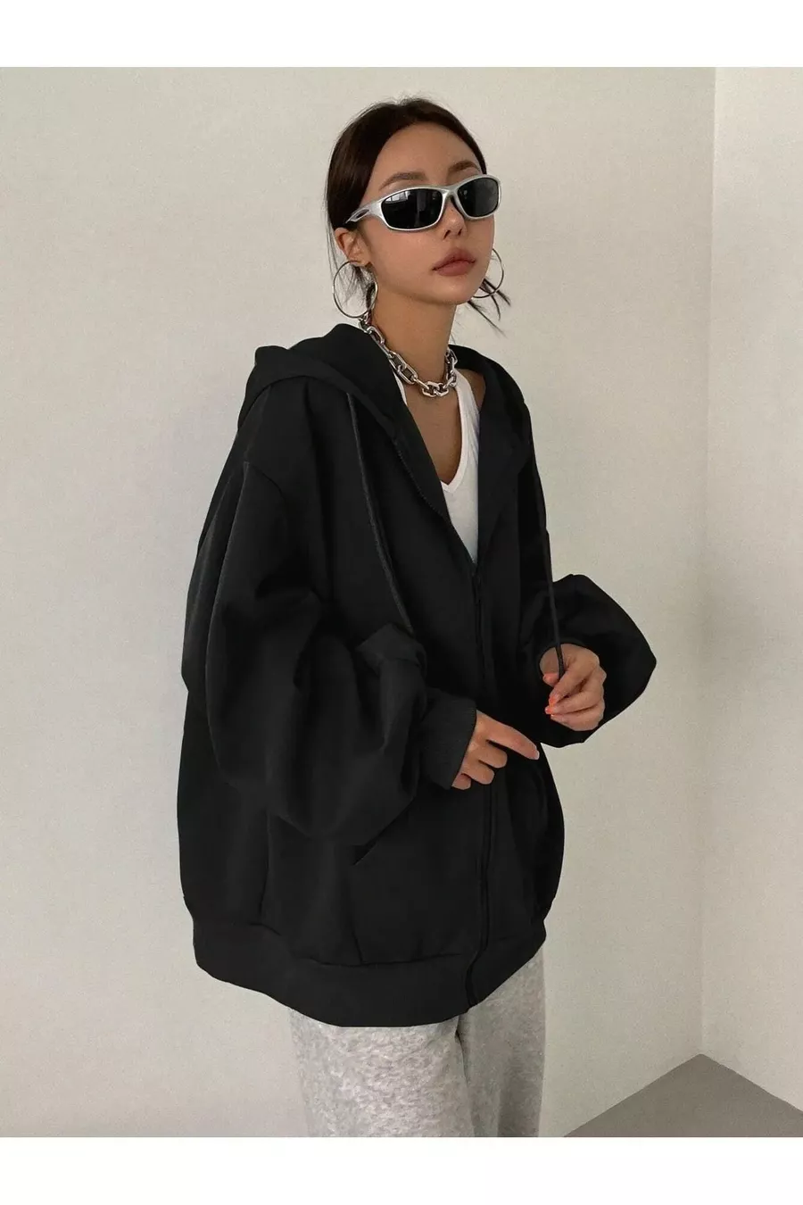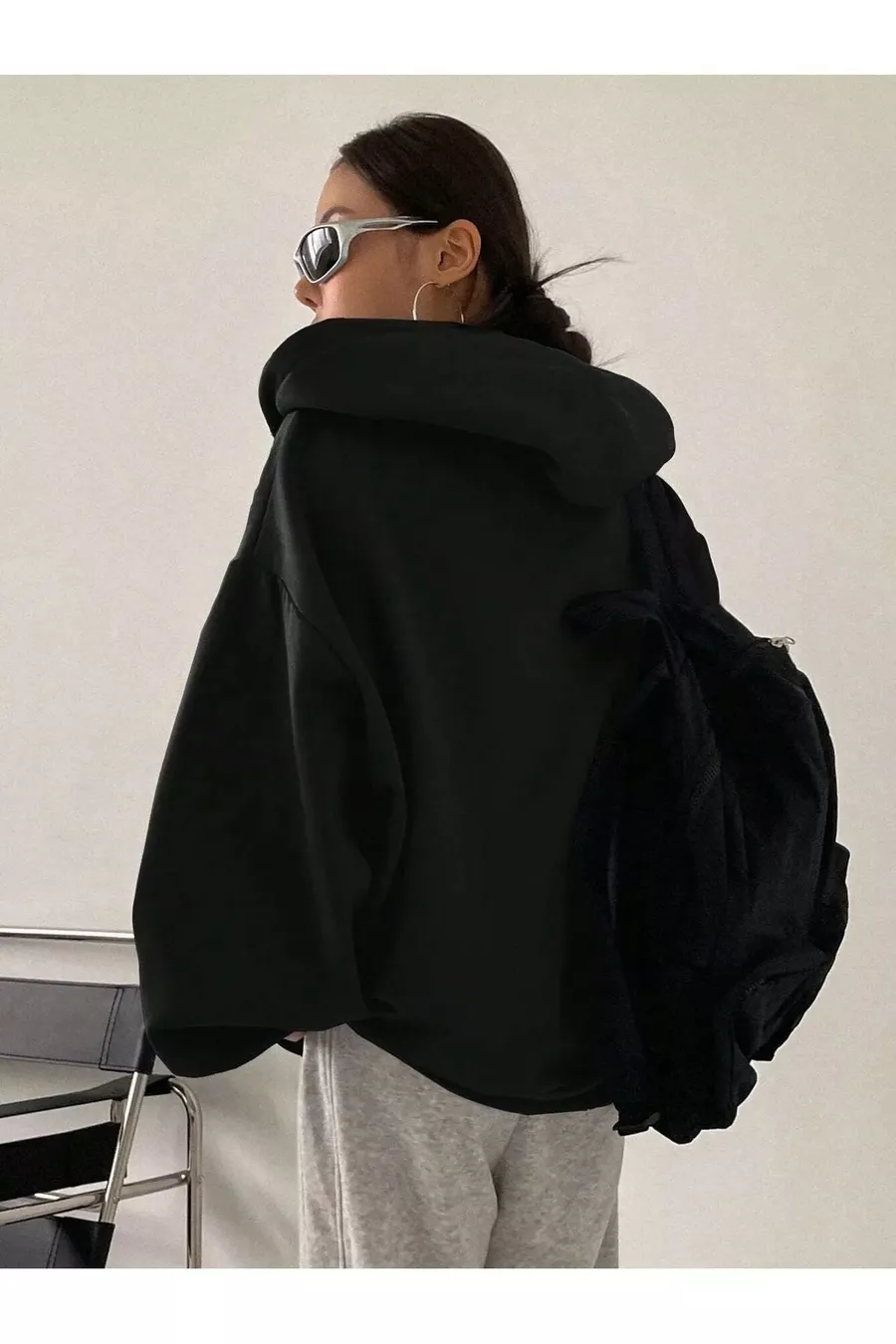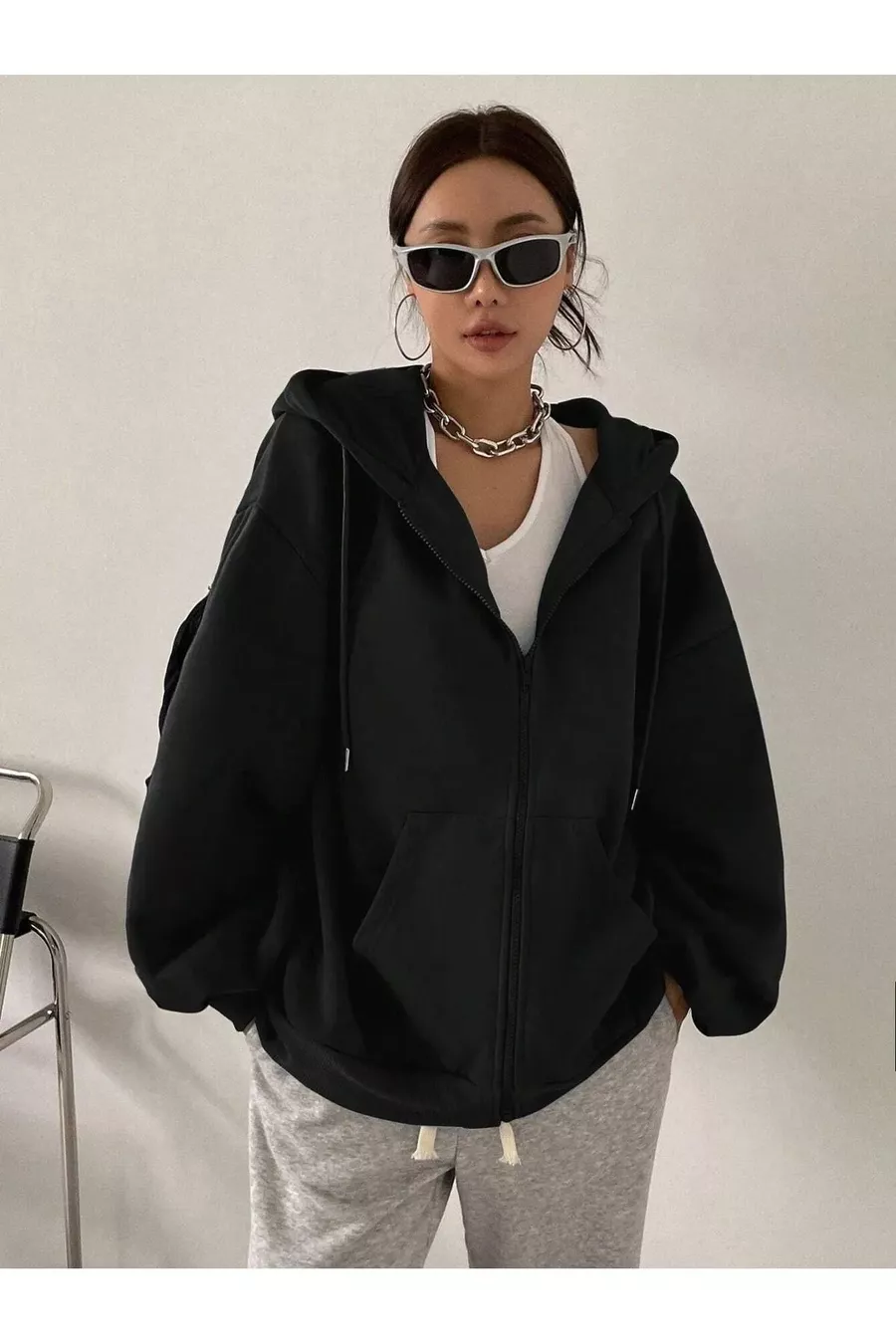 Damen Strickjacke mit schwarzer Kapuze, Reißverschluss und Ballonärmeln