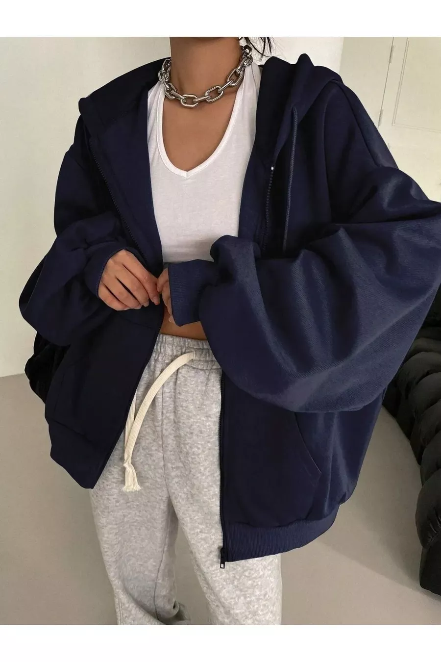 Damen Strickjacke mit Kapuze, Reißverschluss und Ballonärmeln in Marineblau