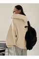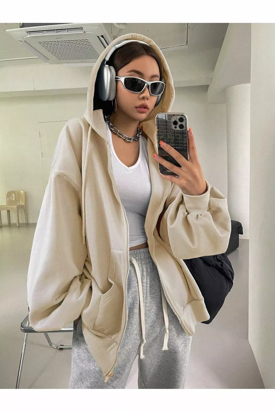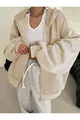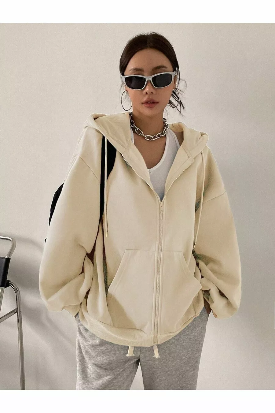 Damen Strickjacke mit Kapuze, Reißverschluss und Ballonärmeln in Beige