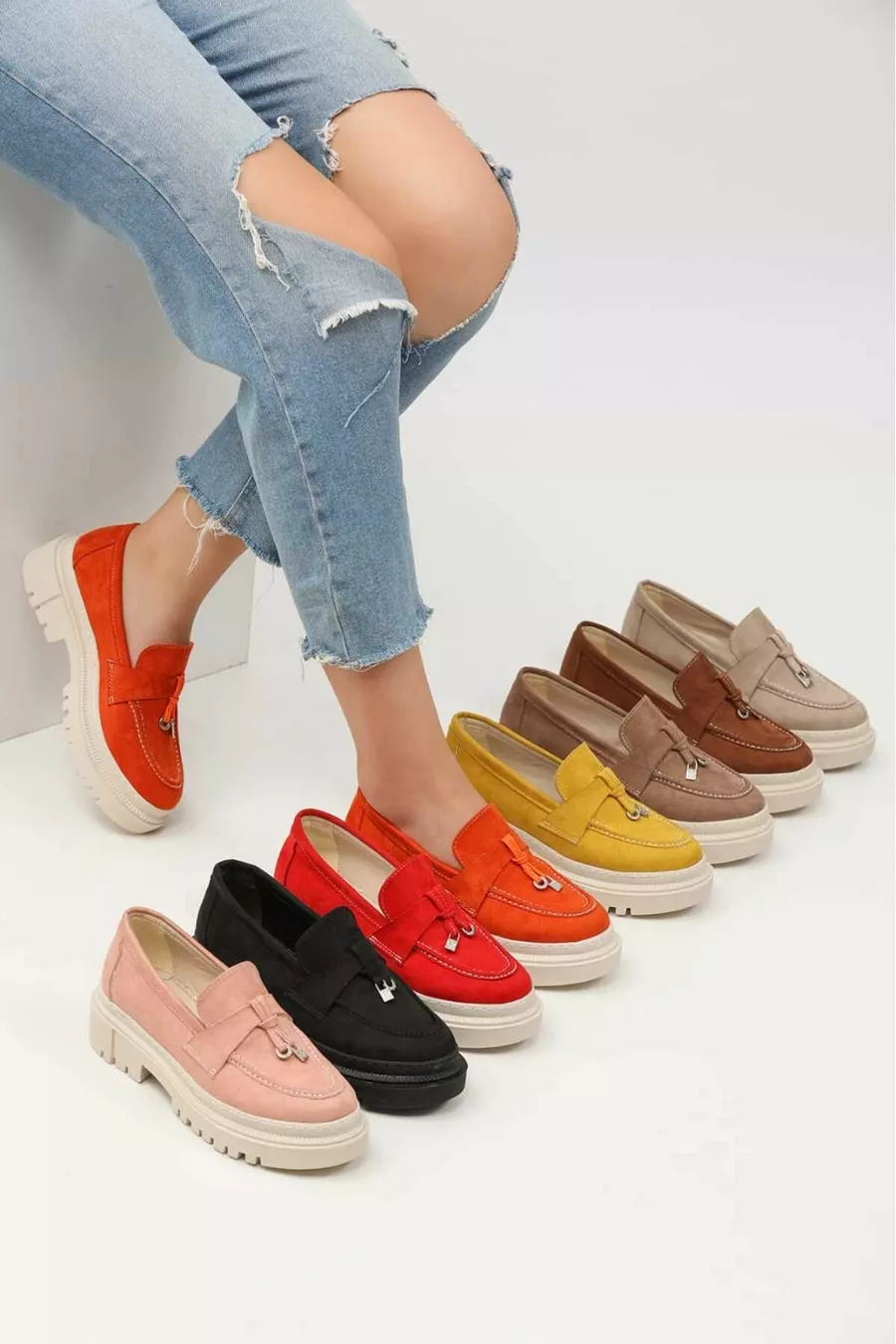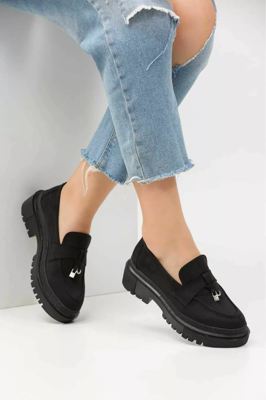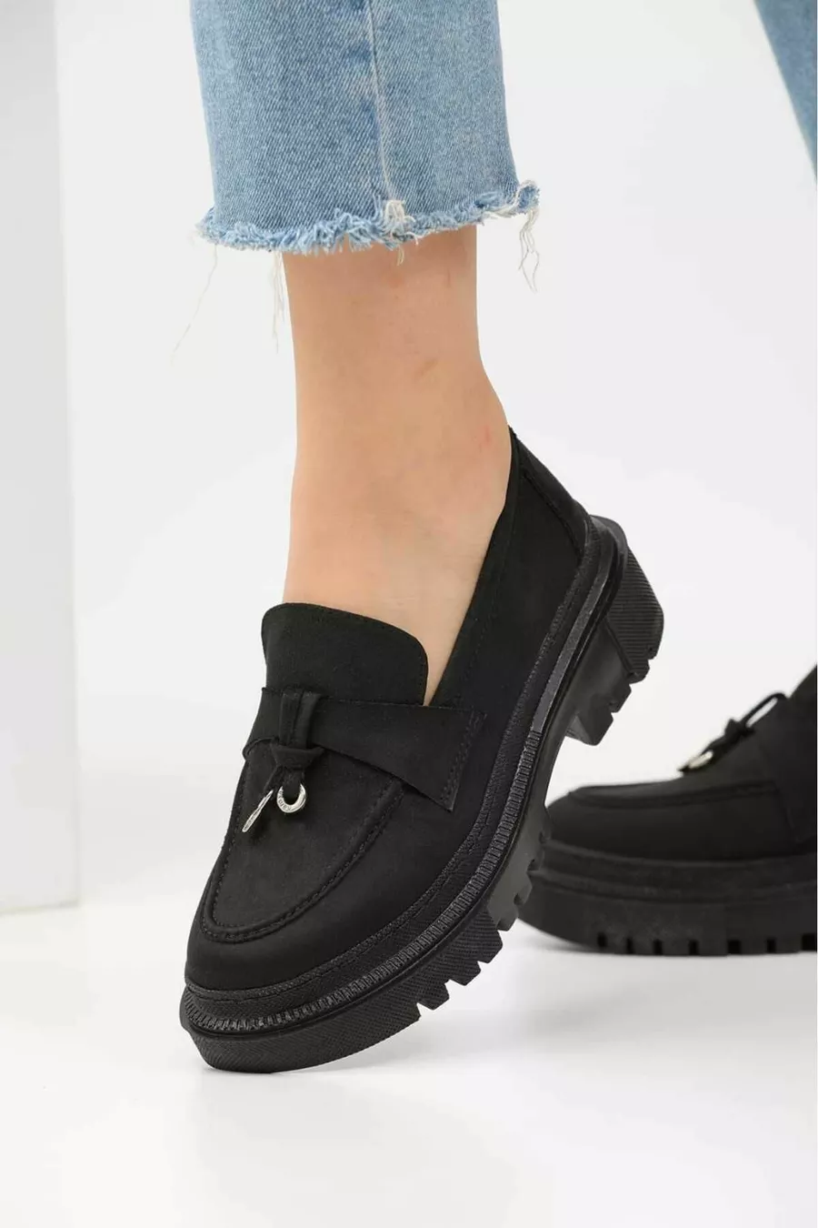 Damen Thick Sole Loafer Loafer Wildleder Schwarz