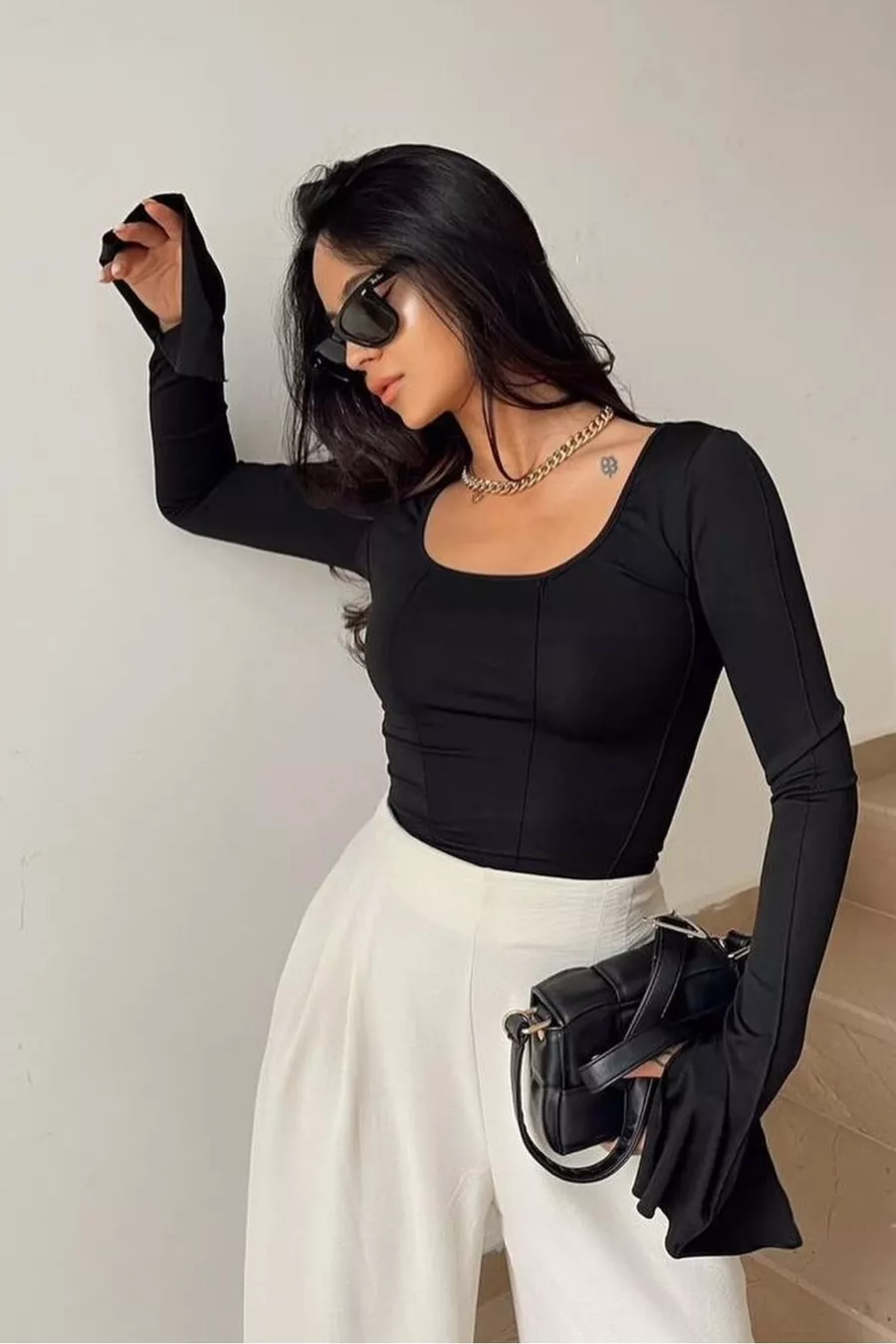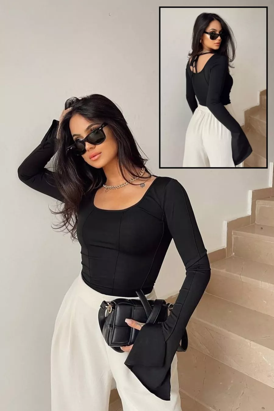 Damenbluse mit langen Ärmeln, Vichy-Karomuster, Rüschenärmeln, Rückenausschnitt und Nahtdetails
