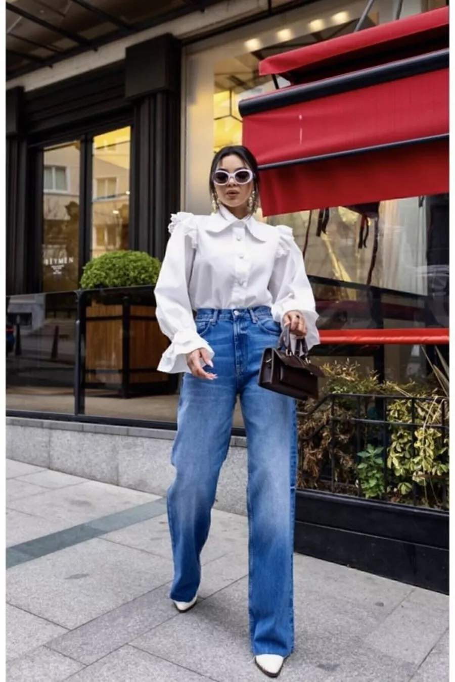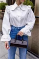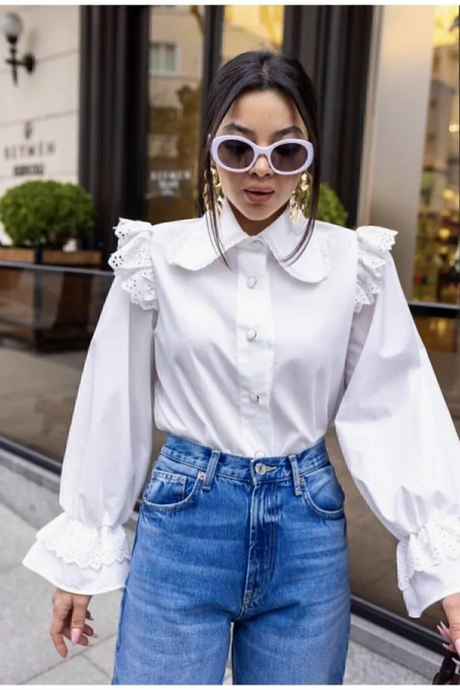 Damenbluse mit weißer Spitze, Rüschen und Bebe-Kragen