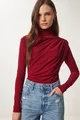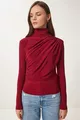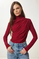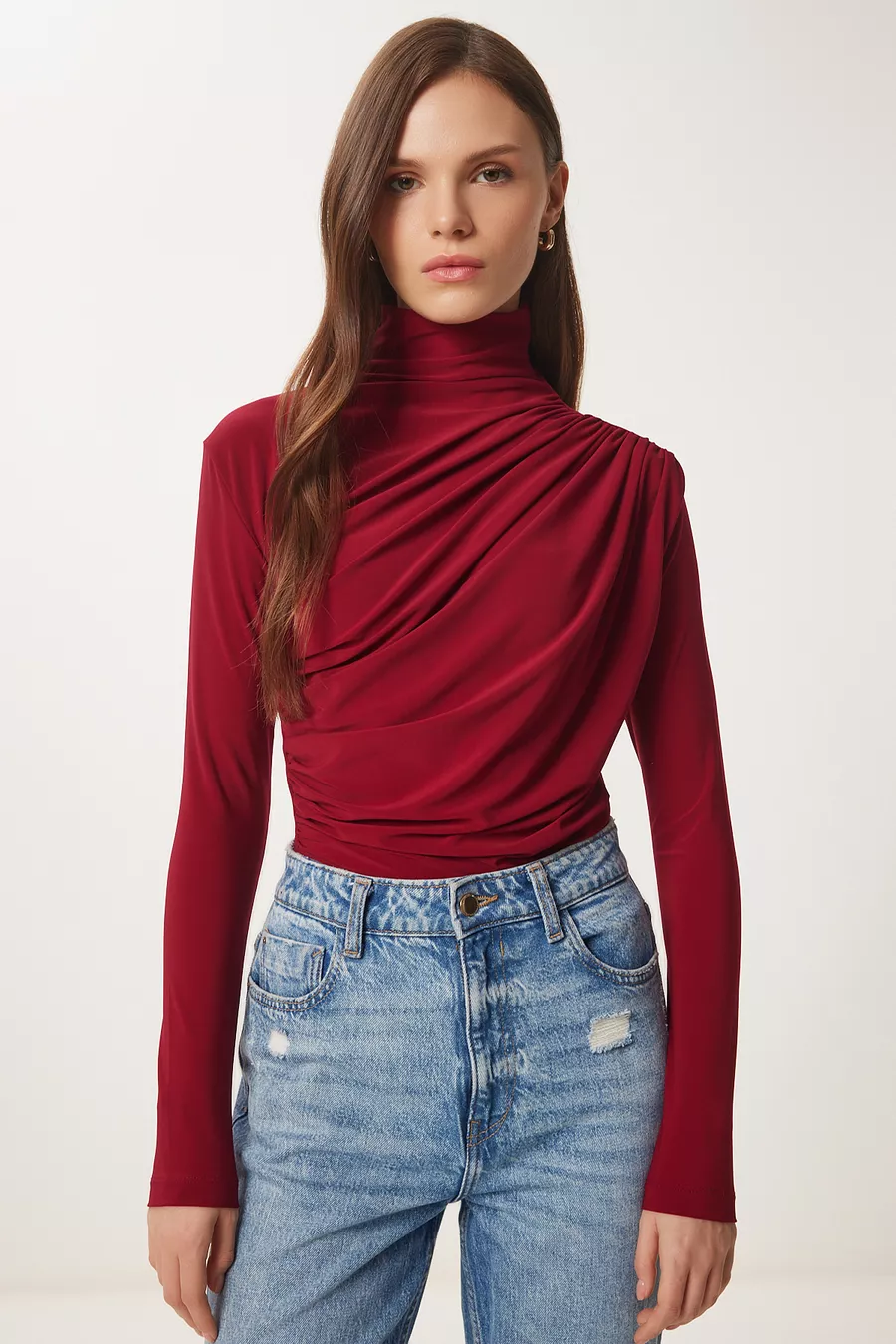 Damenbluse Sandy mit Stehkragen und Bordeaux-Falten-Detail