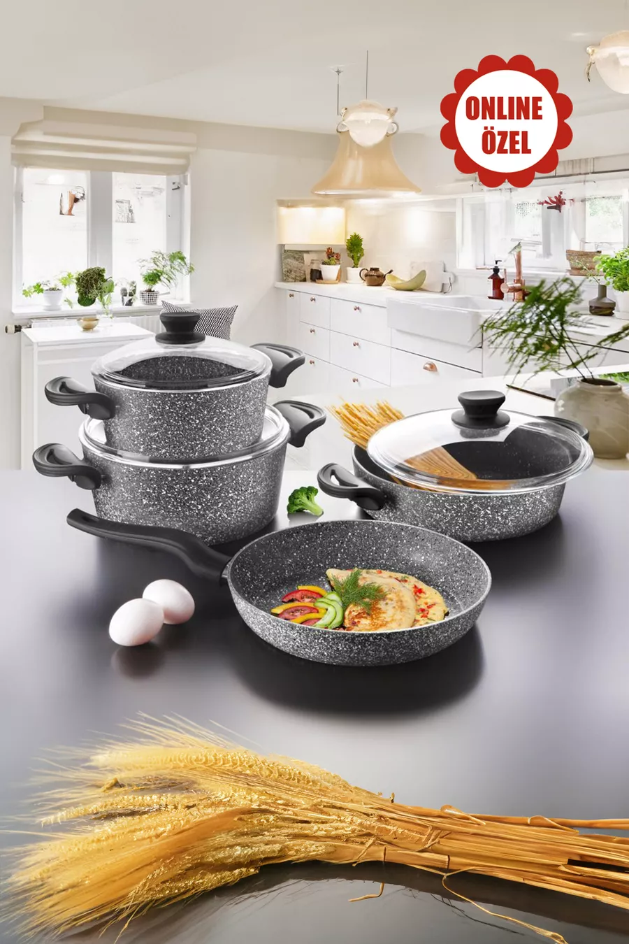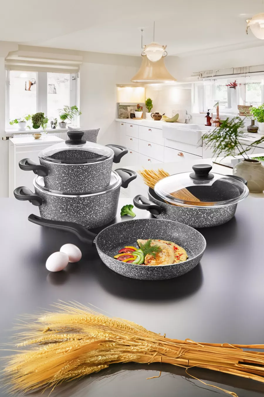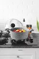 Farbe: Grau Größe/Abmessung: 26 cm Volumen: 2,3 L Eigenschaft: Antihaft-Boden Außenmaterial: Granit Innenmaterial: Granit Anzahl der Teile: 7 Herkunft: TR Pflegehinweise (für Lebensmittelkontakt): Spülmaschinengeeignet Lebensmittelsymbol: Ja Material: Granit