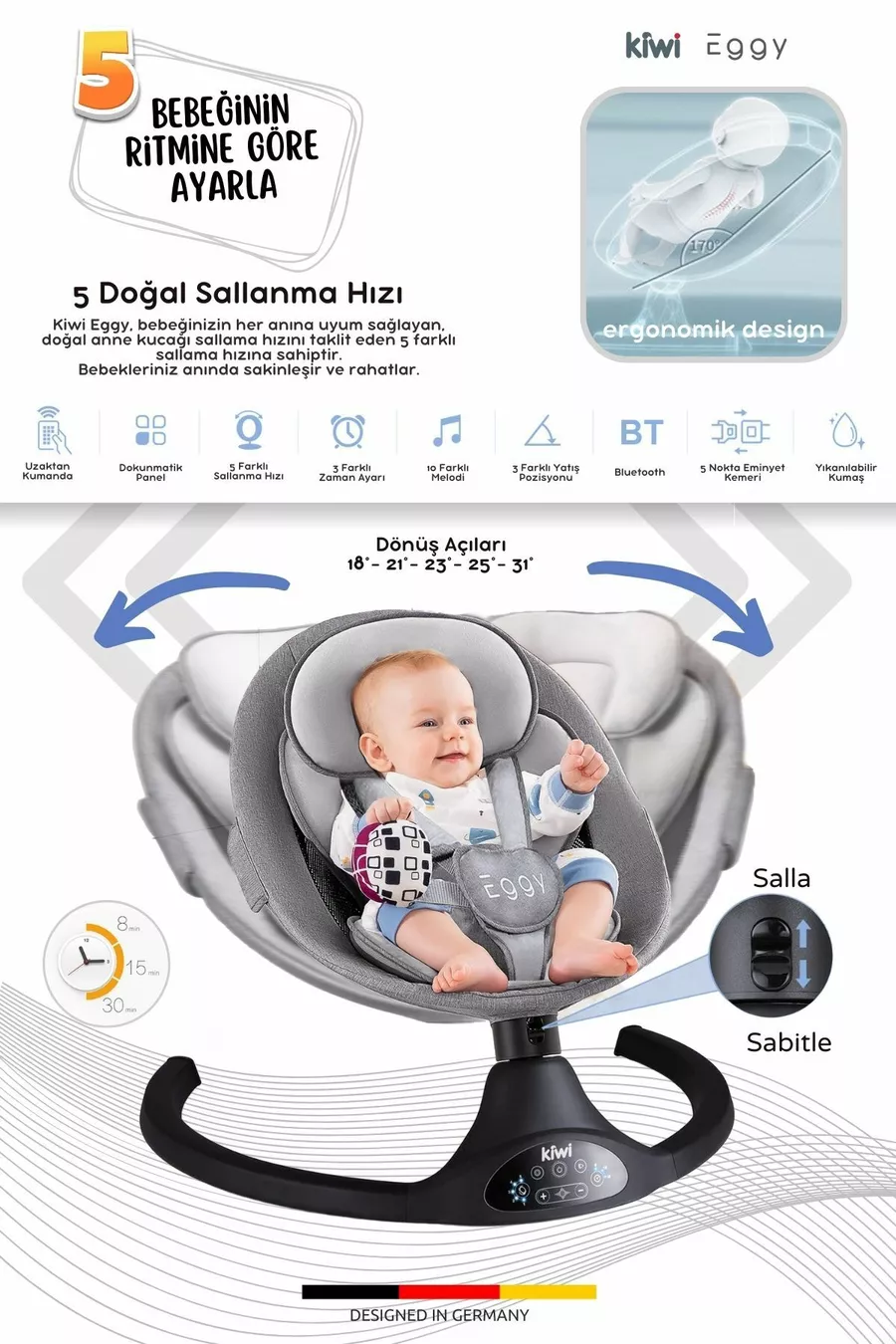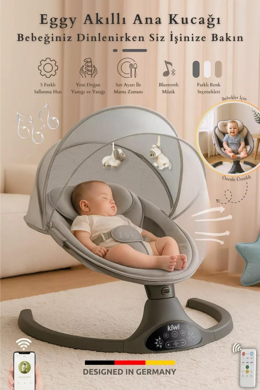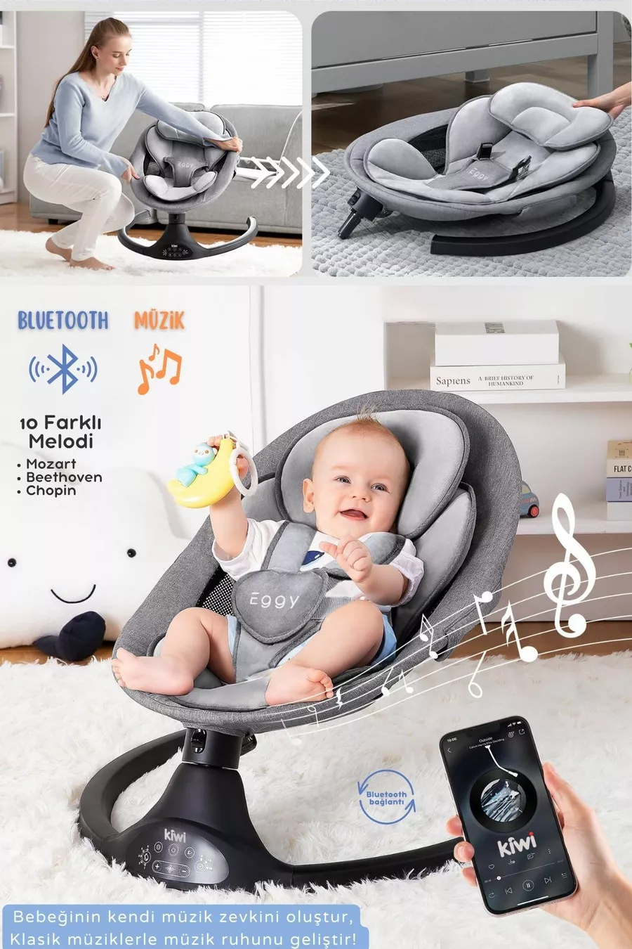 Eggy Plus Elektrischer Automatischer Schaukelstuhl für Babys, 5 verschiedene Schaukelgeschwindigkeiten, Spielzeug Silber-Grau