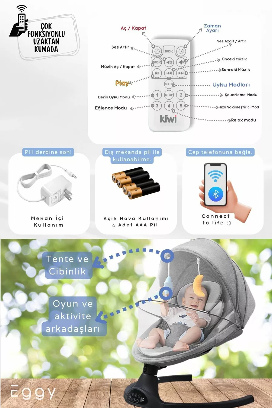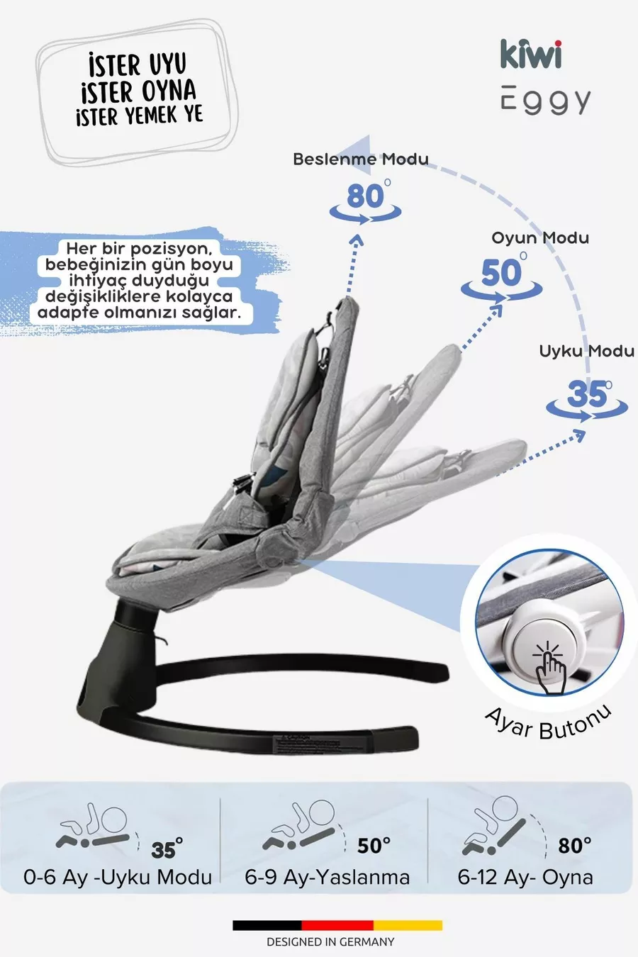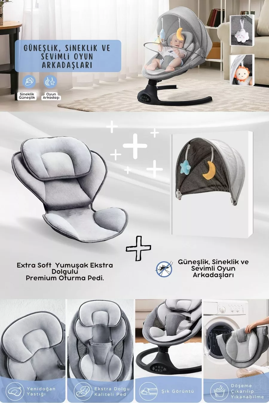 Eggy Plus Elektrischer Automatischer Schaukelstuhl für Babys, 5 verschiedene Schaukelgeschwindigkeiten, Spielzeug Silber-Grau