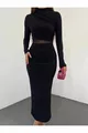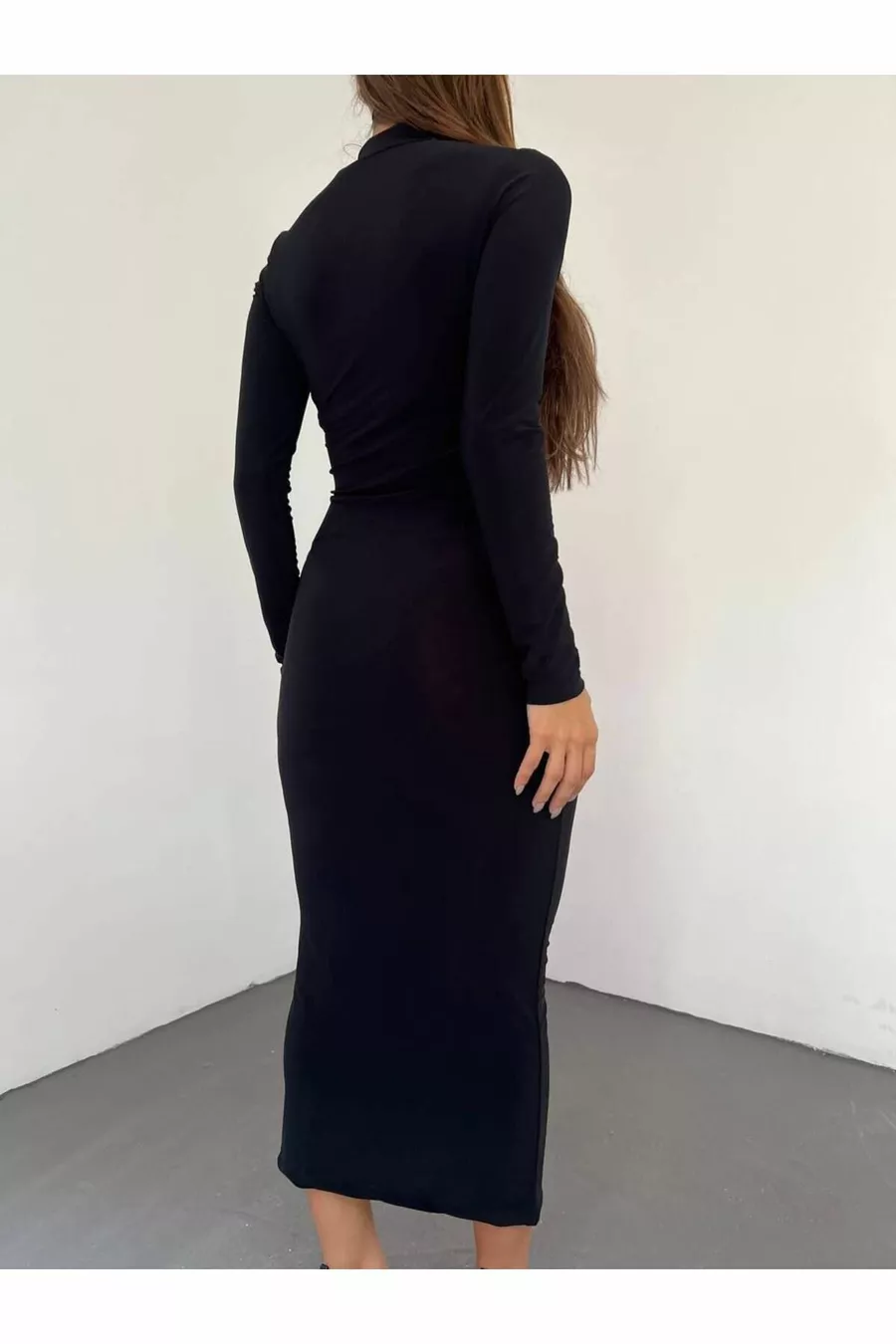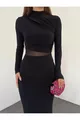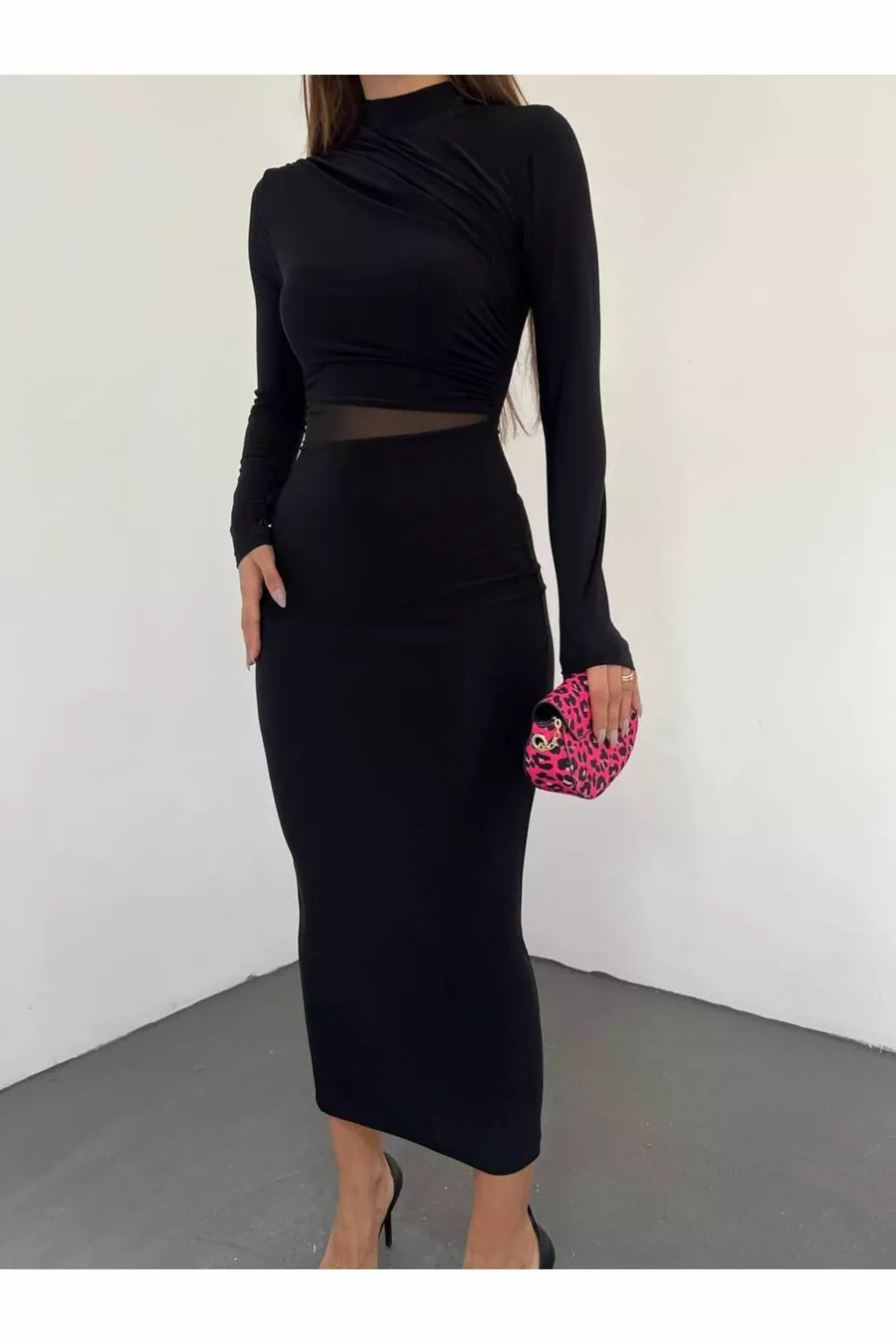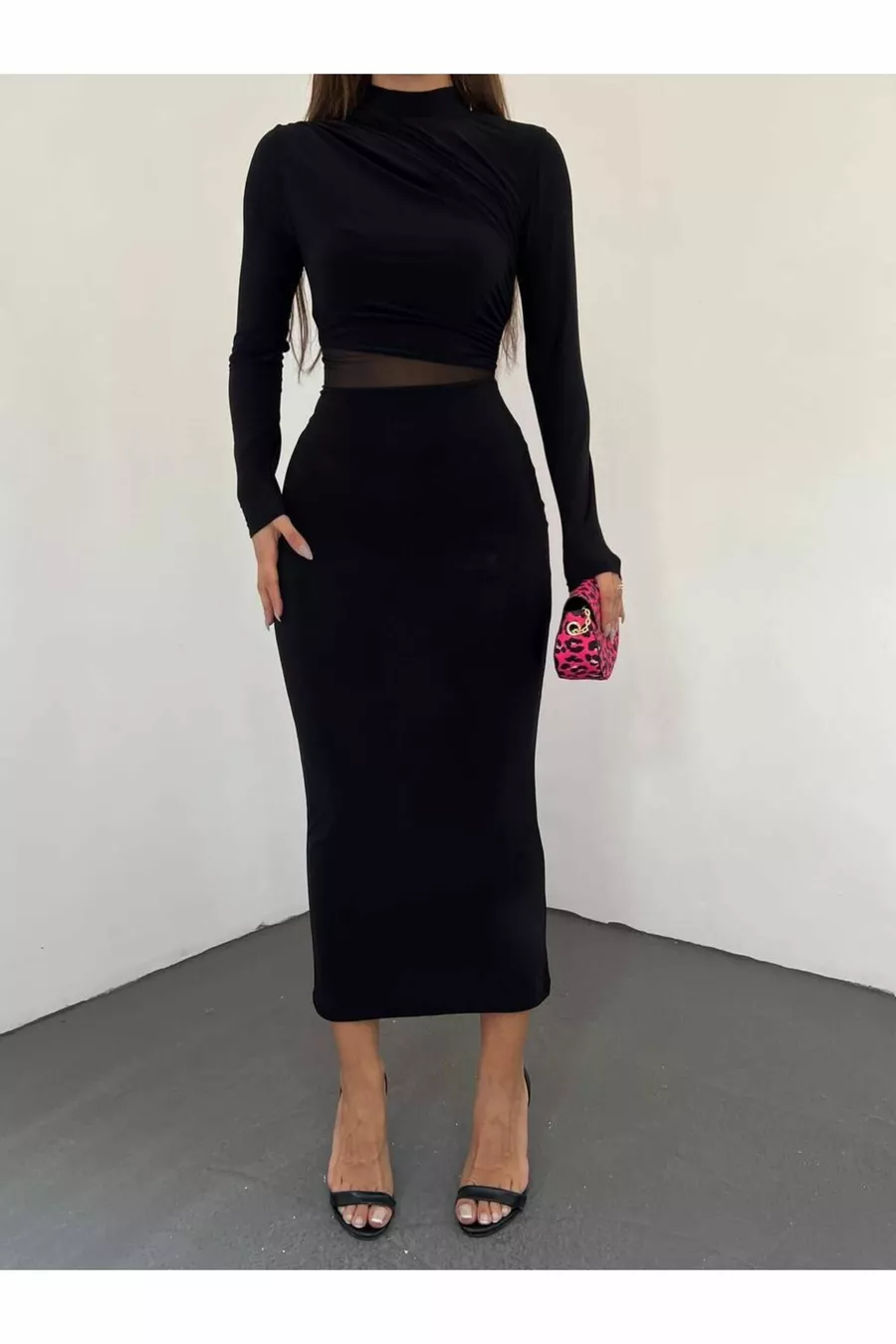 Elastisches Sandy-Gewebe Tüll Dekolleté Detail Stehkragen Langarm Midi Bleistiftkleid