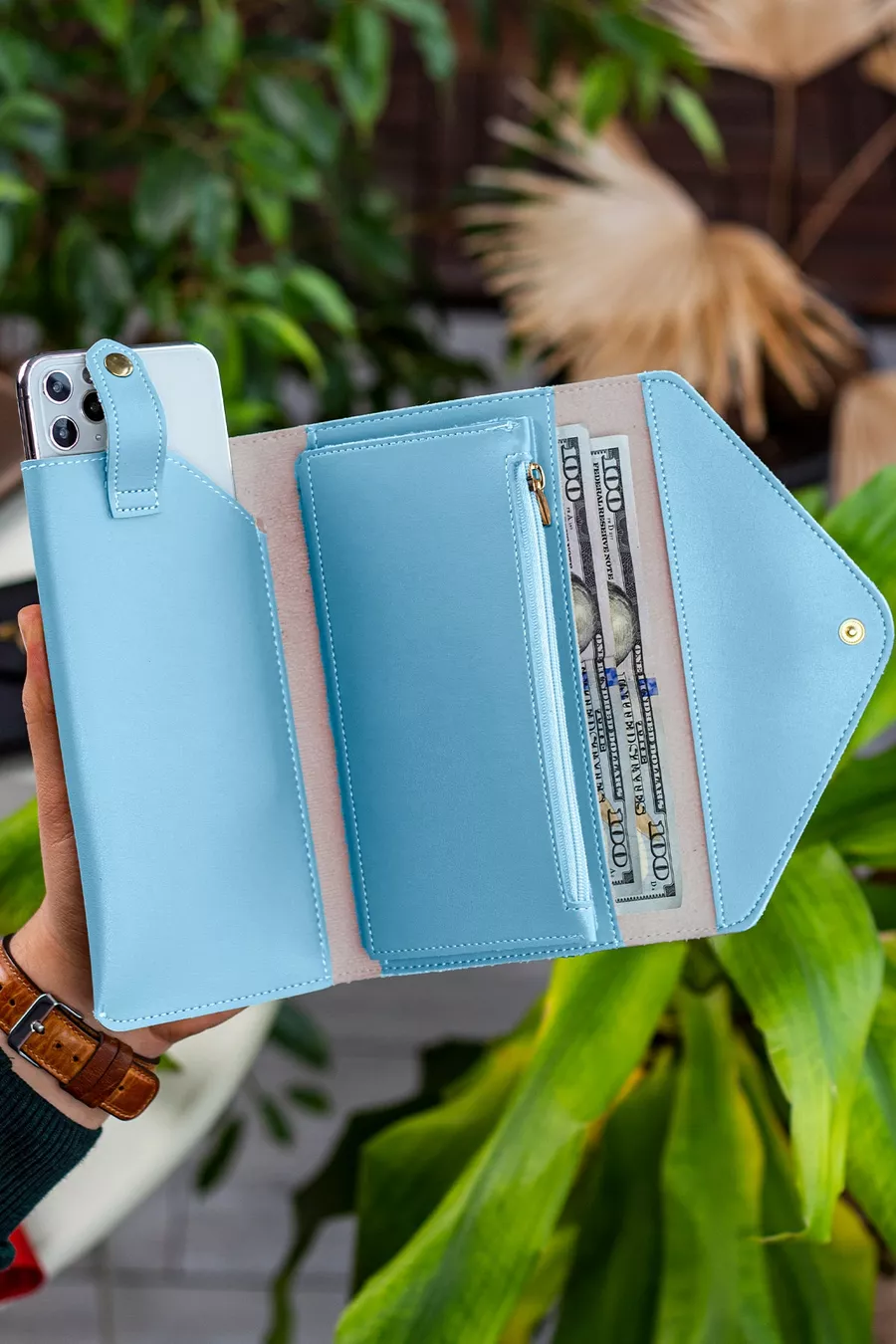 Envelope-Tasche mit Telefon- und Münzfach, Umschlagmodell, Babyblau, Damengeldbörse