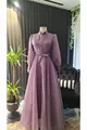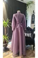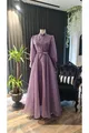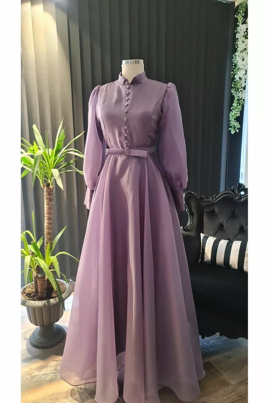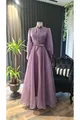Fliederfarbenes, geknöpftes Hijab-Abendkleid mit Prinzessinnenmuster